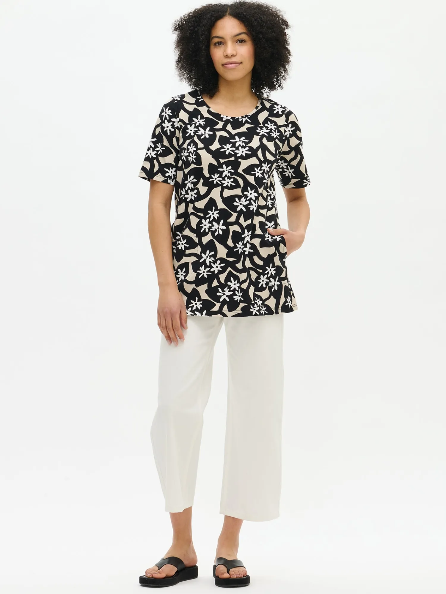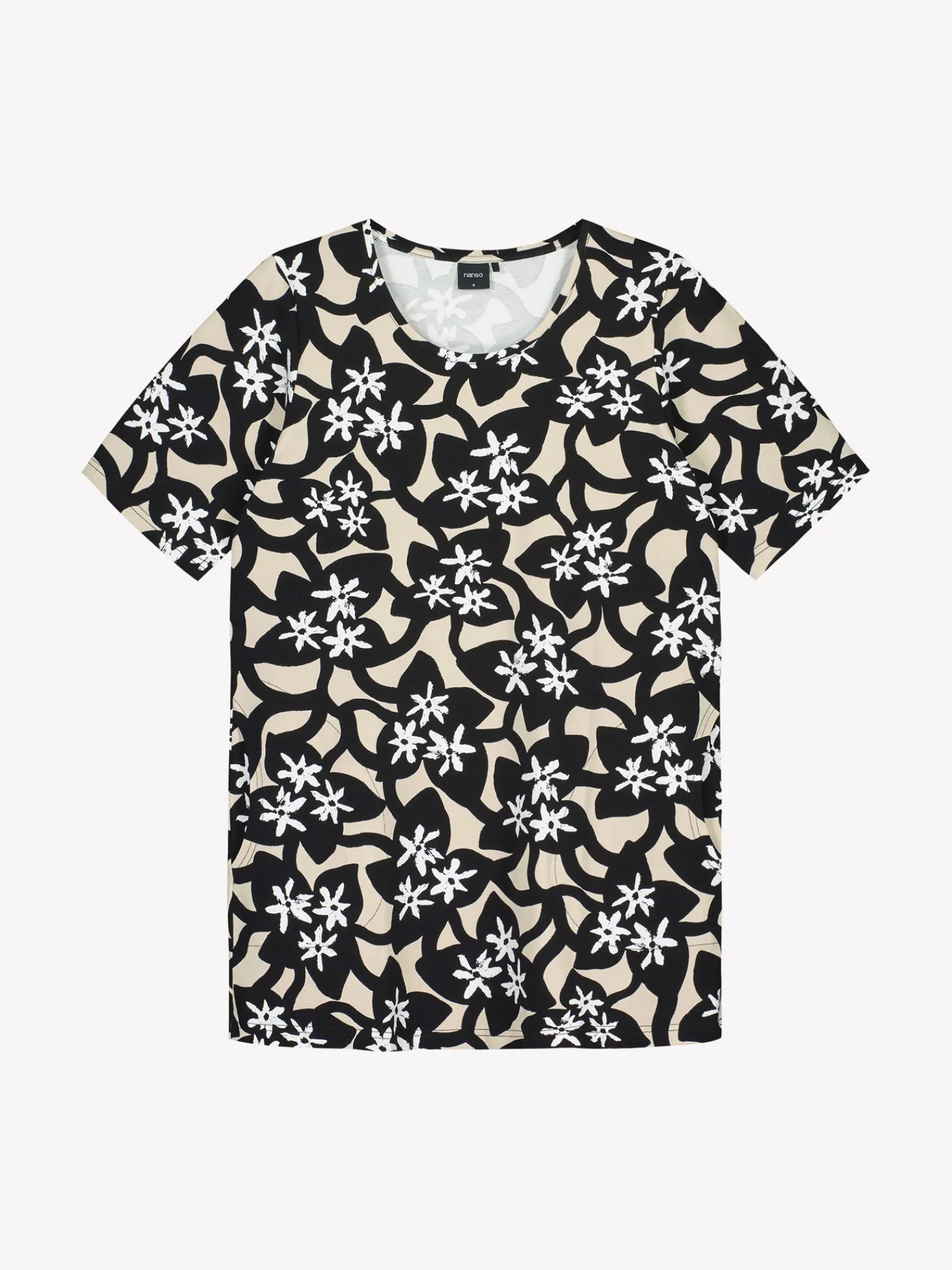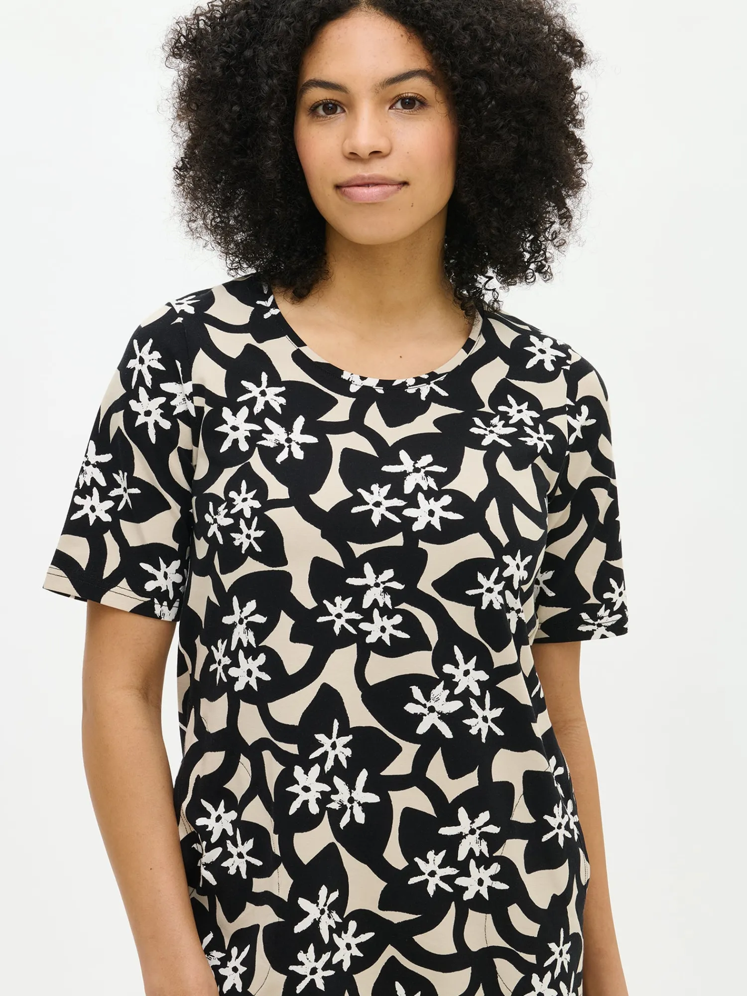 Naisten laadukas musta kukkakuvioinen Verna-tunika. Hieman A-linjaisessa tunikassa on avara, pyöreä pääntie, sivutaskut ja lyhyet 1/4 pituiset hihat. Tunikan pituus koossa M on noin 80 cm. Materiaali on laadukasta ja helppohoitoista puuvilla-elastaani-neulosta, joka pysyy hyvänä pesusta toiseen.