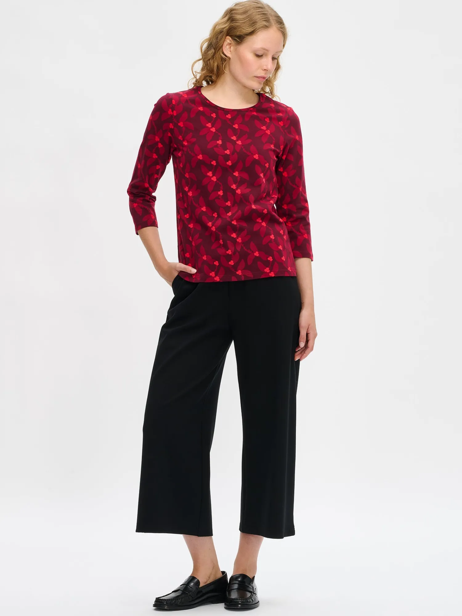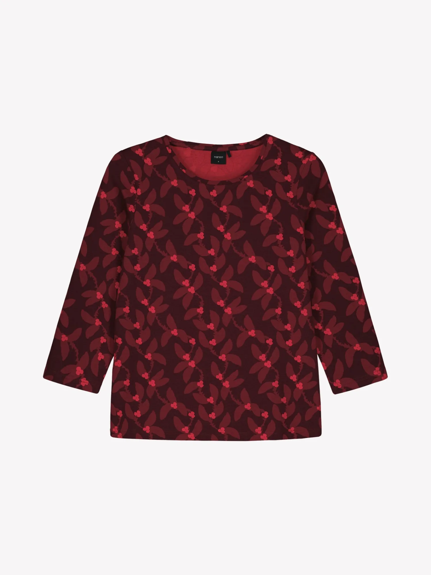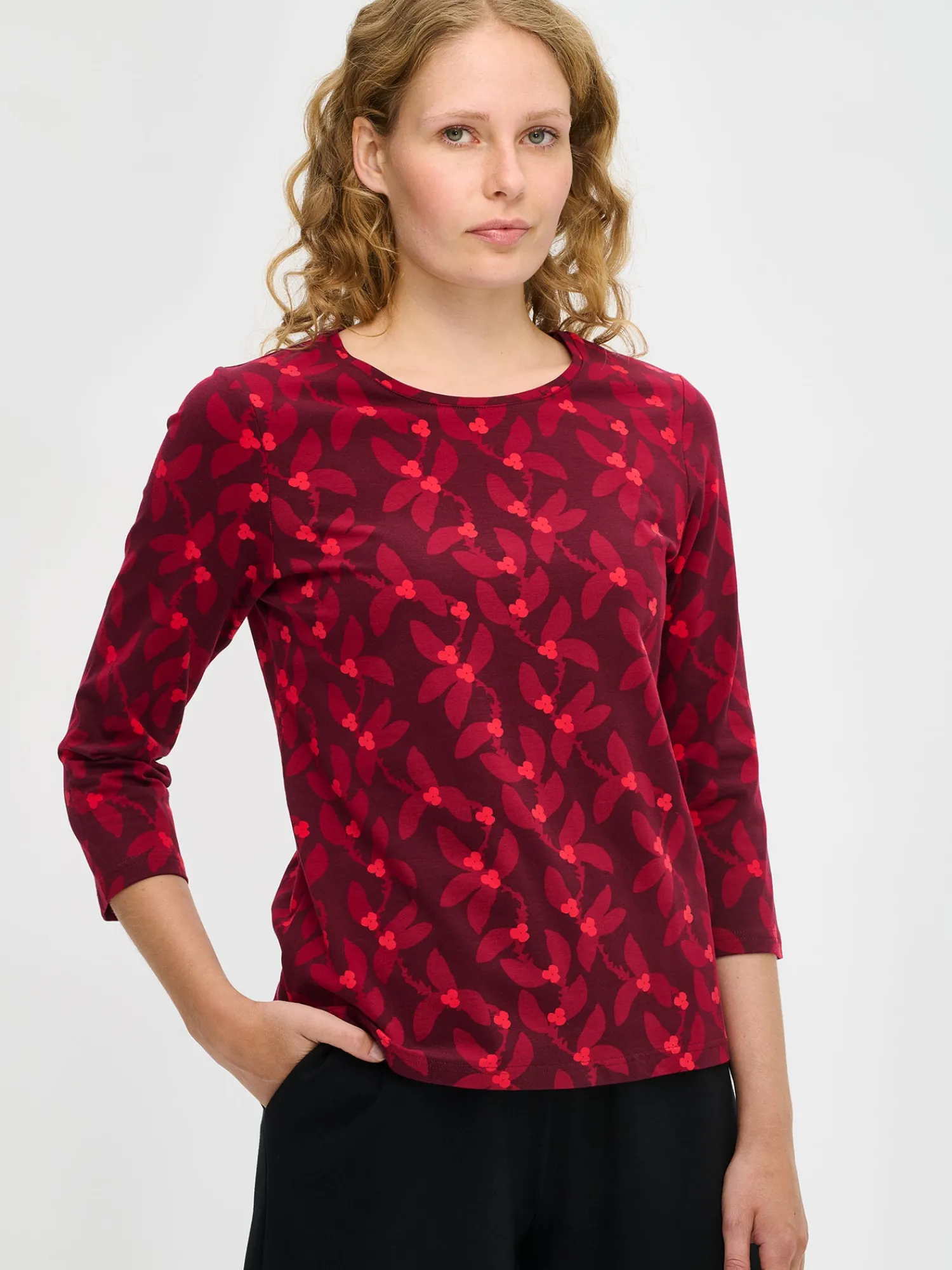 Naisten kuosillinen punainen Vieno-pusero. Istuvassa puserossa on tereellä viimeistelty pyöreä pääntie ja 3/4 pituiset hihat. Puseron pituus koossa M on noin 65 cm. Materiaali on miellyttävän tuntuista ja helppohoitoista puuvilla-elastaani-neulosta.