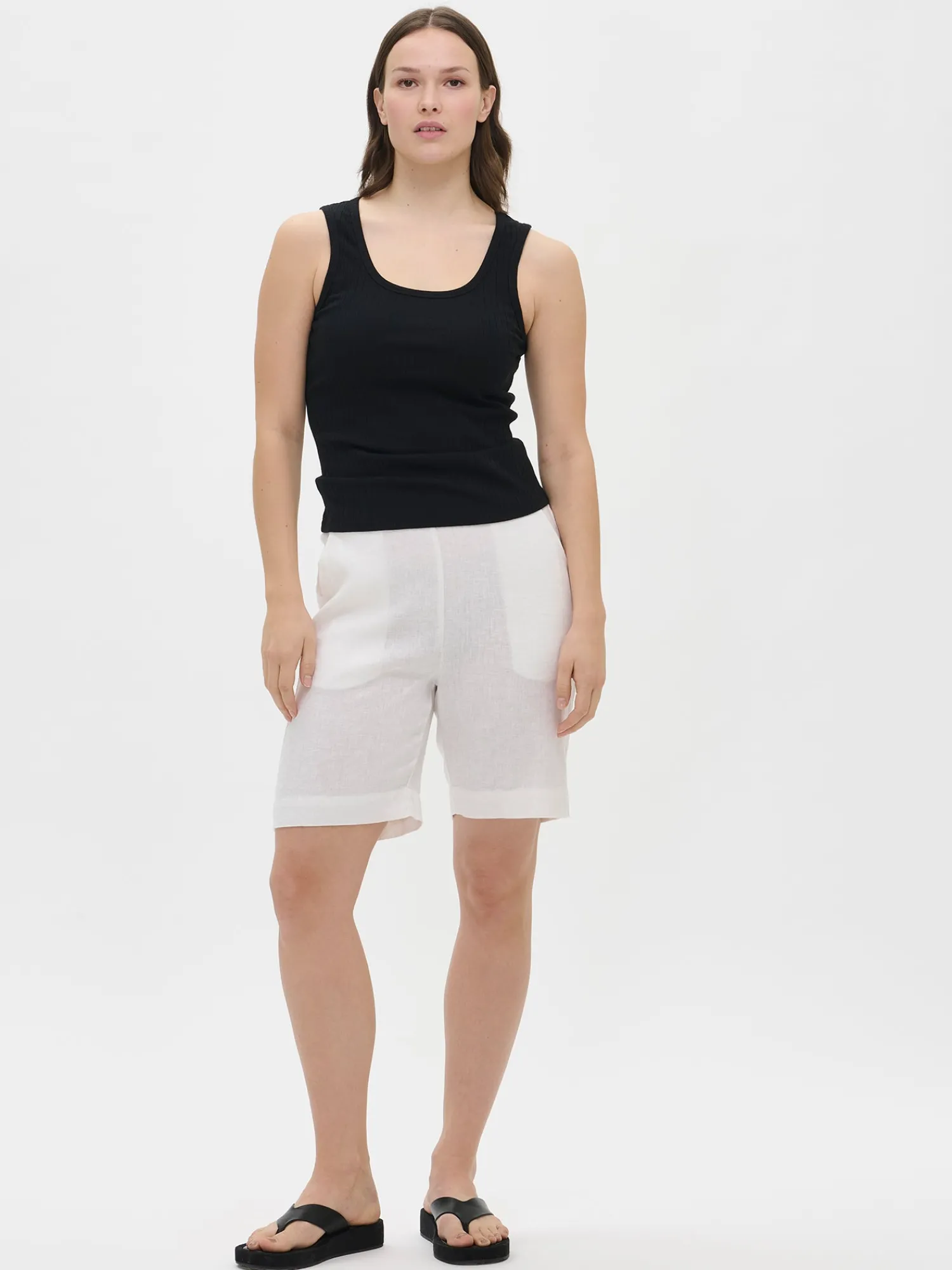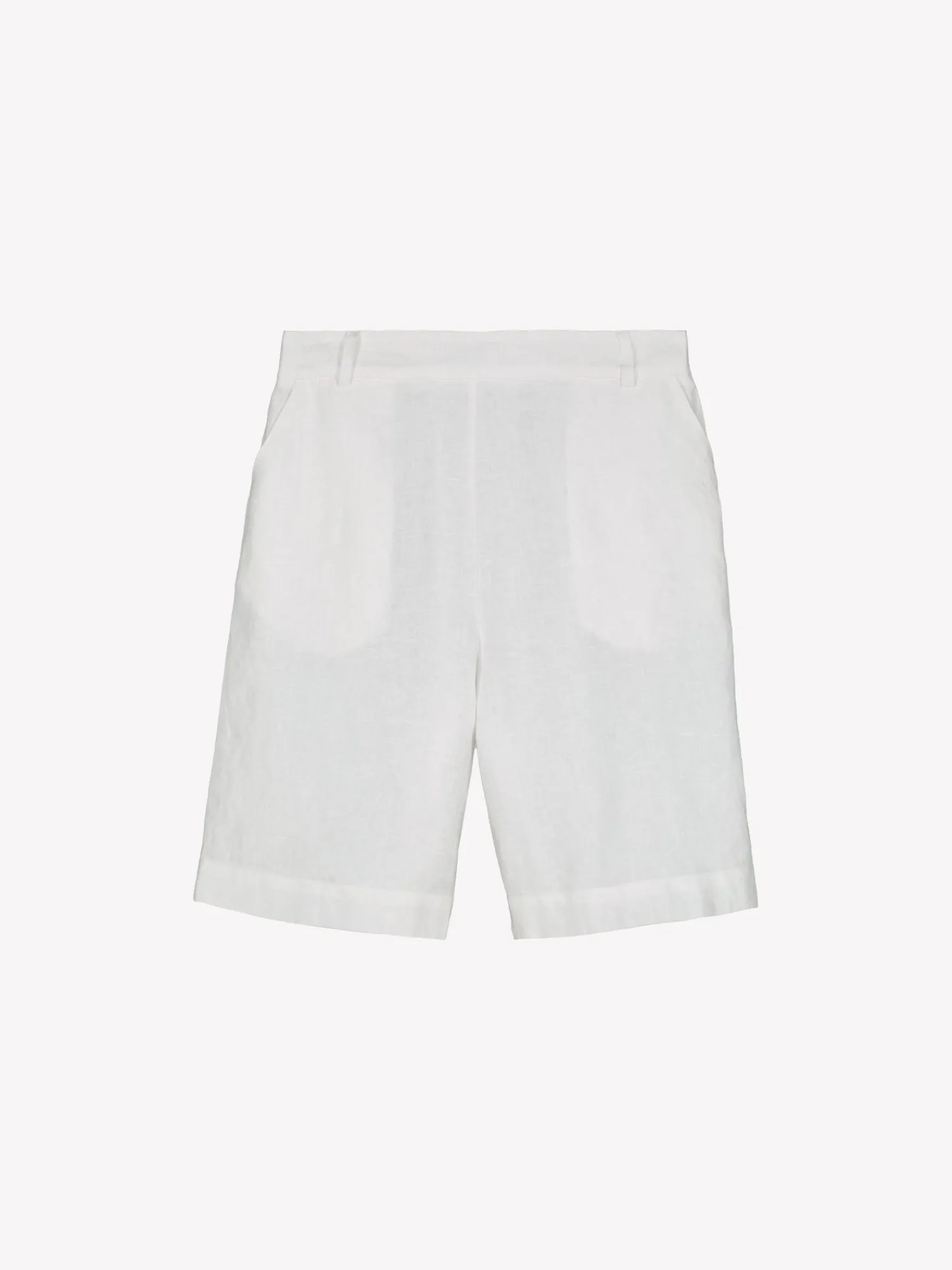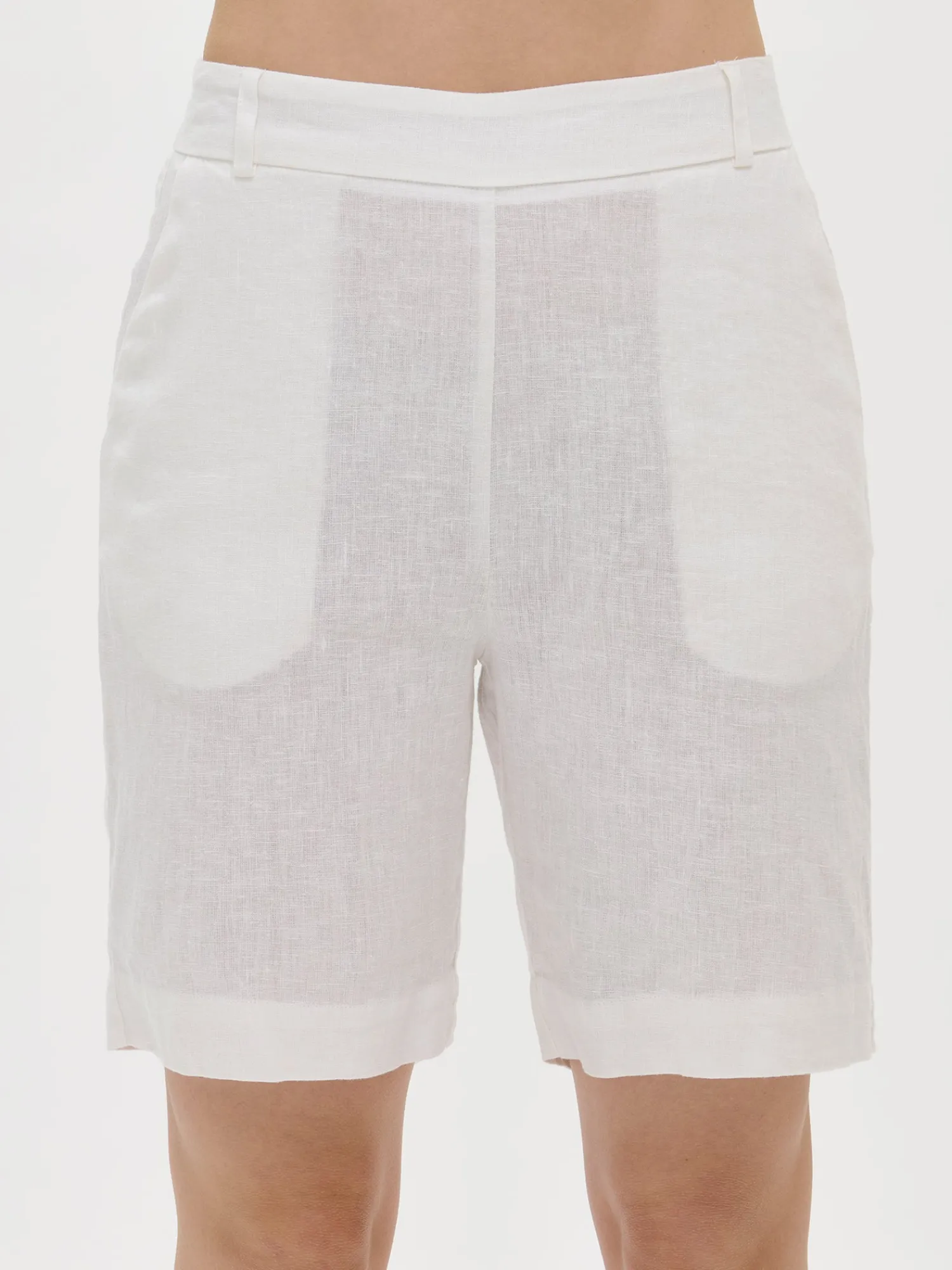 Naisten klassiset valkoiset Liine-pellavashortsit. Tyylikkäät ja ajattomat pellavashortsit ovat kesän luottovaate. Shortseissa on leveä vyötärökaitale ja takana kuminauha. Shortseissa on sivuissa taskut ja leveä käänne lahkeensuissa. Shortsien lahkeen sisäpituus koossa 38 on noin 24 cm. Materiaali on kudottua pellavakangasta, joka on kestävää ja hengittävää. Pellavalle on ominaista luonnollinen pieni rypistyminen. Tuote on esipesty tuotannossa, joten se ei kutistu ensimmäisessä pesussa.