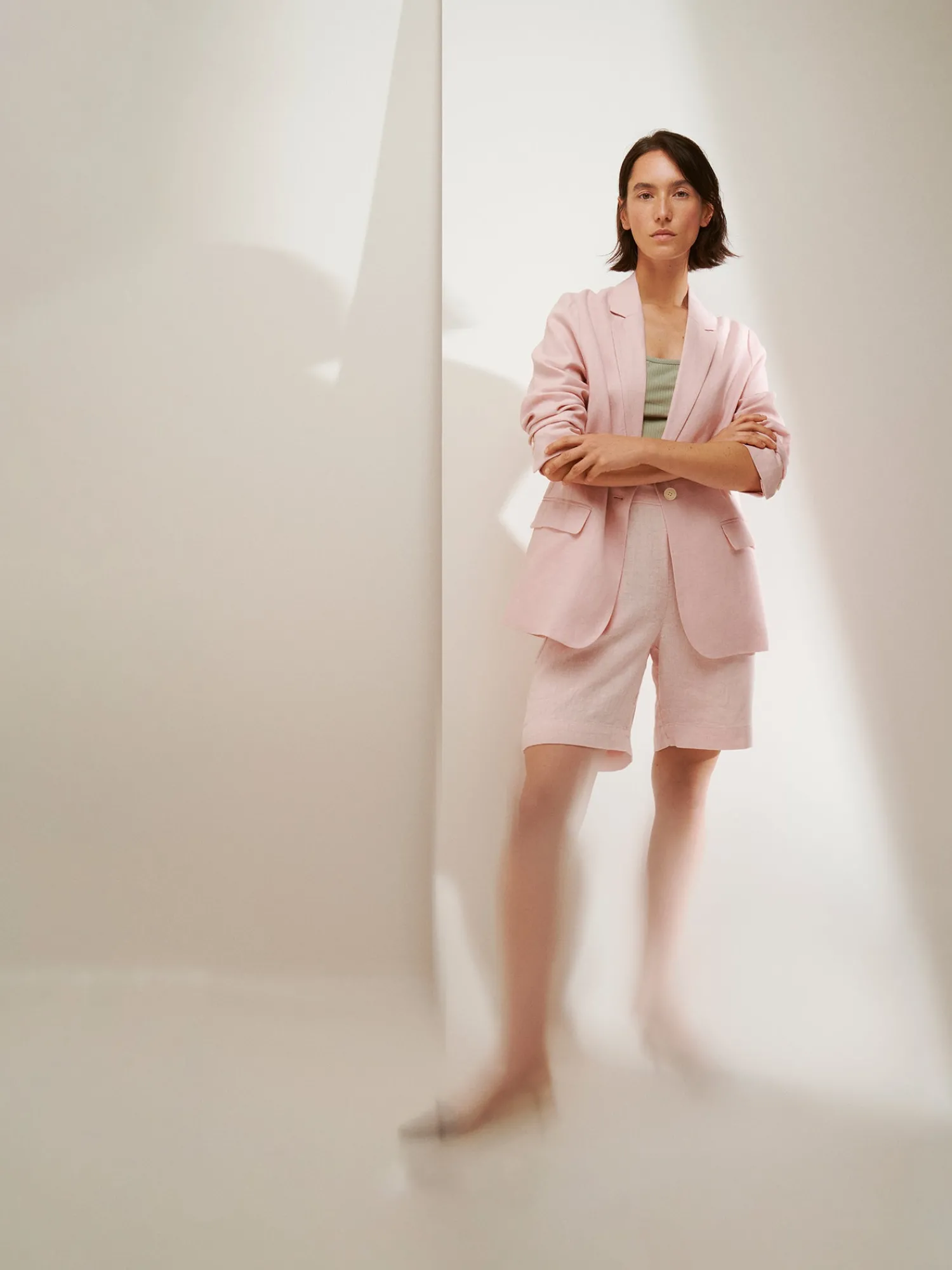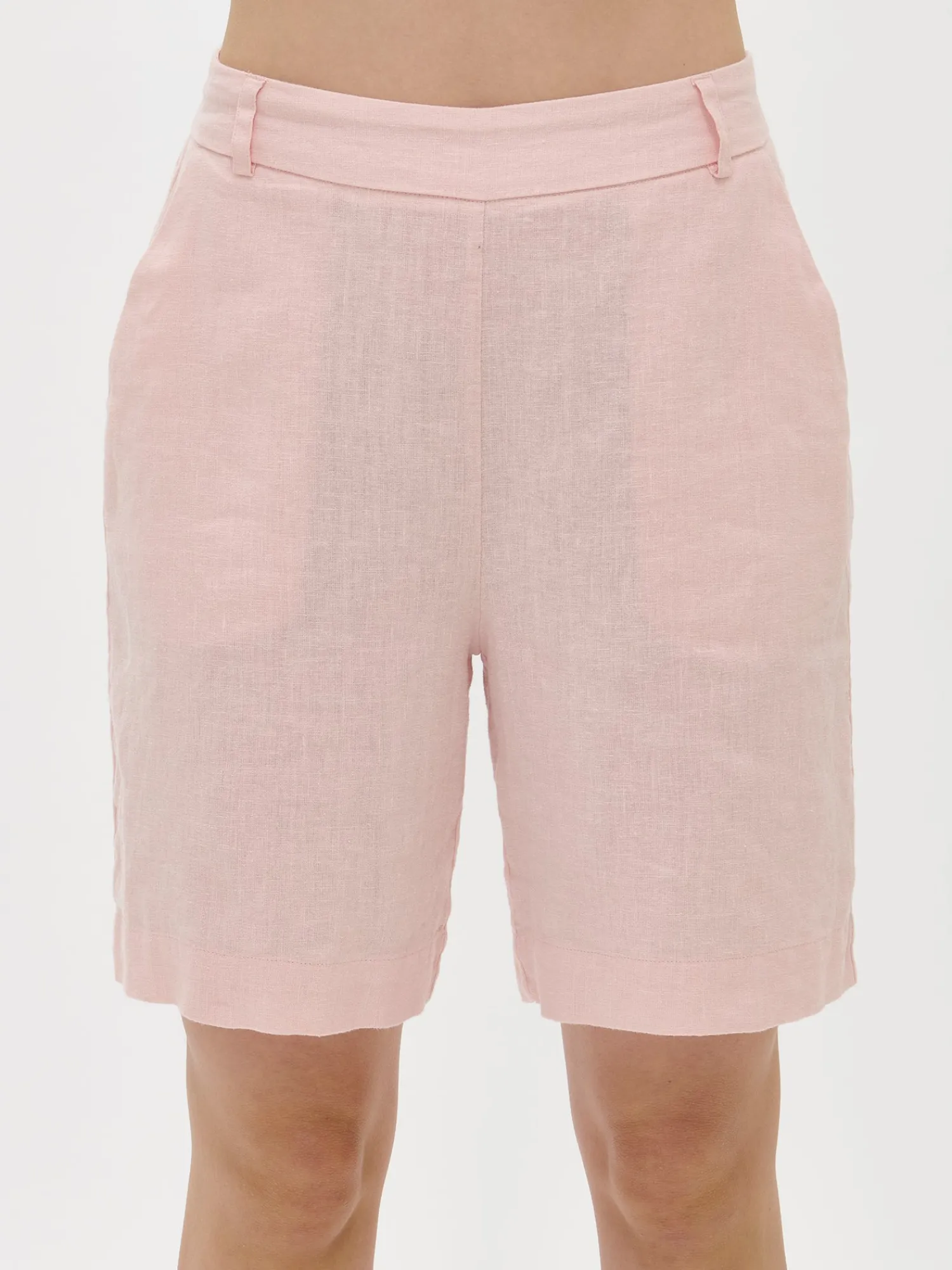 Naisten klassiset vaaleanpunaiset Liine-pellavashortsit. Tyylikkäät ja ajattomat pellavashortsit ovat kesän luottovaate. Shortseissa on leveä vyötärökaitale ja takana kuminauha. Shortseissa on sivuissa taskut ja leveä käänne lahkeensuissa. Shortsien lahkeen sisäpituus koossa 38 on noin 24 cm. Materiaali on kudottua pellavakangasta, joka on kestävää ja hengittävää. Pellavalle on ominaista luonnollinen pieni rypistyminen. Tuote on esipesty tuotannossa, joten se ei kutistu ensimmäisessä pesussa.