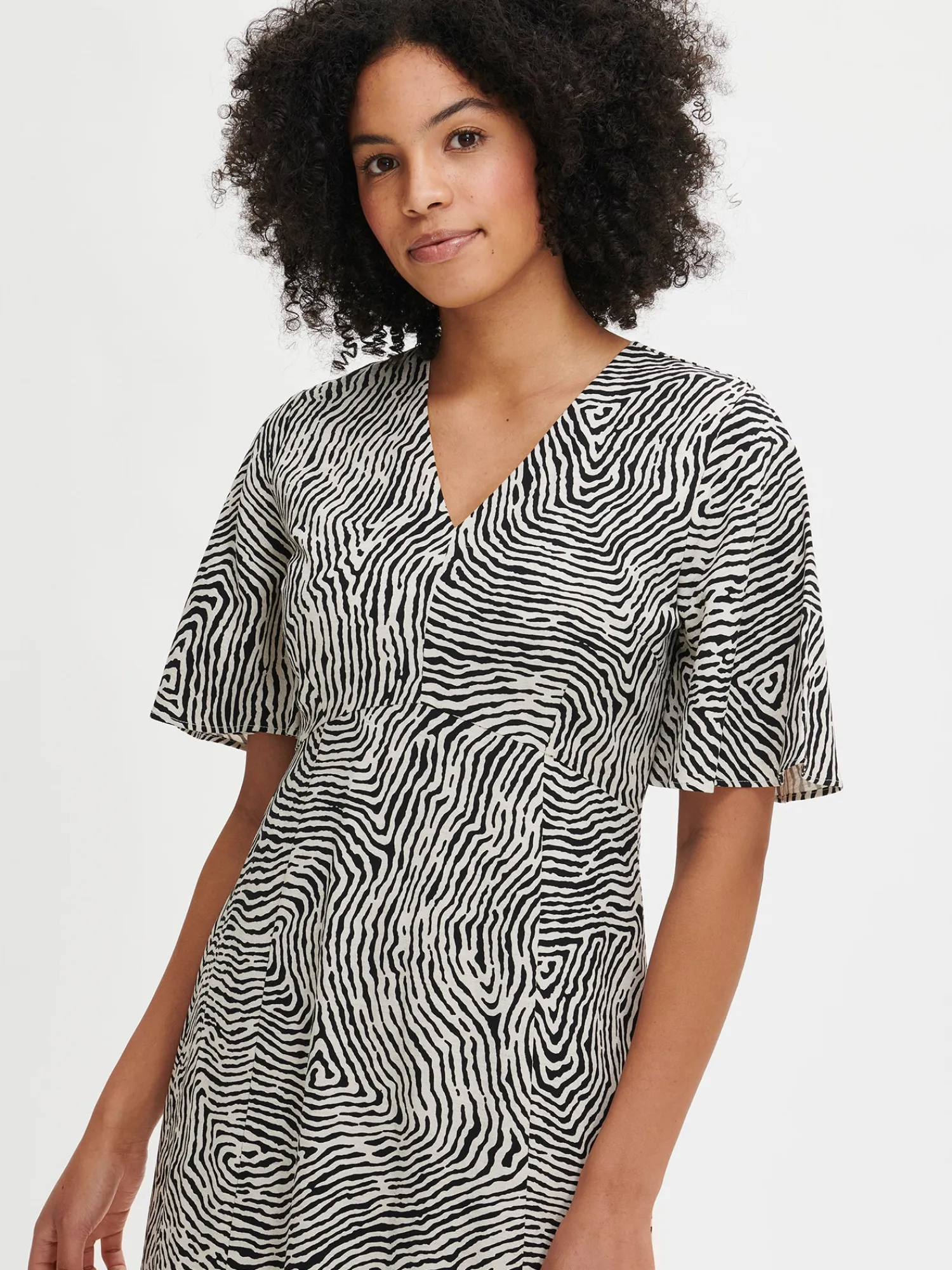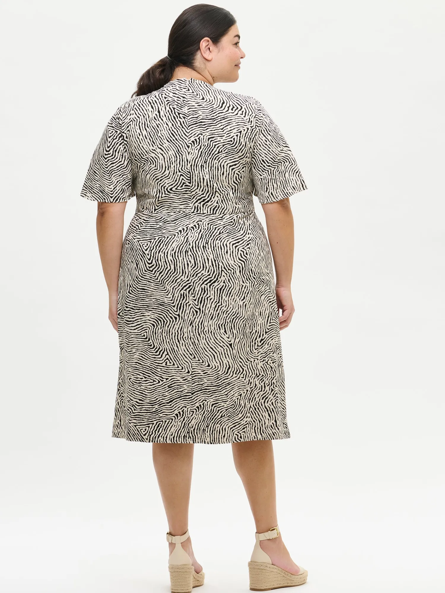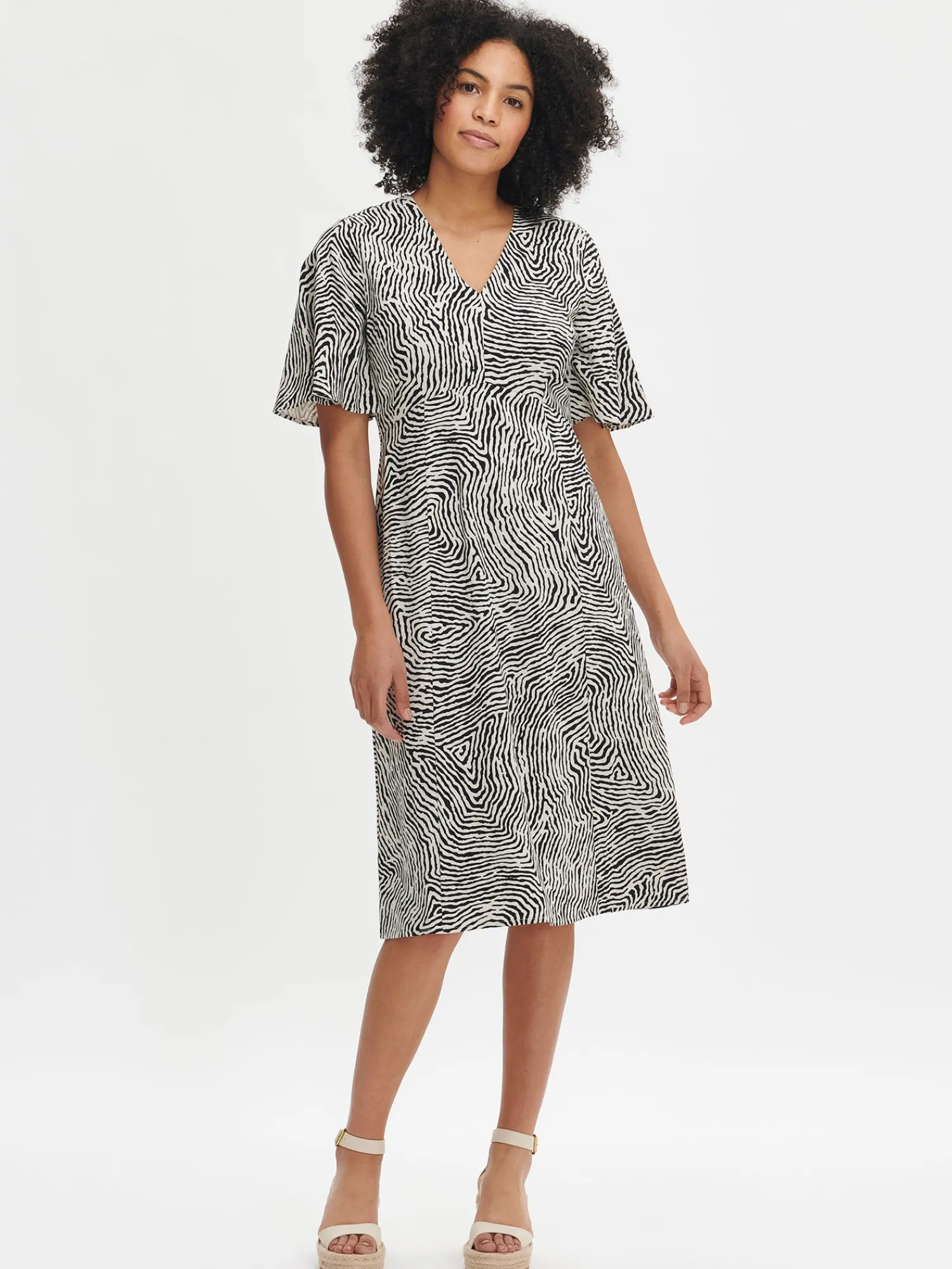 Naisten kuosillinen musta-luonnonvalkoinen lyhythihainen Jälki-mekko. Kaunis kesämekko sopii sekä arkeen että juhlaan. Mekossa on 2/4-pituiset kellotetut hihat. Mekossa on V-pääntie, takana piilovetoketju ja vuori. Mekko on yläosasta istuva ja helma kauniisti kellottuva. Mekon pituus koossa 38 on noin 115 cm. Tuote on valmistettu kevyestä viskoosi-pellavasekoitteesta. Materiaalille on ominaista 3-5 % kutistuminen ensimmäisessä pesussa.