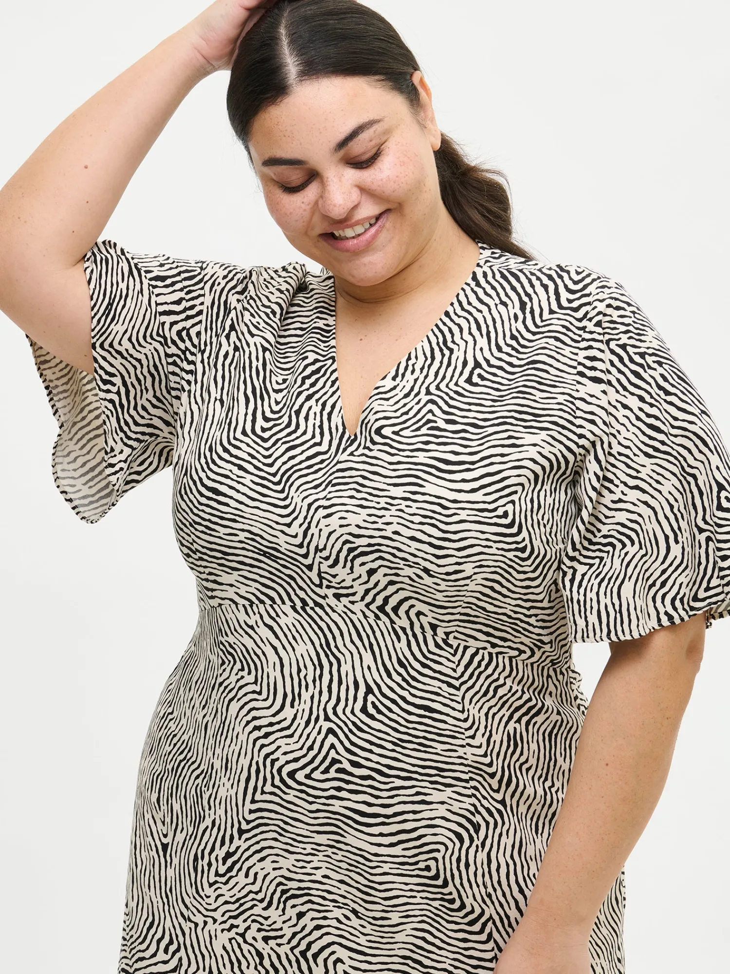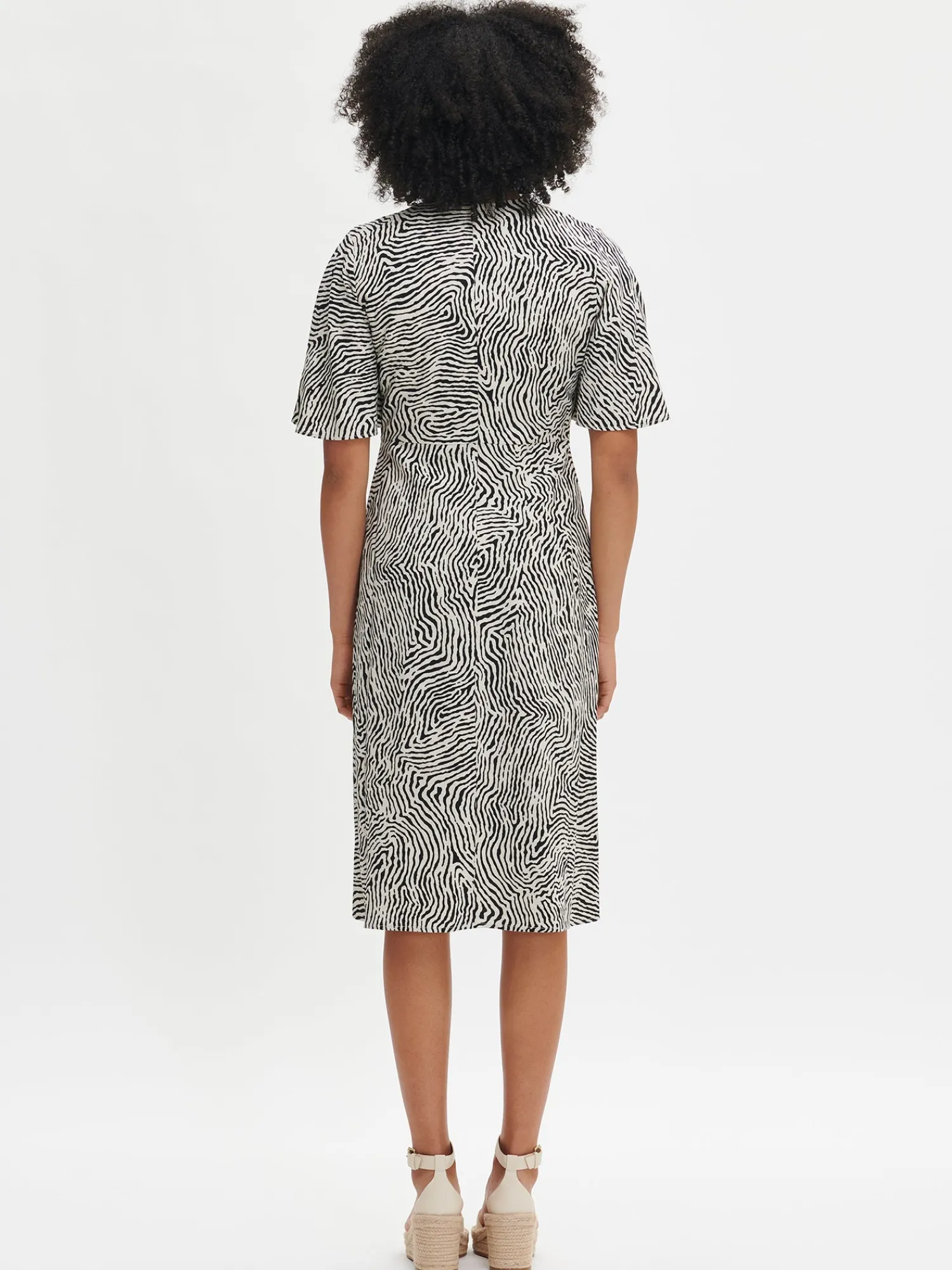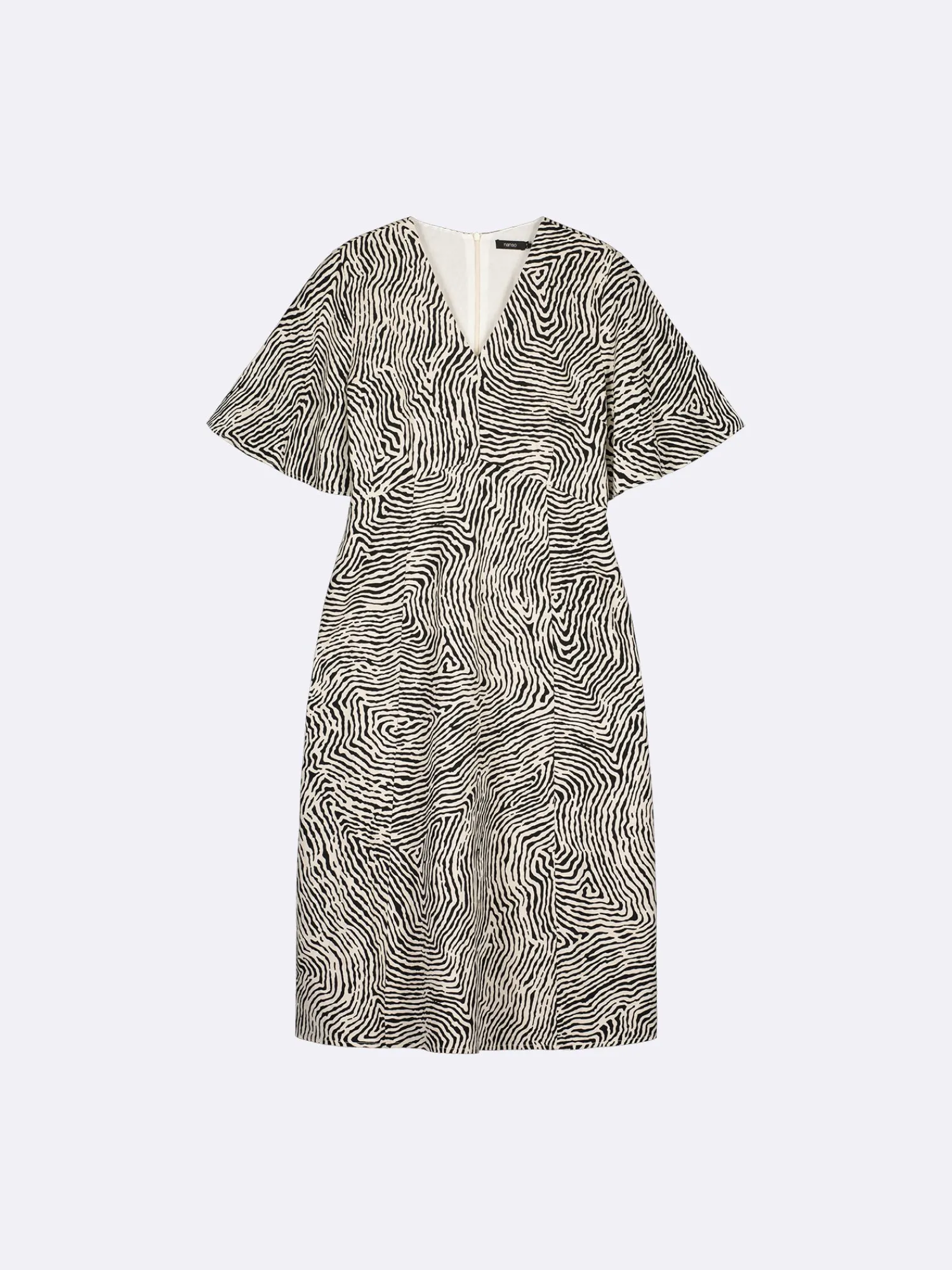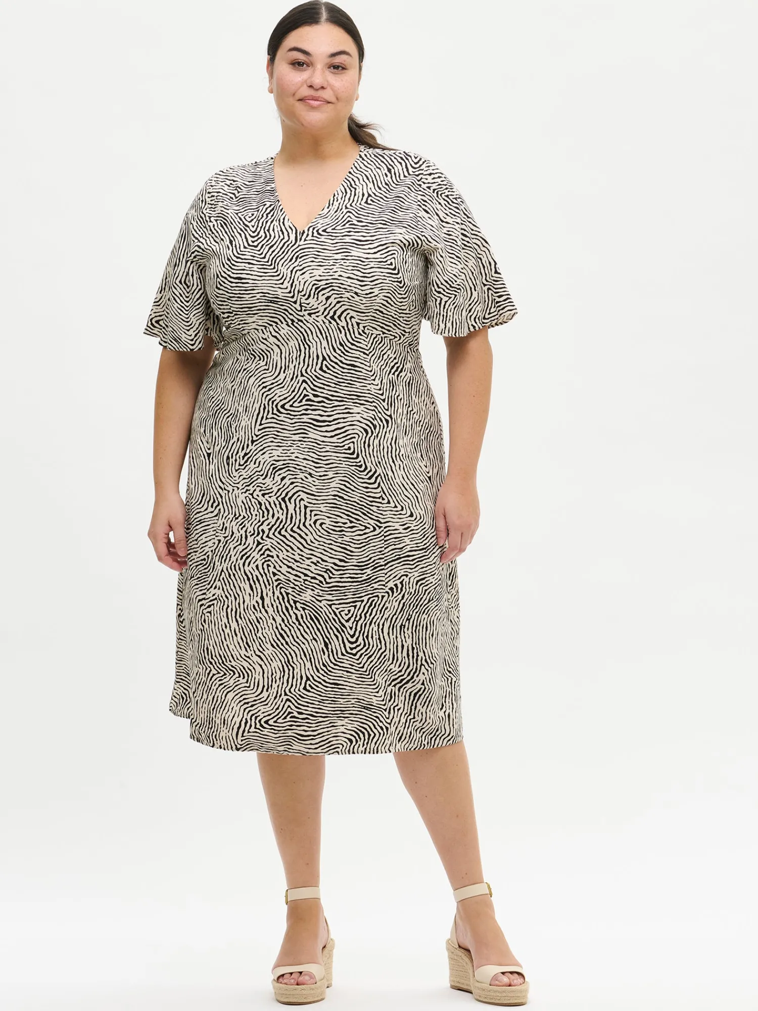 Naisten kuosillinen musta-luonnonvalkoinen lyhythihainen Jälki-mekko. Kaunis kesämekko sopii sekä arkeen että juhlaan. Mekossa on 2/4-pituiset kellotetut hihat. Mekossa on V-pääntie, takana piilovetoketju ja vuori. Mekko on yläosasta istuva ja helma kauniisti kellottuva. Mekon pituus koossa 38 on noin 115 cm. Tuote on valmistettu kevyestä viskoosi-pellavasekoitteesta. Materiaalille on ominaista 3-5 % kutistuminen ensimmäisessä pesussa.
