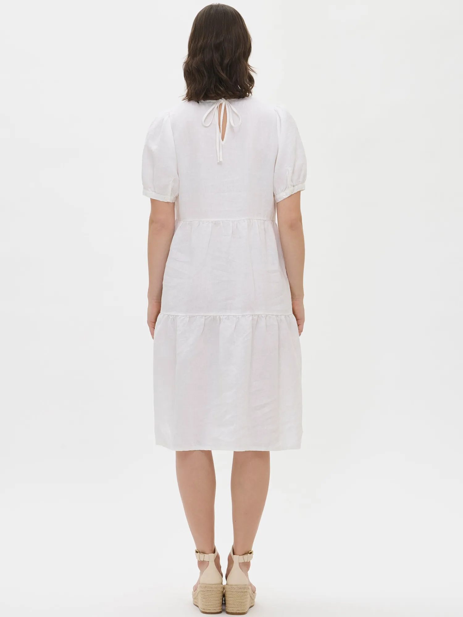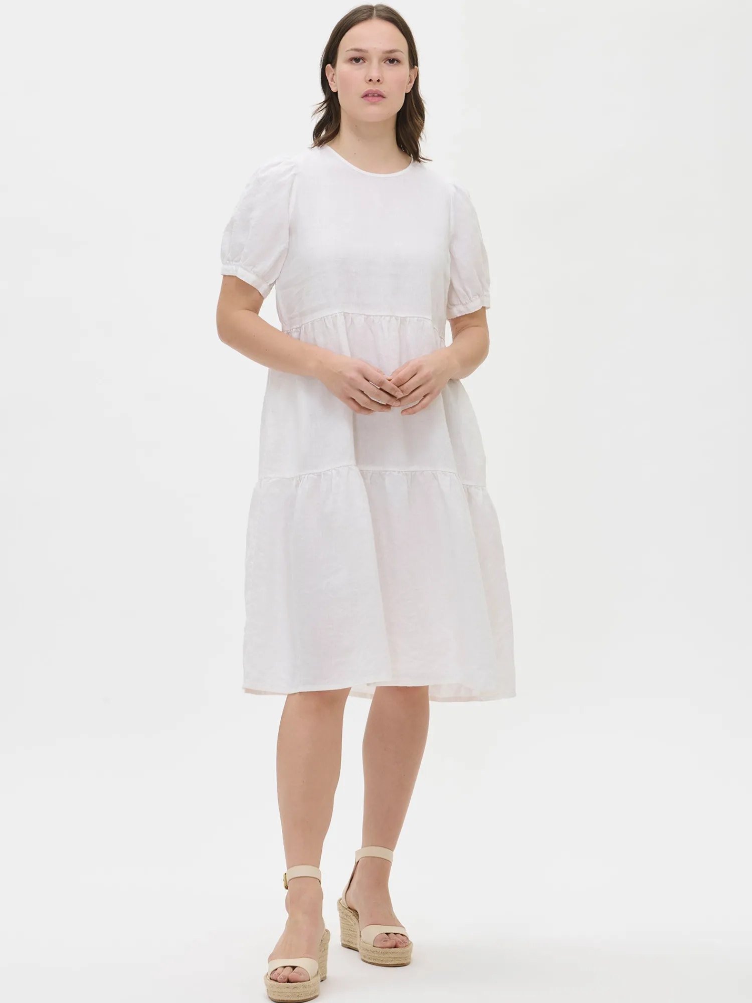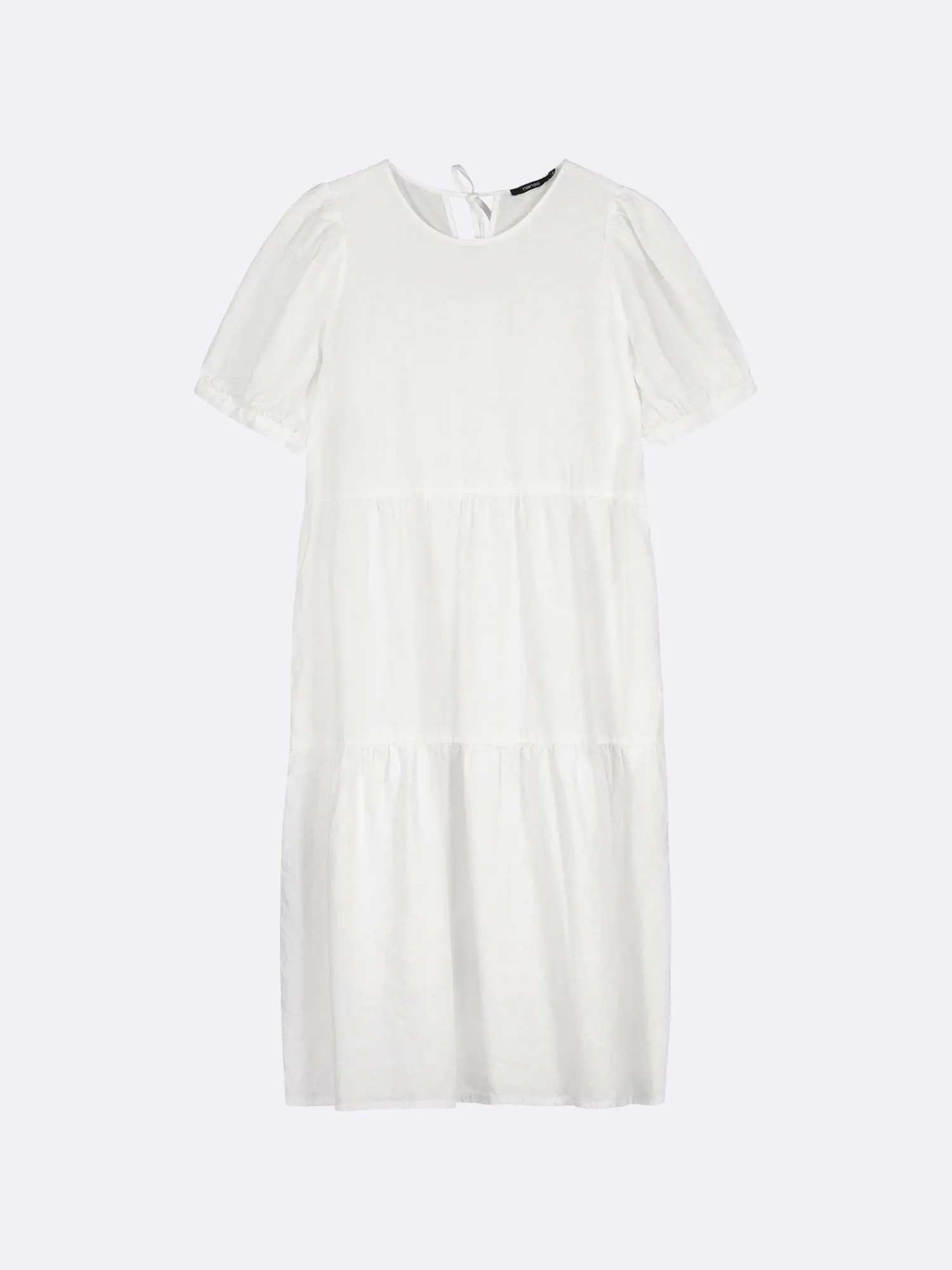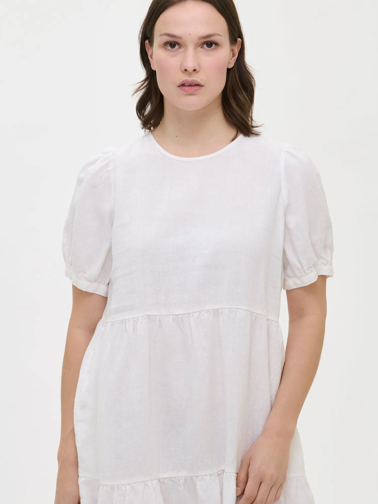 Naisten kaunis valkoinen midimittainen Sarastus-pellavamekko volyymisilla frillakerroksilla ja lyhyillä puhvihihoilla, joissa on napit säätövaralla. Rennon tyylikäs Sarastus-pellavamekko on kesän kestosuosikki, joka hurmaa ihanassa midi-pituudessa. Pellavamekossa on sivutaskut, pyöreä pääntie sekä niskassa pieni halkio ja solmittavat nyörit. Mekon pituus koossa M on noin 113 cm. Materiaali kudottua pellavakangasta, joka on kestävää ja hengittävää. Pellavalle on ominaista luonnollinen pieni rypistyminen. Tuote on esipesty tuotannossa, joten se ei kutistu ensimmäisessä pesussa.