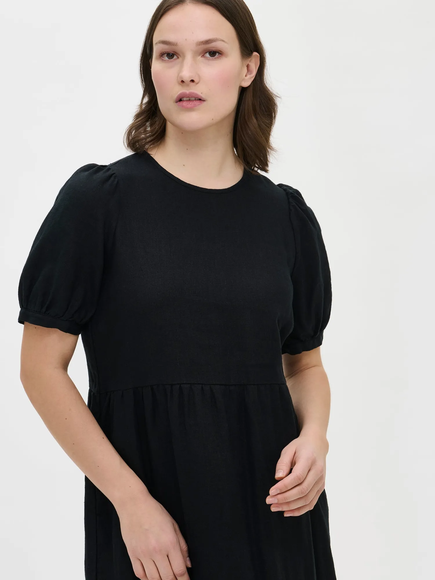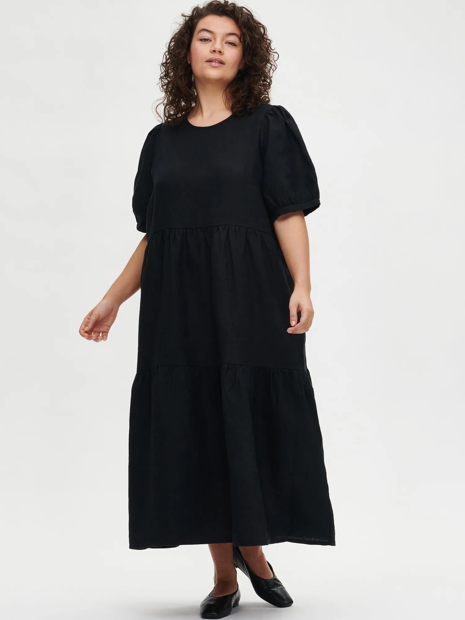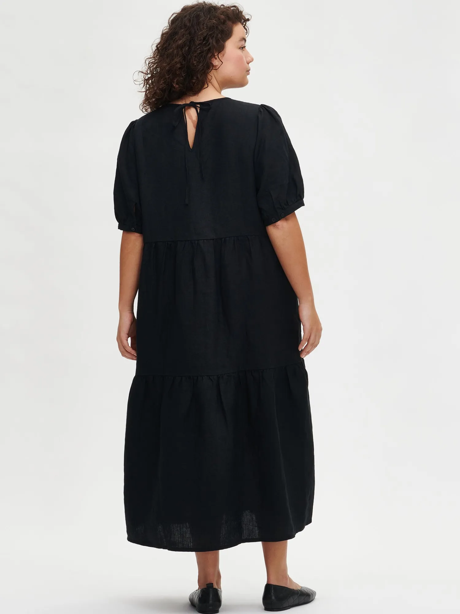 Naisten kaunis musta Sarastus-pellavamekko volyymisilla frillakerroksilla ja lyhyillä puhvihihoilla, joissa on napit säätövaralla. Tyylikäs ja rento Sarastus-pellavamekko on kesän kestosuosikki vuodesta toiseen. Mekossa on sivutaskut, pyöreä pääntie sekä niskassa pieni halkio ja solmittavat nyörit. Pellavamekon pituus koossa M on noin 130 cm. Materiaali kudottua pellavakangasta, joka on kestävää ja hengittävää. Pellavalle on ominaista luonnollinen pieni rypistyminen. Tuote on esipesty tuotannossa, joten se ei kutistu ensimmäisessä pesussa.