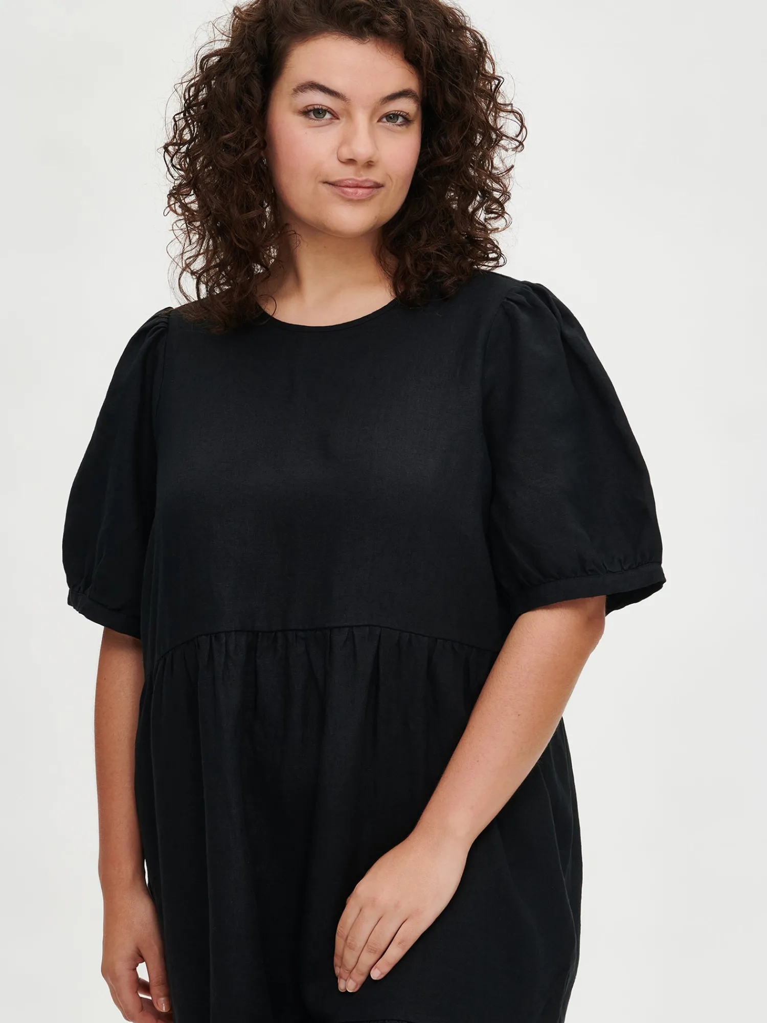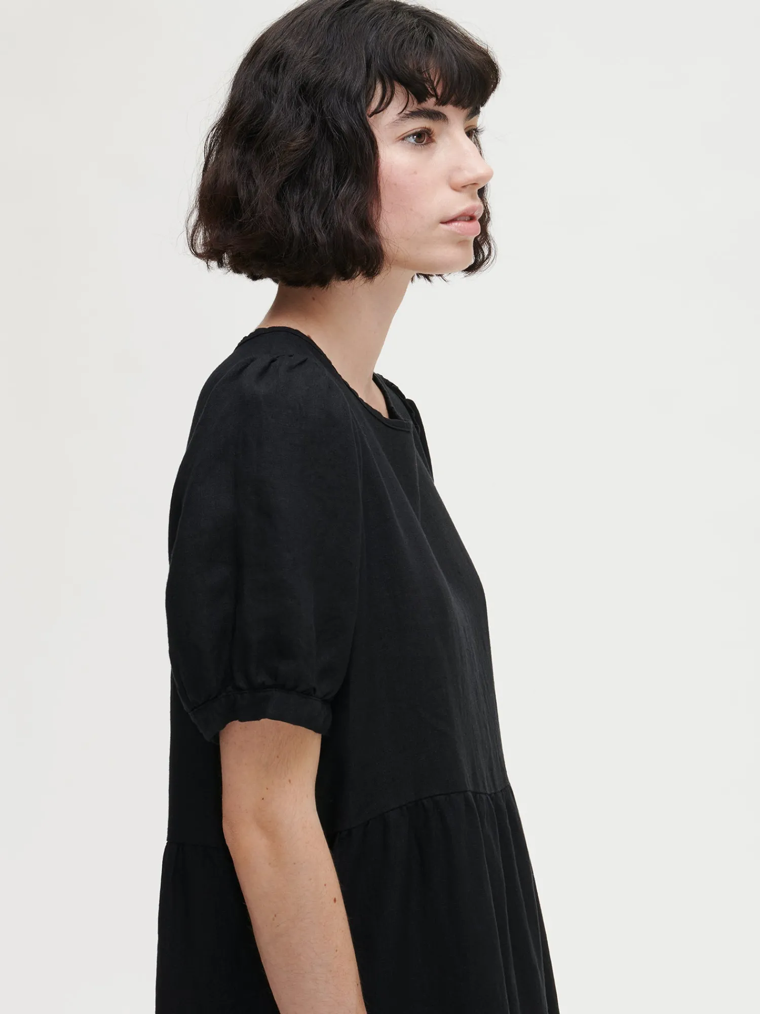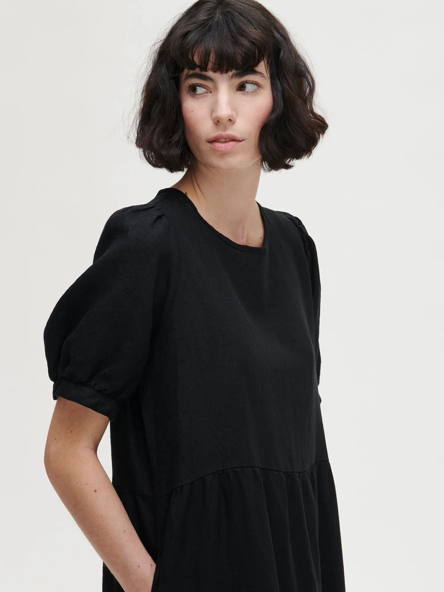 Naisten kaunis musta Sarastus-pellavamekko volyymisilla frillakerroksilla ja lyhyillä puhvihihoilla, joissa on napit säätövaralla. Tyylikäs ja rento Sarastus-pellavamekko on kesän kestosuosikki vuodesta toiseen. Mekossa on sivutaskut, pyöreä pääntie sekä niskassa pieni halkio ja solmittavat nyörit. Pellavamekon pituus koossa M on noin 130 cm. Materiaali kudottua pellavakangasta, joka on kestävää ja hengittävää. Pellavalle on ominaista luonnollinen pieni rypistyminen. Tuote on esipesty tuotannossa, joten se ei kutistu ensimmäisessä pesussa.