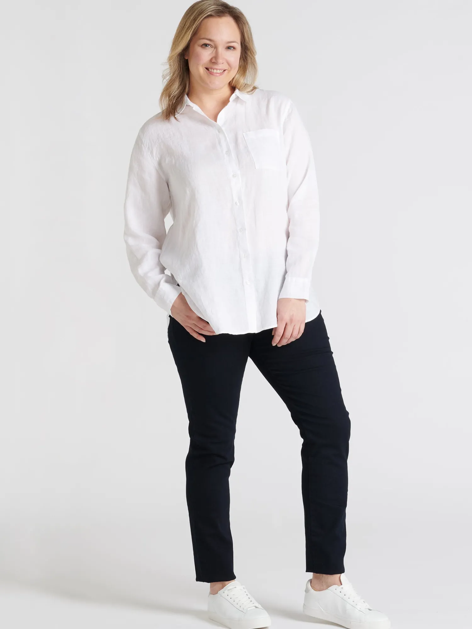 Naisten rento pitkähihainen valkoinen Pellava-paitapusero. Klassinen kauluspaita on todellinen vaatekaapin kulmakivi. Ajaton kauluspaita hurmaa monikäyttöisyydellään ja siksi se on varma valinta kerta toisensa jälkeen. Tyylikkäässä pellavapaidassa on napit edessä ja rintatasku. Puseron pituus koossa 38 on noin 75 cm. Materiaali on kudottua pellavakangasta, joka on kestävää ja hengittävää. Pellavalle on ominaista luonnollinen pieni rypistyminen. Tuote on esipesty tuotannossa, joten se ei kutistu ensimmäisessä pesussa.