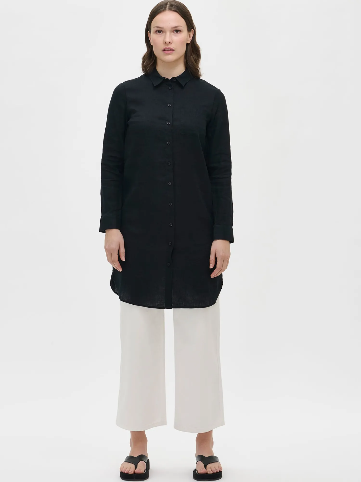 Naisten rento ja pitkä musta Pellava-paitapusero. Klassinen pitkä kauluspaita sopii niin arkeen kuin juhlaan. Tyylikäs pitkähihainen paitapusero on kesän monipuolinen luottovaate – voit pukea sen sekä mekkona, että pitkänä paitapuserona housujen kanssa. Pellavapuserossa on napit edessä ja rintatasku. Pitkä paidan pituus koossa 38 on noin 95 cm. Materiaali on kudottua pellavakangasta, joka on kestävää ja hengittävää. Pellavalle on ominaista luonnollinen pieni rypistyminen. Tuote on esipesty tuotannossa, joten se ei kutistu ensimmäisessä pesussa.