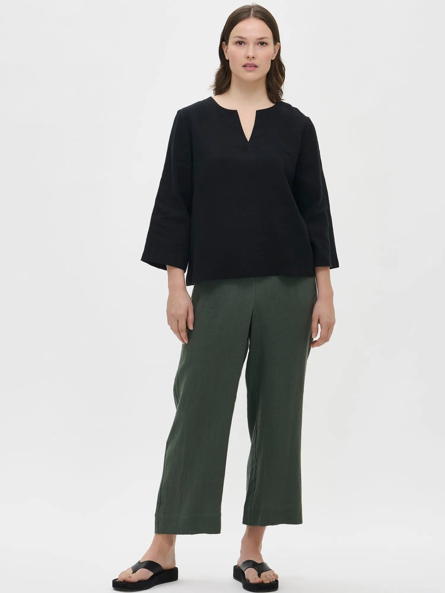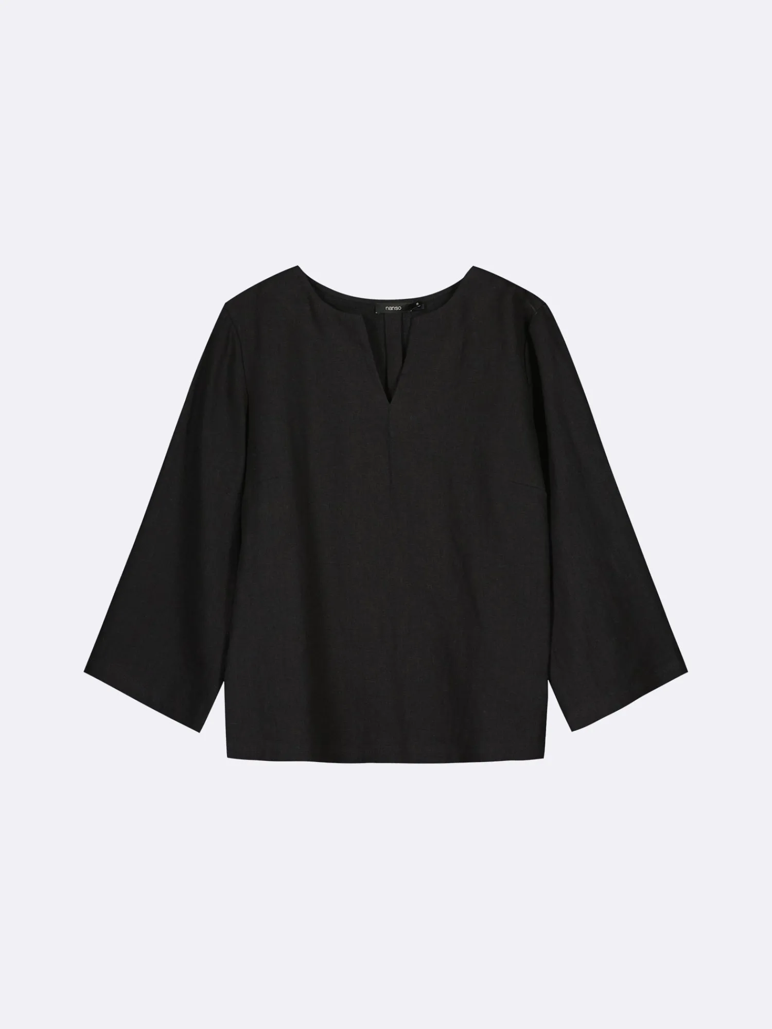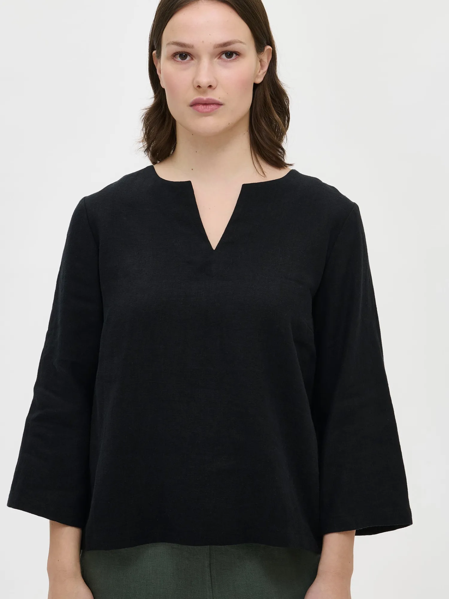 Naisten musta Pellava-pusero 3/4 pituisilla hihoilla. A-linjaisessa puserossa on pyöreä pääntie, jonka edessä on halkio. Tyylikäs pellavapusero on ihana vaate arkeen ja juhlaan. Puseron helma on suora ja pituus koossa 38 on noin 62 cm. Materiaali on kudottua pellavakangasta, joka on kestävää ja hengittävää. Pellavalle on ominaista luonnollinen pieni rypistyminen. Tuote on esipesty tuotannossa, joten se ei kutistu ensimmäisessä pesussa.