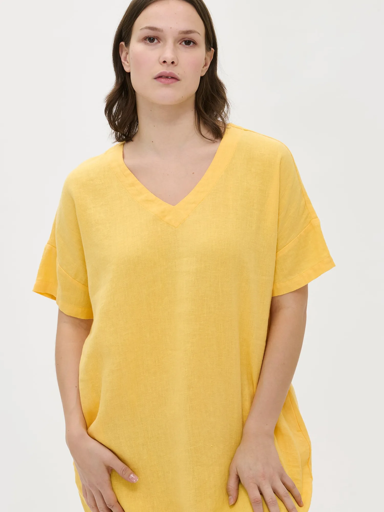 Naisten rento keltainen suoralinjainen Sarastus-pellavamekko sivuhalkioilla. Lyhythihaisessa kaftaanissa on V-pääntie ja sivutaskut. Mekon pituus koossa M on noin 130 cm. Materiaali kudottua pellavakangasta, joka on kestävää ja hengittävää. Pellavan kevyt ja viileä tuntu tekevät mekosta täydellisen valinnan rentoihin kesäpäiviin ja kiireettömiin hetkiin kotona. Pellavalle on ominaista luonnollinen pieni rypistyminen. Tuote on esipesty tuotannossa, joten se ei kutistu ensimmäisessä pesussa.
