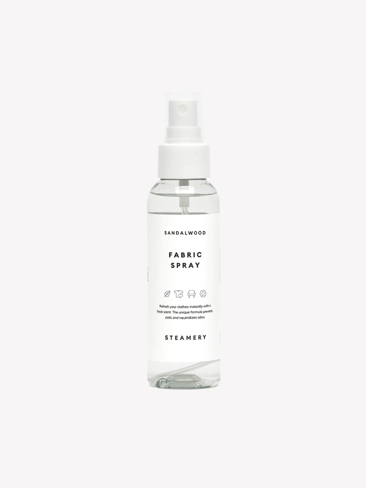 Raikasta vaatteesi helposti ja nopeasti pesukertojen välillä. Steameryn tekstiilisuihke neutralisoi hajuja, vähentää sähköisyyttä ja antaa tekstiileillesi miellyttävän santelipuun tuoksun saaden ne tuntumaan vastapestyiltä. Tekstiilisuihke sopii kaikille kankaille. 100ml kierrätystä muovista valmistettu pullo on kätevä ottaa myös matkalle mukaan. Tuotetta ei ole testattu eläimillä.