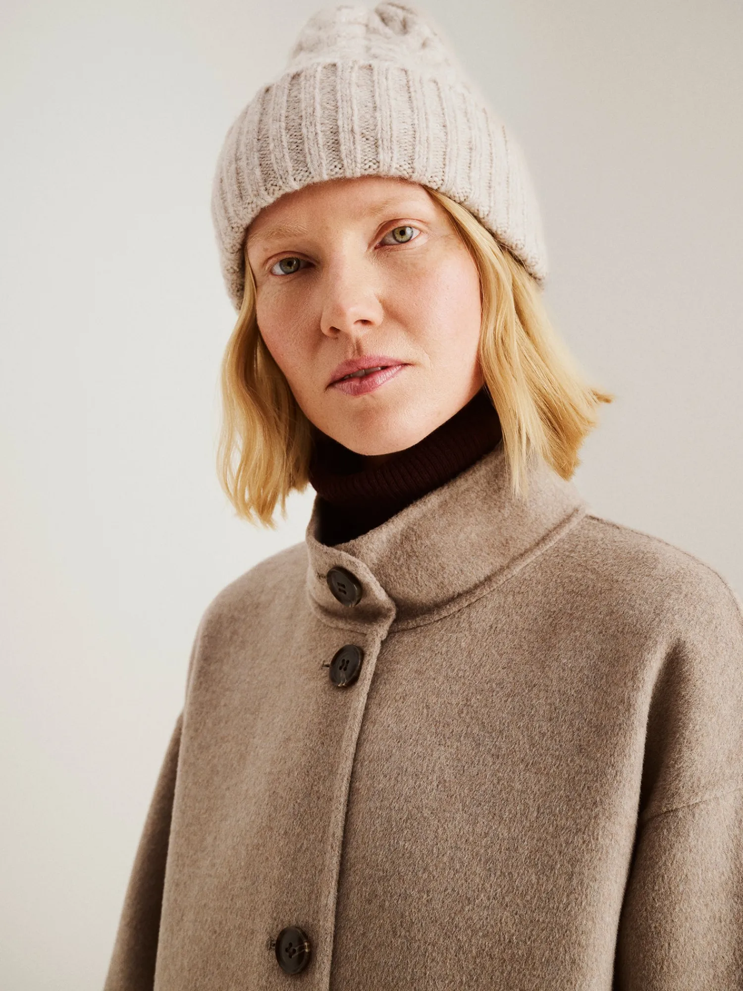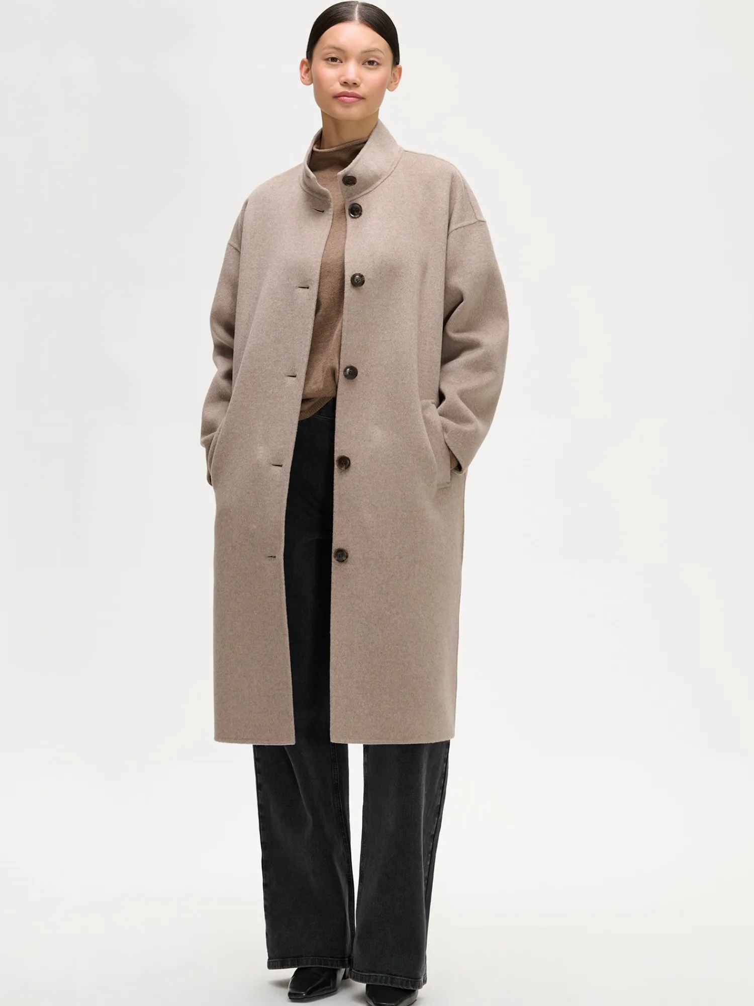 Naisten pitkä beige Elle-villakangastakki matalalla pystykauluksella. Ajaton ja elegantti villakangastakki kuuluu jokaiseen vaatekaappiin. Elle-takki tuo tyyliä niin arkipukeutumiseen kuin juhlavampiin tilaisuuksiin. Materiaali on laadukasta villa-polyesteri sekoitetta. Vuorittoman takin saumat ovat kauniisti sisältä ja ulkoa huolitellut. Takissa on edessä nappikiinnitys ja listataskut. Olkalinja on pudotettu ja takki hieman alaspäin kapenevaa mallia. Takin pituus koossa M on noin 110 cm.