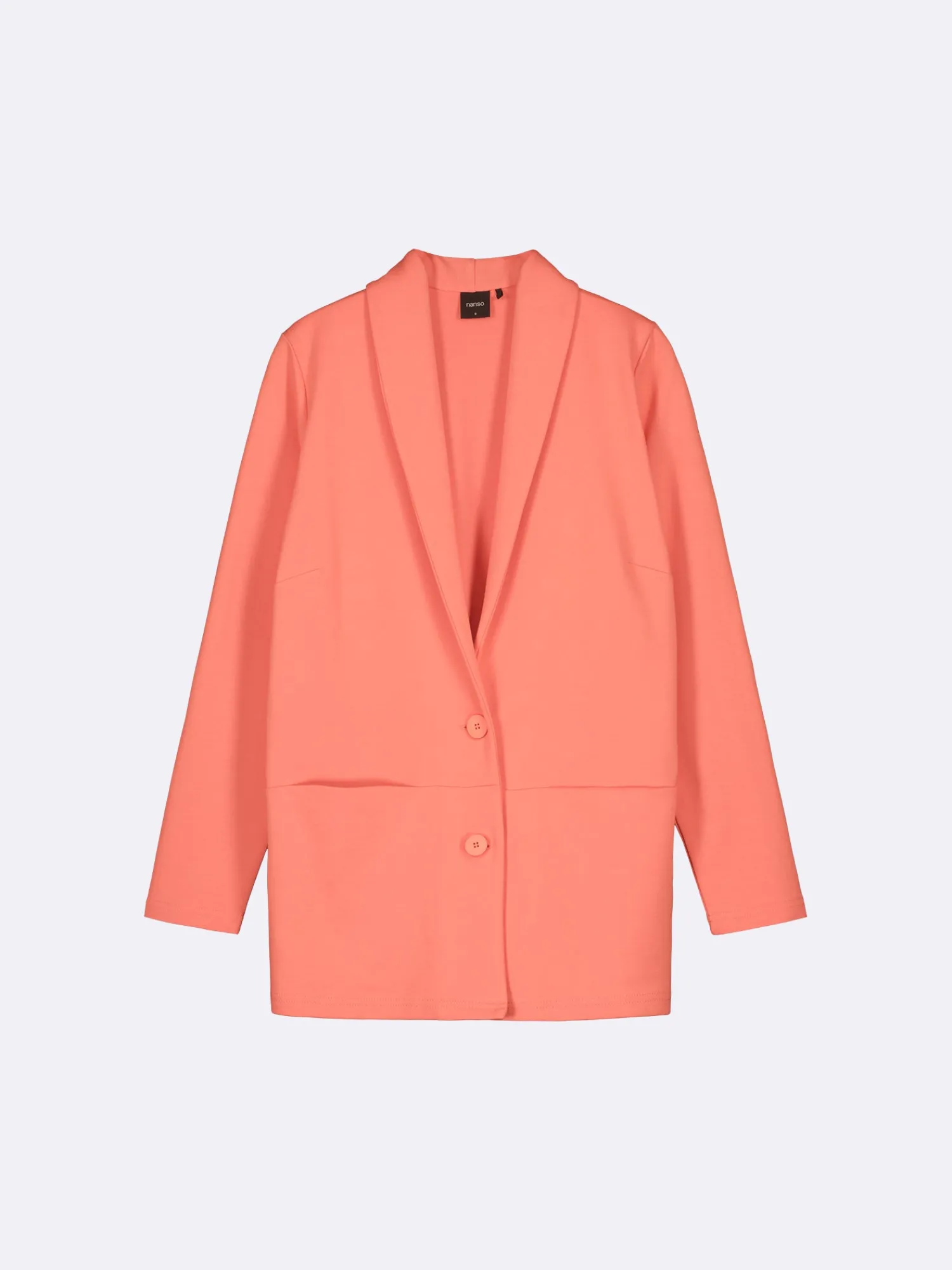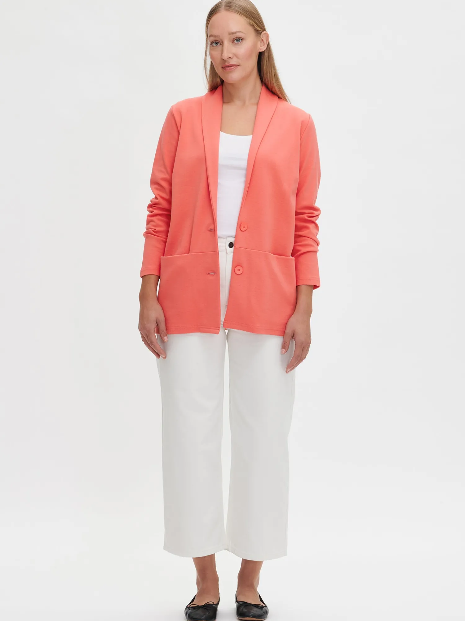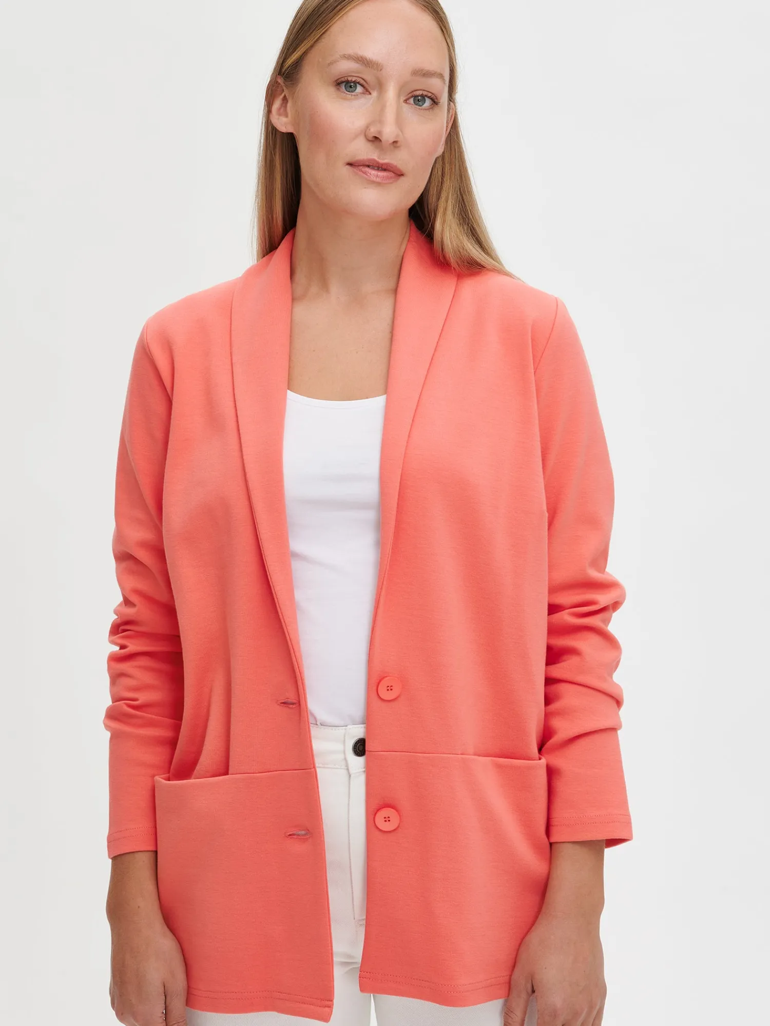 Naisten tyylikäs punainen Leija-jakku. Klassinen tummansininen jakku sopii jokaiseen asuun. Luo rennon tyylikäs asukokonaisuus yhdistämällä jakku farkkujen ja t-paidan pariksi. Jakussa on kaulus, edessä nappikiinnitys ja rintamuotolaskokset. Hihat ovat täyspitkät. Edessä olevaan poikkisaumaan on upotettu taskut. Jakun pituus koossa M on noin 73 cm. Materiaali on miellyttävän tuntuista, paksumpaa interlock-neulosta.
