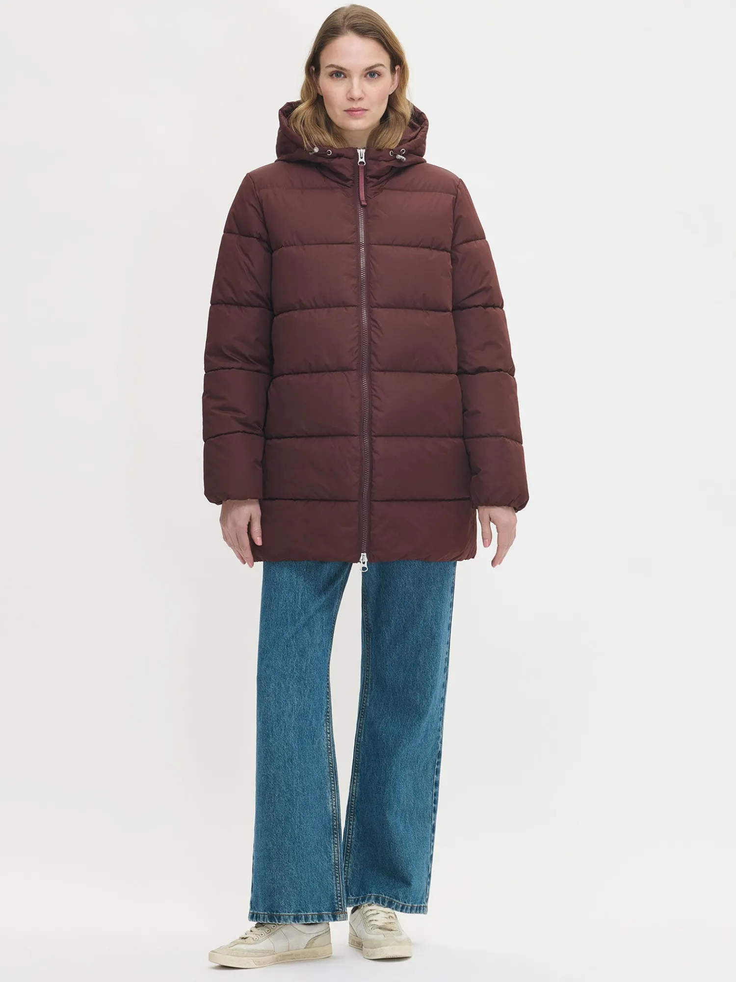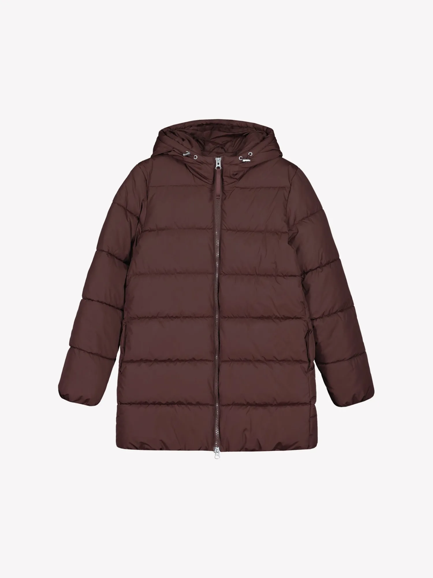 Lämmin ja muhkea tummanruskea Lumi-toppatakki miellyttävän kevyellä vanuvuorella. Takissa on lämmin huppu, jossa kiristysmahdollisuus. Hihansuissa ja helmassa on kuminauhareunus. Takissa on sivutaskut ja tuulilistallinen kaksisuuntainen vetoketjukiinnitys. Takin pituus koossa M on noin 85 cm. Materiaali on laadukasta, vettähylkivää ja kierrätyspolyesteria. Takissa on Sorona-vanu.