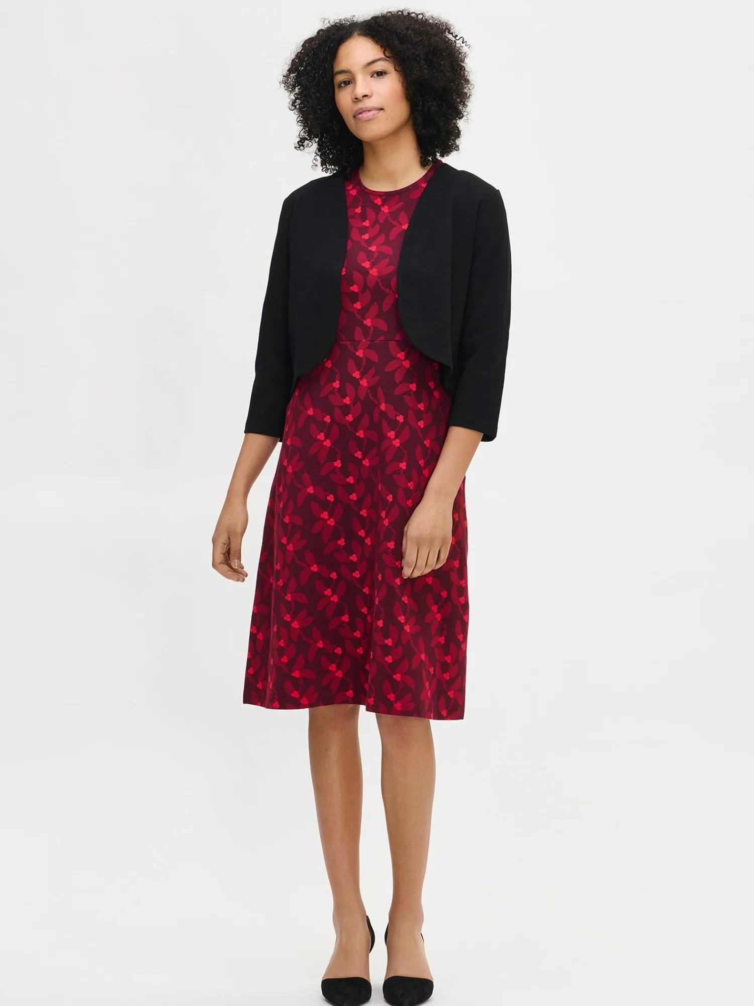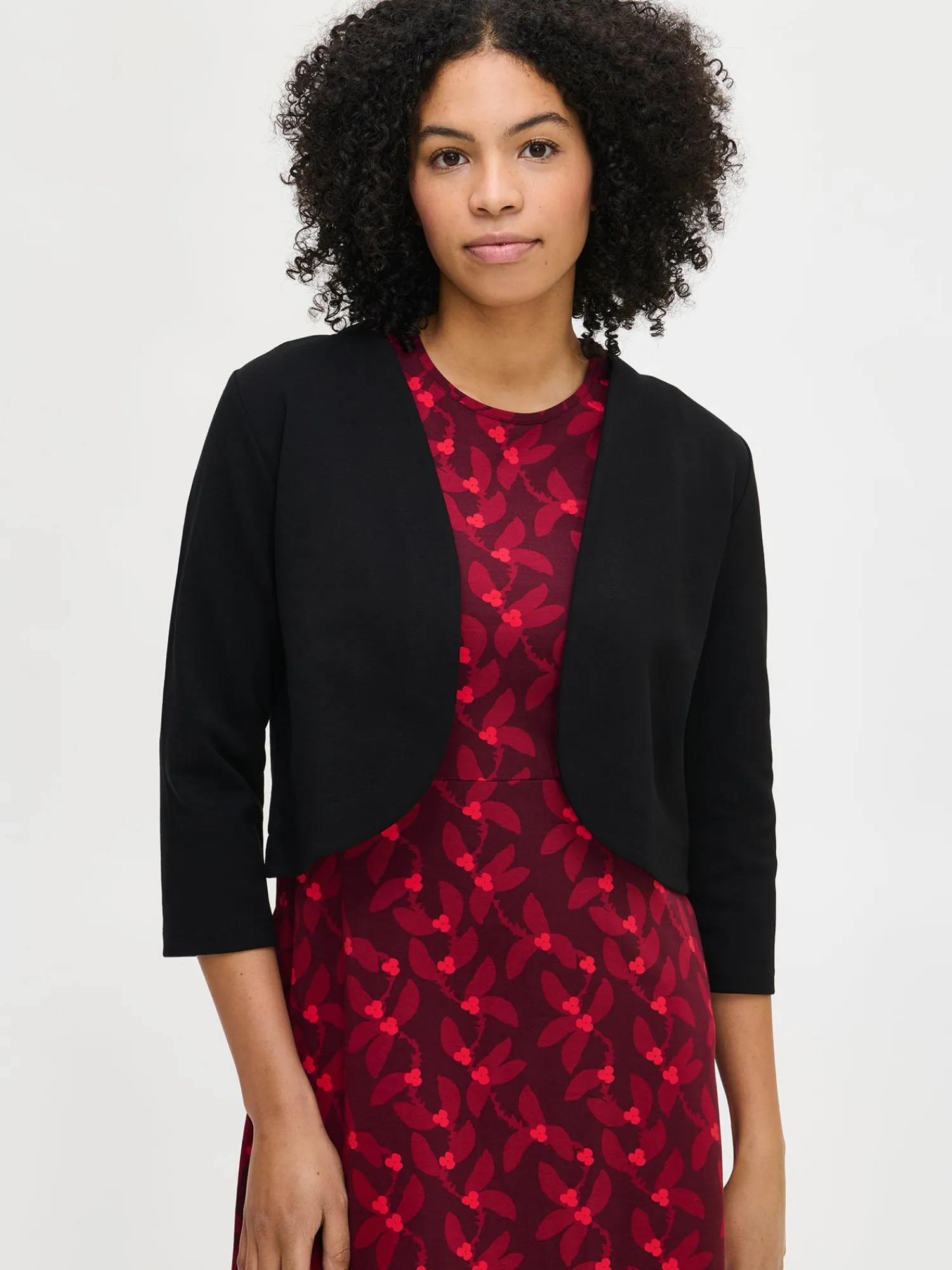 Naisten yksivärinen Opera-bolero. Boleron pääntie ja helma on huoliteltu alavaralla, helma on hieman kaareva ja hihat ovat 3/4 pituiset. Boleron pituus koossa M on noin 50 cm. Materiaali on miellyttävän tuntuista, paksumpaa interlock-neulosta. Ajaton ja monikäyttöinen bolero viimeistelee asun kauniisti.