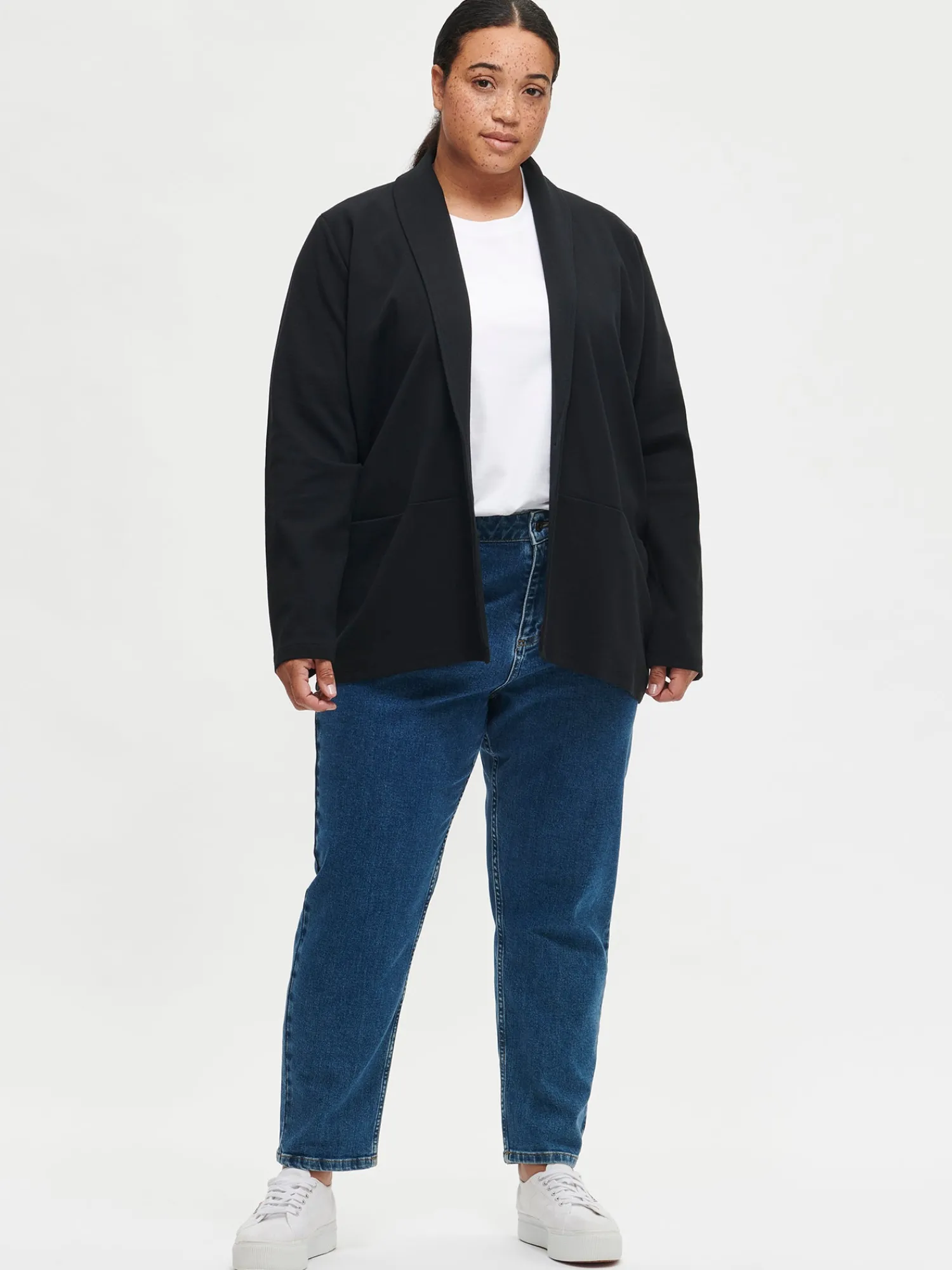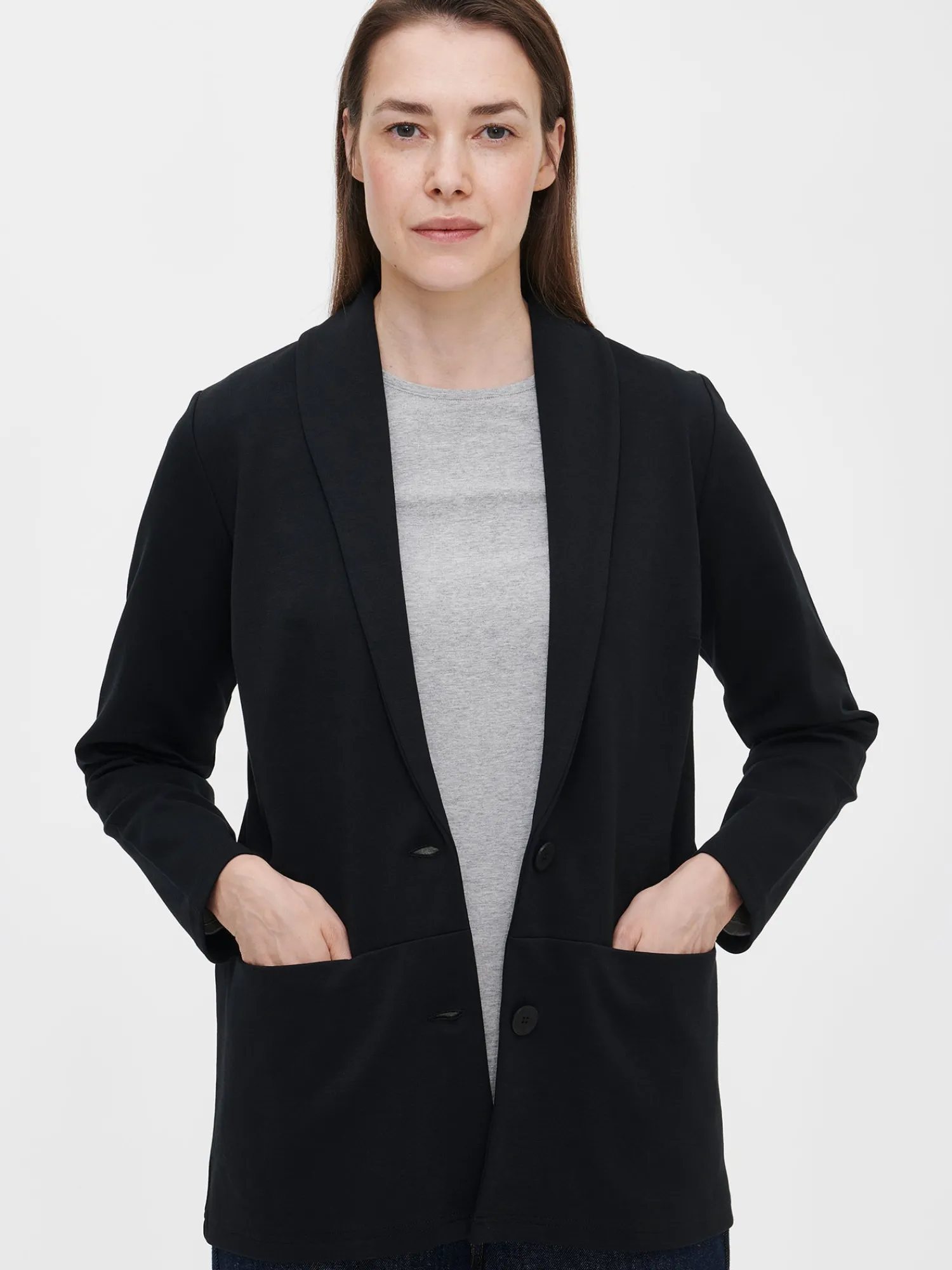 Naisten tyylikäs musta Leija-jakku. Ajaton musta jakku on helppo yhdistää eriväristen hameiden, housujen tai mekkojen pariksi. Jakussa on kaulus, edessä nappikiinnitys ja rintamuotolaskokset. Hihat ovat täyspitkät. Edessä olevaan poikkisaumaan on upotettu taskut. Jakun pituus koossa M on noin 73 cm. Materiaali on miellyttävän tuntuista, paksumpaa interlock-neulosta.