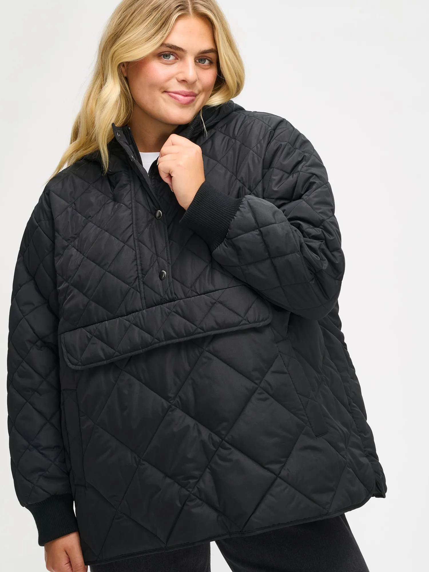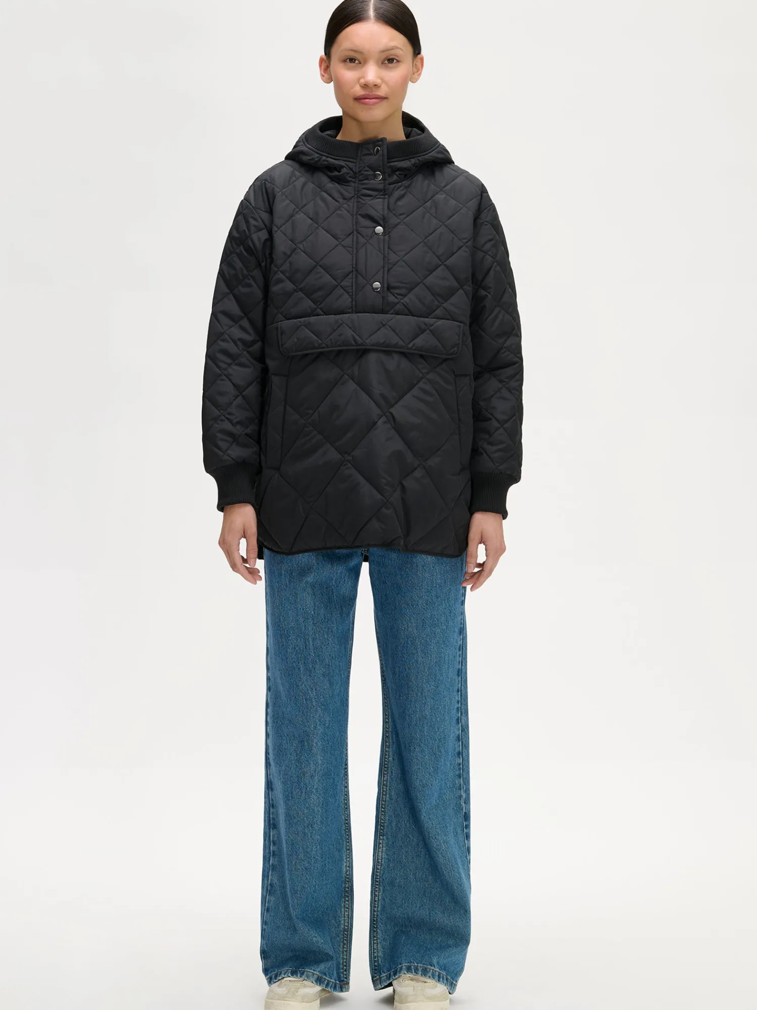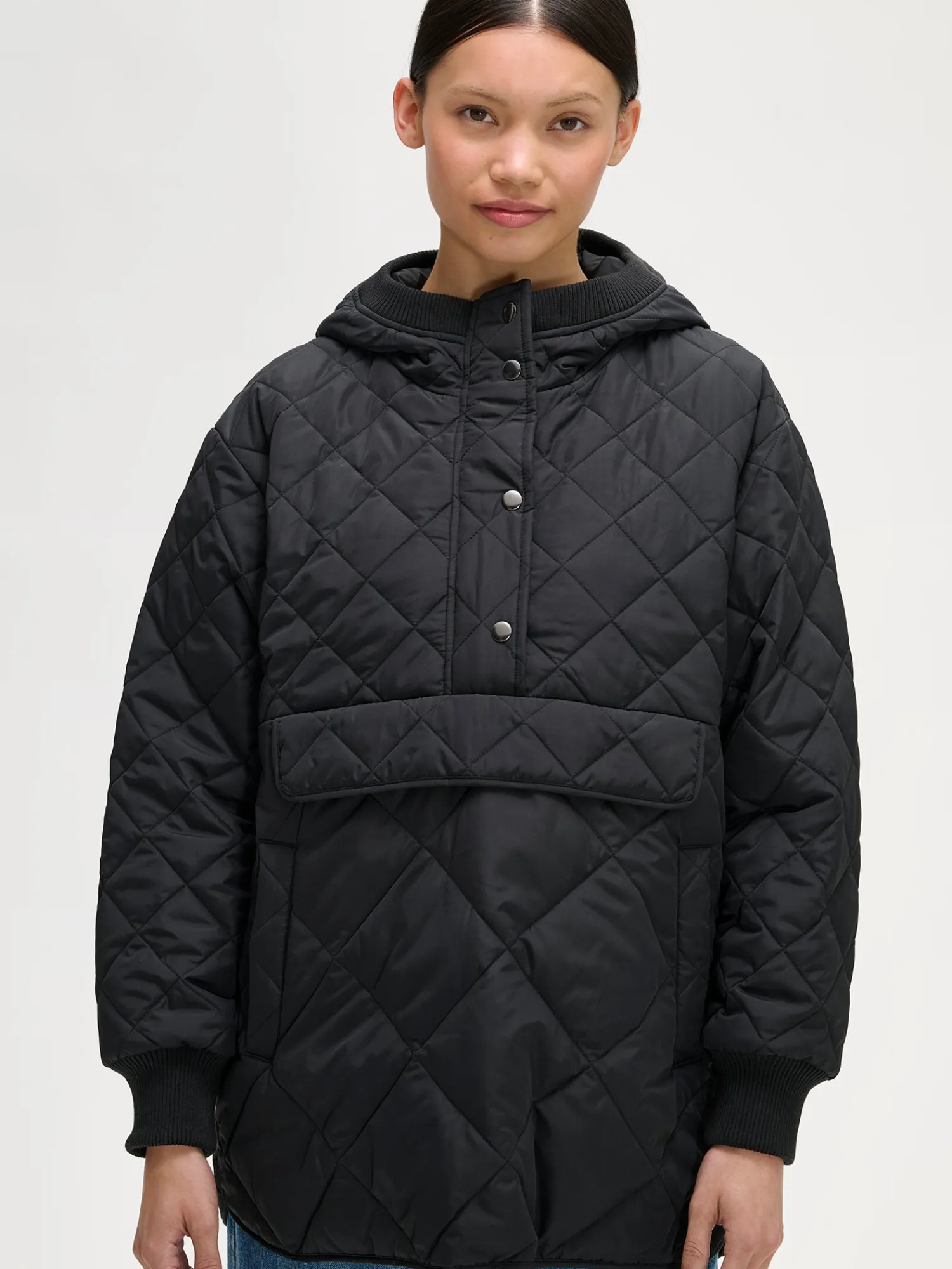 Naisten rento musta Anorakki-tikkitakki kevyellä Sorona-vanulla. Hupullisessa A-linjaisessa takissa on edessä puolipitkä vetoketju ja nepparikiinnitteinen tuulilista. Takissa on kaksi taskua edessä: kengurutasku vetokejulla ja listatasku, joka on auki molemmilta sivuilta. Hupun reunassa ja hihansuissa on mukava neulosresori. Takissa on pudotettu olkalinja ja pyöristetty helma. Takin pituus koossa M on noin 75 cm. Materiaali on laadukasta vettähylkivää kierrätyspolyesteria ja takissa on Sorona-vanu.