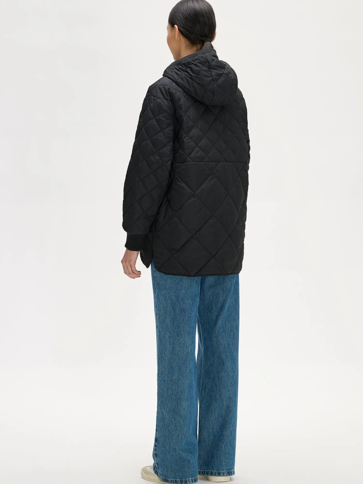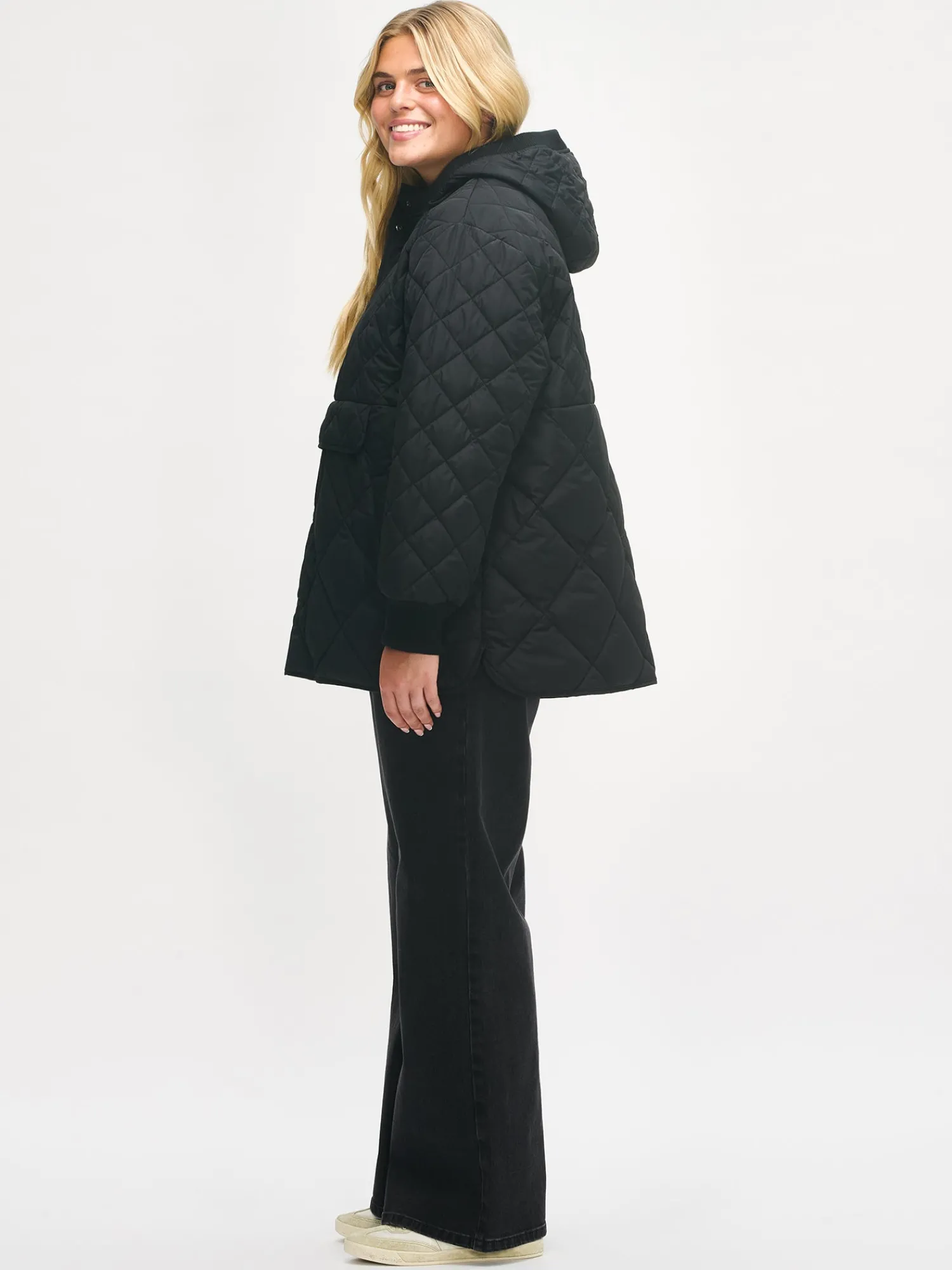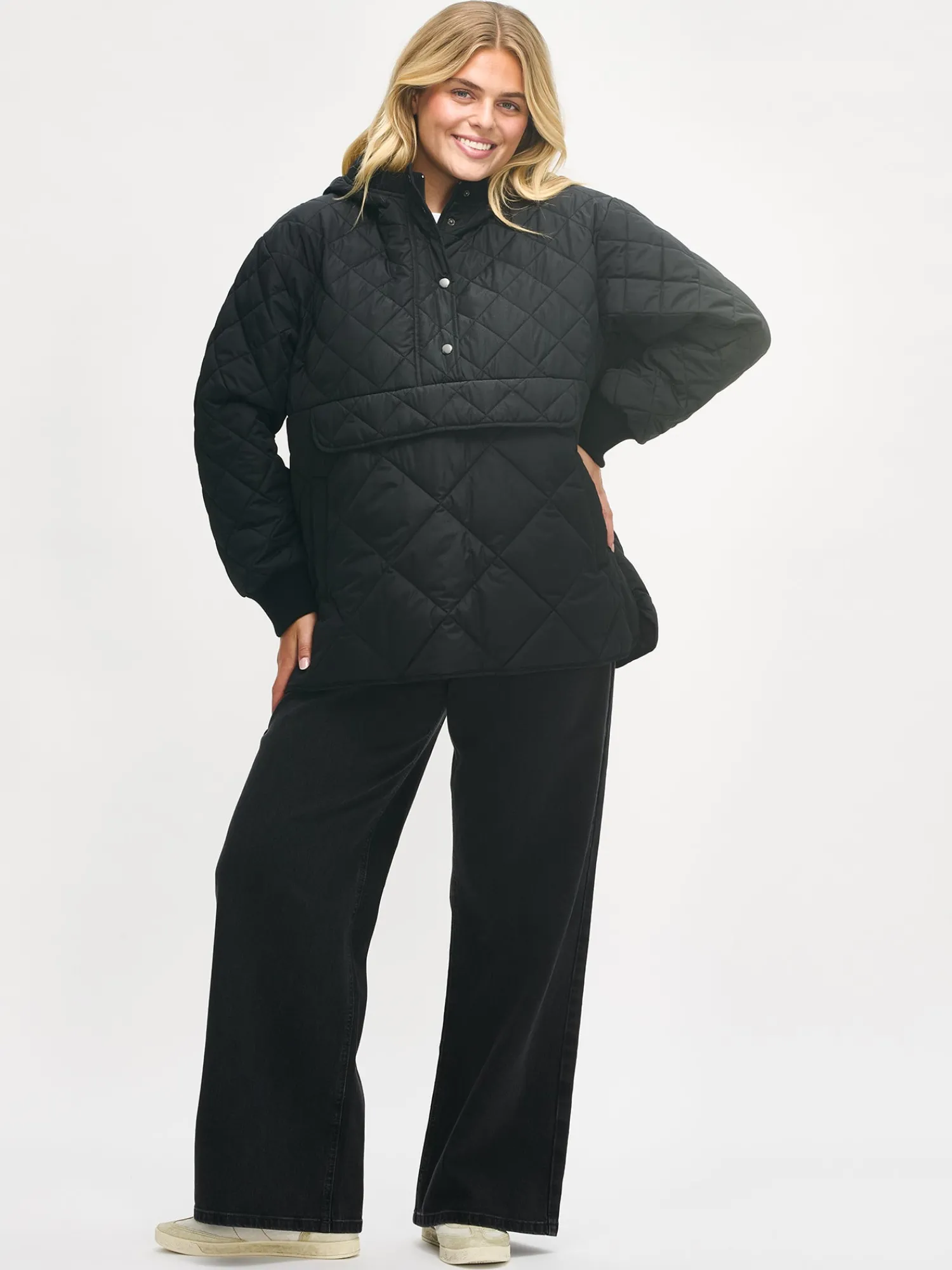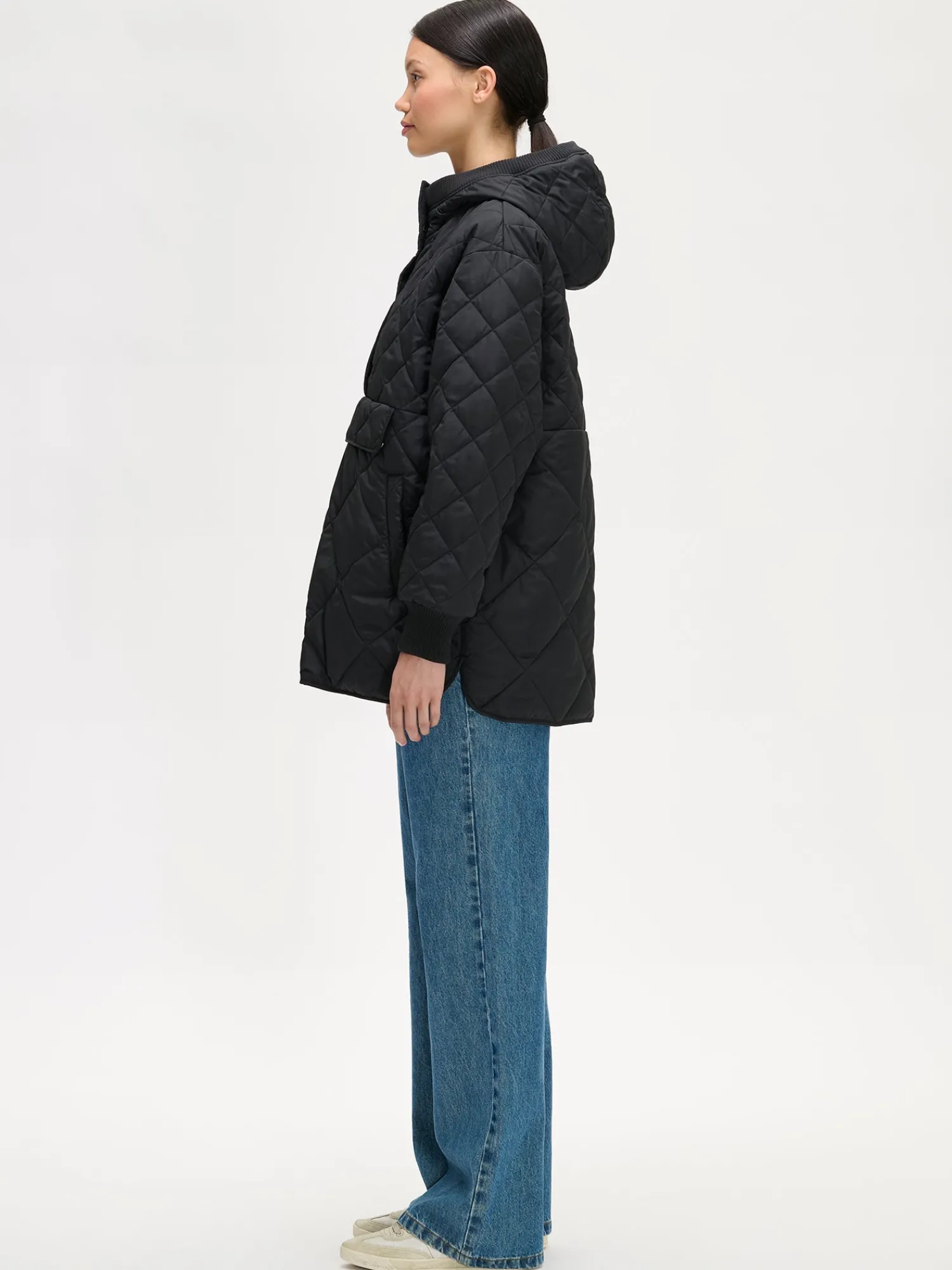 Naisten rento musta Anorakki-tikkitakki kevyellä Sorona-vanulla. Hupullisessa A-linjaisessa takissa on edessä puolipitkä vetoketju ja nepparikiinnitteinen tuulilista. Takissa on kaksi taskua edessä: kengurutasku vetokejulla ja listatasku, joka on auki molemmilta sivuilta. Hupun reunassa ja hihansuissa on mukava neulosresori. Takissa on pudotettu olkalinja ja pyöristetty helma. Takin pituus koossa M on noin 75 cm. Materiaali on laadukasta vettähylkivää kierrätyspolyesteria ja takissa on Sorona-vanu.