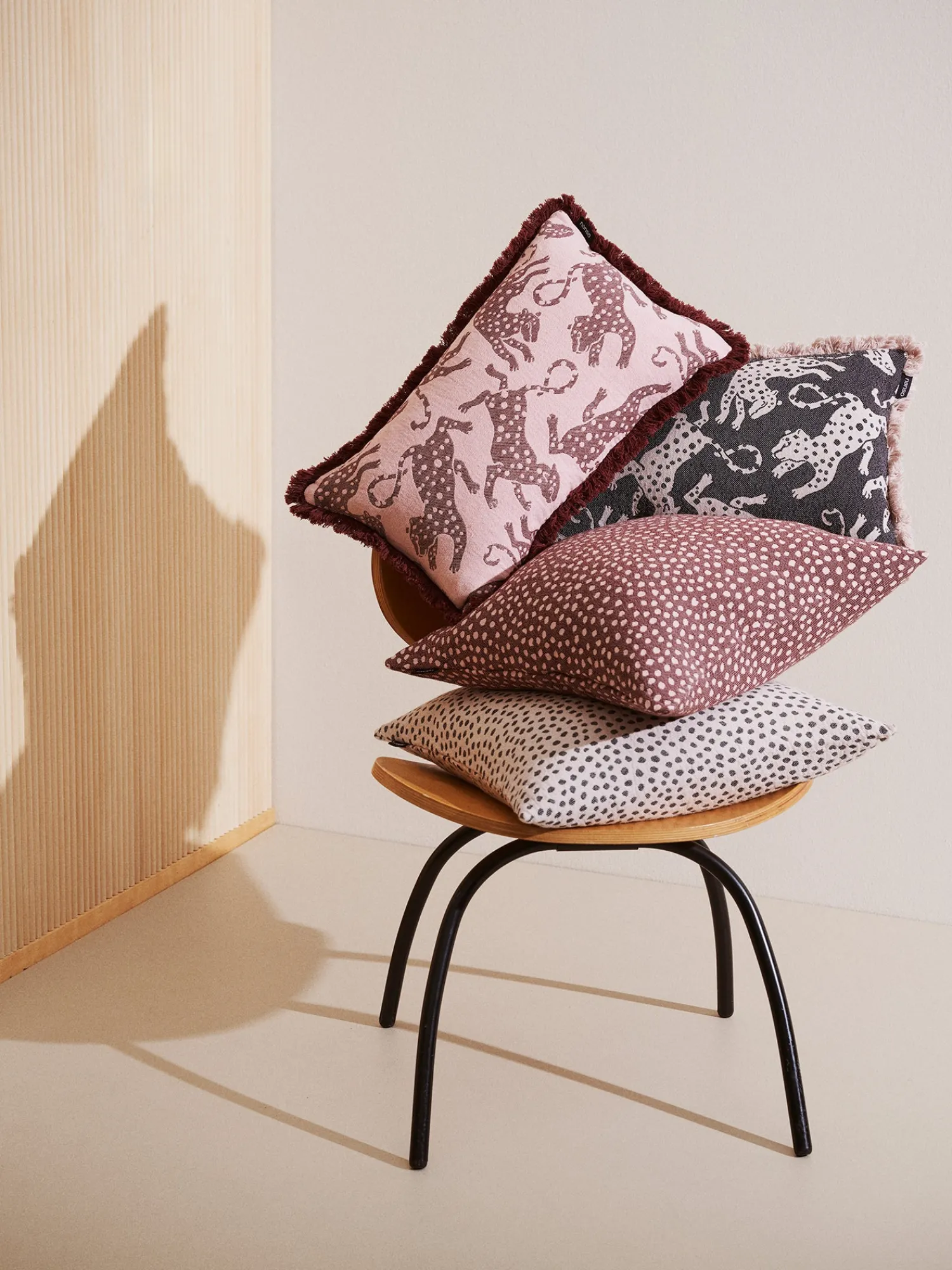 Leopardikuvioinen Hapsu-tyynyliina vaaleanpunaisessa sävyssä on rohkea valinta, joka tuo sisustukseen näyttävää ilmettä. Kestävä puuvillamateriaali ja jacquard-kudonta takaavat laadun, kun taas reunoissa olevat punaiset hapsut viimeistelevät kokonaisuuden. Vetoketju alareunassa tekee tyynyn vaihtamisesta vaivatonta. Kompakti 50 x 30 cm koko sopii täydellisesti tuomaan särmää sisustukseen.