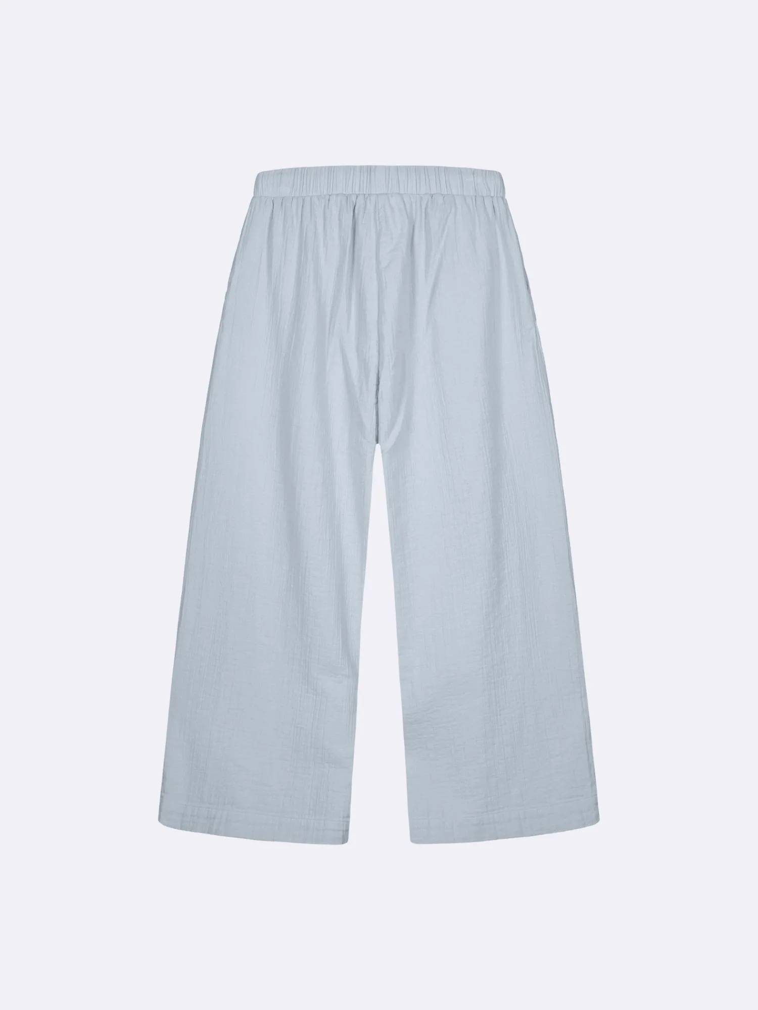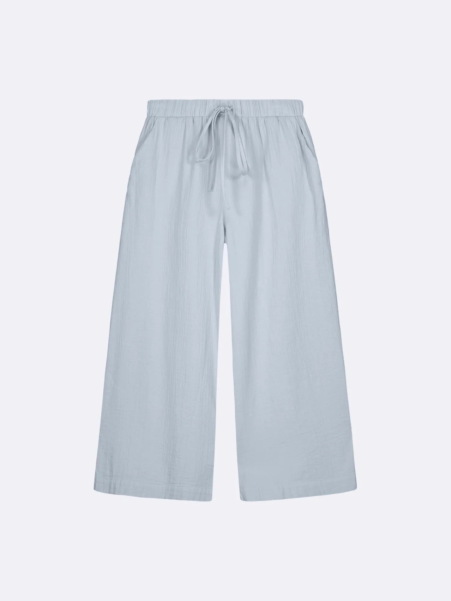 Naisten yksiväriset vaaleansiniset Aamu-housut sivutaskuilla. Vyötäröllä on mukava kuminauharakenne kiristysnauhalla. Rennot, leveälahkeiset housut ovat tyylikkäästi 7/8-pituiset. Materiaali on kevyttä kaksikerroksista pintastruktuurillista puuvillamusliini-kangasta. Nämä housut tarjoavat täydellisen yhdistelmän rentoutta ja käytännöllisyyttä. Sivutaskut lisäävät mukavuutta ja tekevät niistä ihanan valinnan päivittäisiin, kiireettömiin hetkiin kotona.