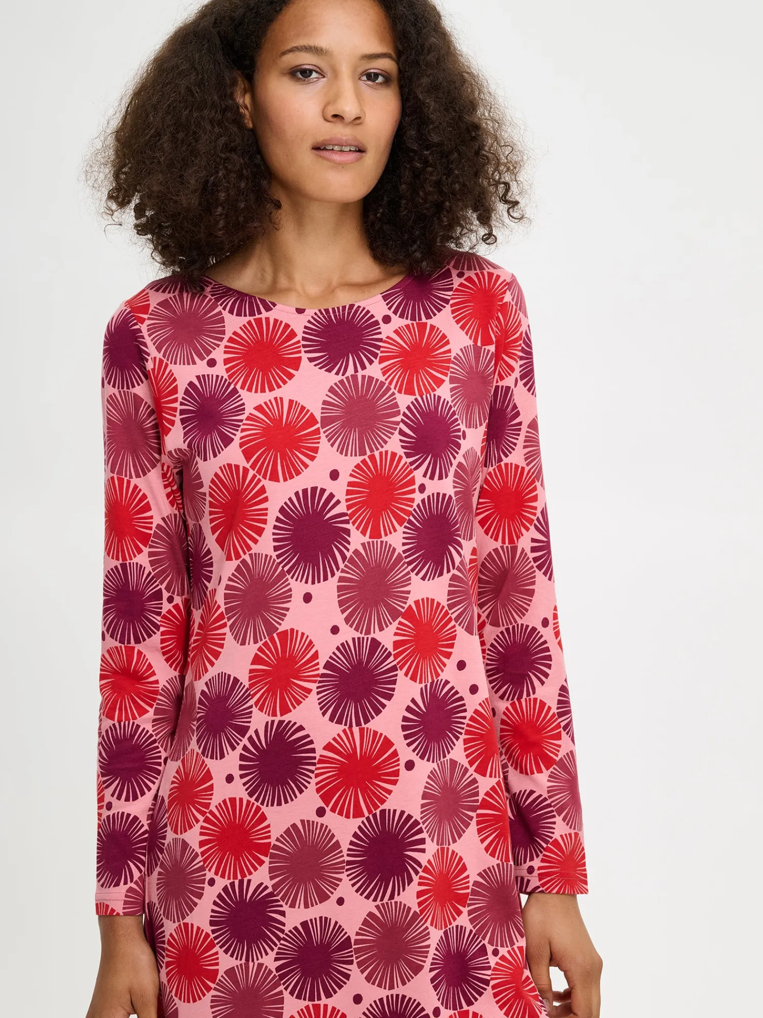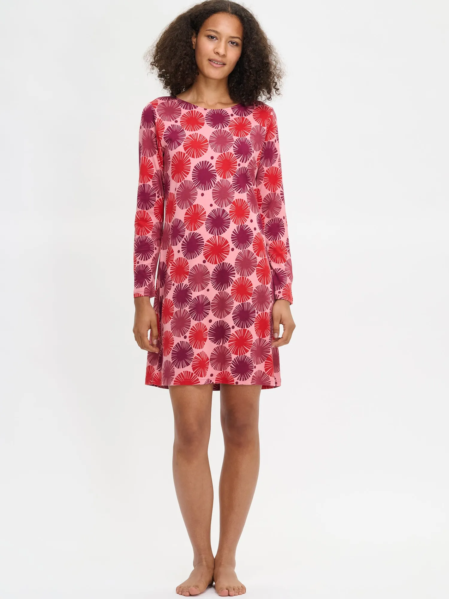Naisten kuosillinen Amara-yöpaita pitkillä hihoilla ja ovaalilla pääntiellä. Yöpaidan pituus koossa M on noin 95 cm. Materiaali on laadukasta, iholla miellyttävän pehmeältä tuntuvaa ja helppohoitoista puuvilla-modaalia, joka pysyy hyvänä pesusta toiseen. Kaunis kuosi ja pehmeä materiaali tekevät tästä yöpaidasta täydellisen valinnan rentoutumiseen ja levollisiin uniin.