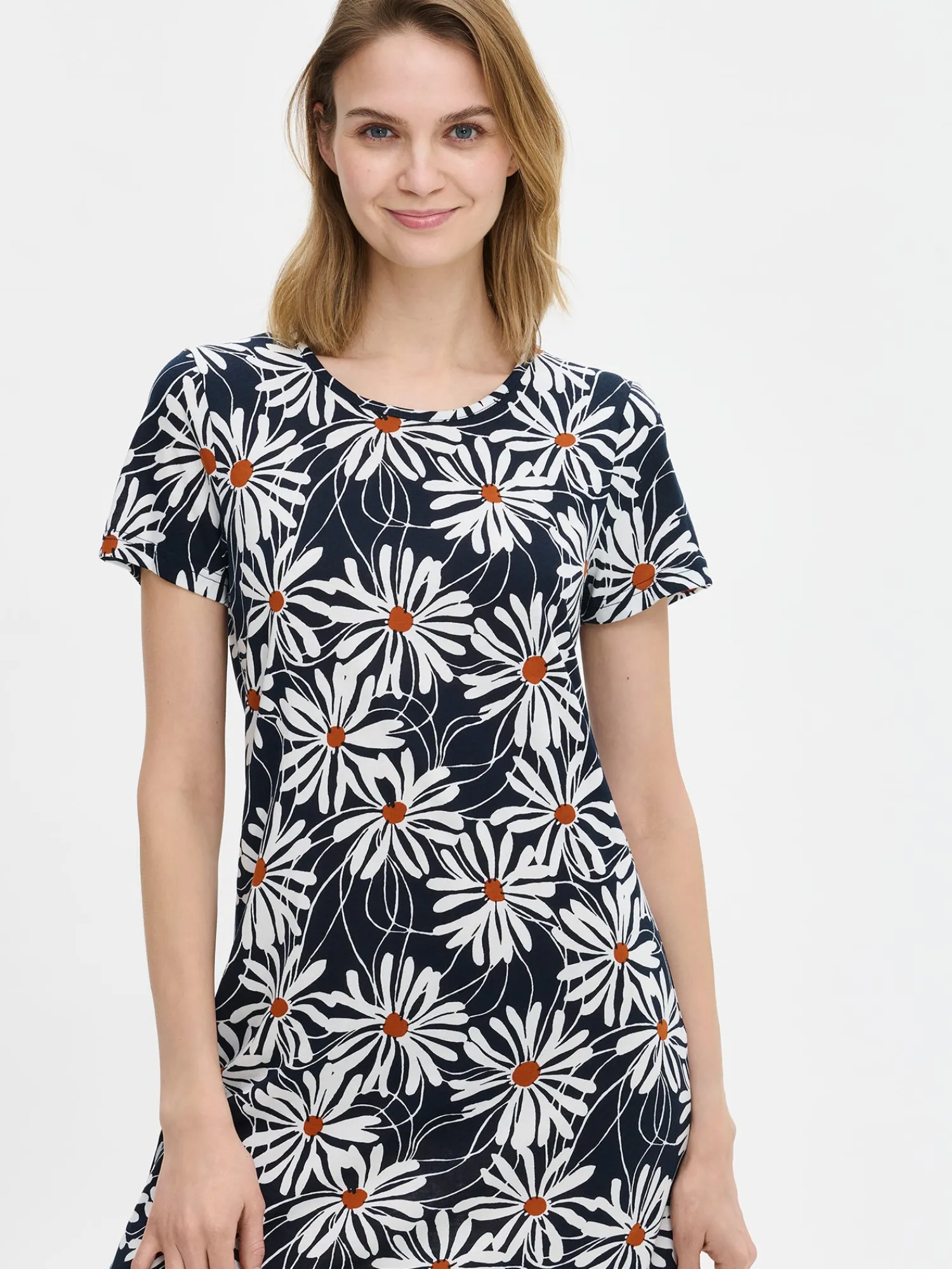 Naisten kukkakuosillinen Anette-yöpaita lyhyillä hihoilla ja pyöreällä pääntiellä sinisessä sävyssä. Yöpaidan pituus koossa M on noin 95 cm. Materiaali on laadukasta, iholla miellyttävän pehmeältä tuntuvaa ja helppohoitoista puuvilla-modaalia, joka pysyy hyvänä pesusta toiseen.