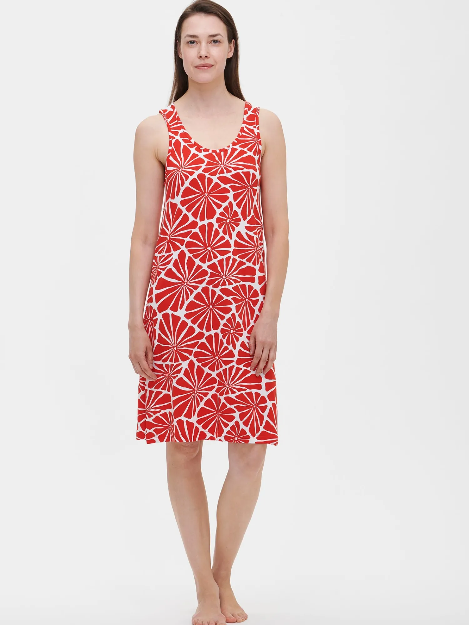 Naisten kuosillinen punainen Aralia-yöpaita pyöreällä pääntiellä. Hihattoman mekon pituus koossa M on noin 95 cm. Materiaali on laadukasta, iholla miellyttävän pehmeältä tuntuvaa ja helppohoitoista puuvilla-modaalia, joka pysyy hyvänä pesusta toiseen.