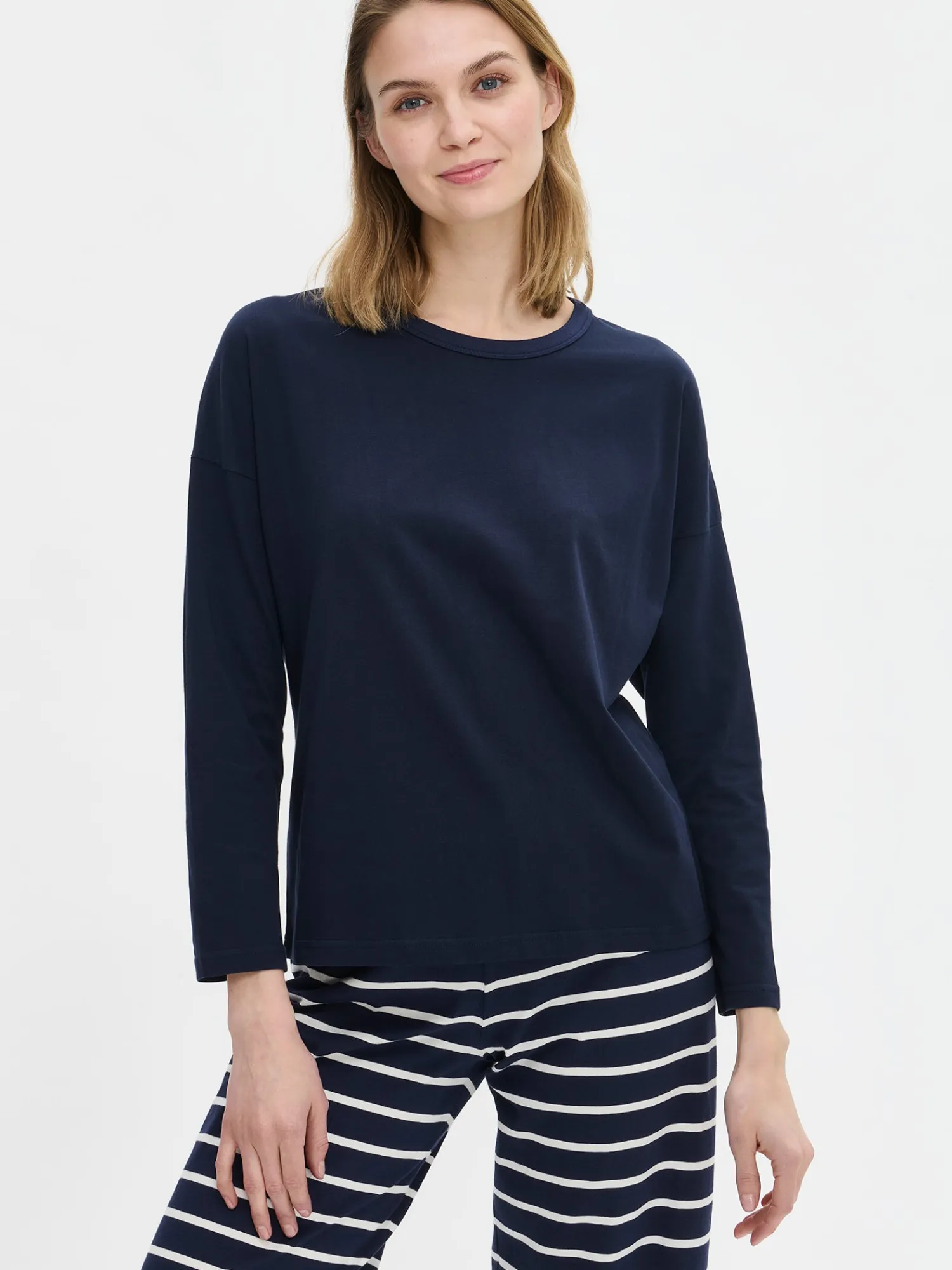 Naisten yksivärinen Duetto-paita tummansinisenä. Paidassa on pudotettu olka ja täyspitkät, väljät suoralinjaiset hihat. Rennon paidan pääntie on viimeistelty kantilla. Paidan pituus koossa M on noin 65 cm. Materiaali on laadukasta, iholla miellyttävän pehmeältä tuntuvaa ja helppohoitoista puuvillaneulosta, joka pysyy hyvänä pesusta toiseen. Neulos on valmistettu sertifioidusta puuvillasta.