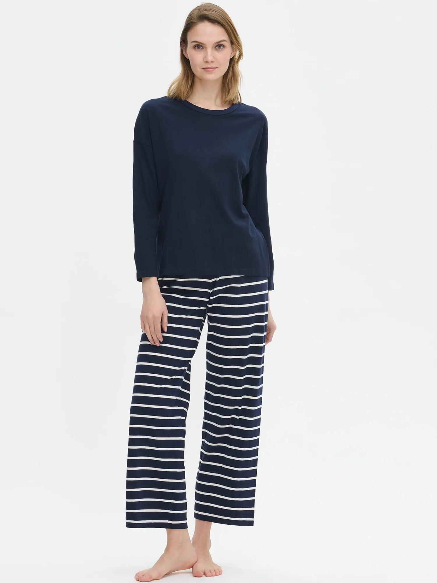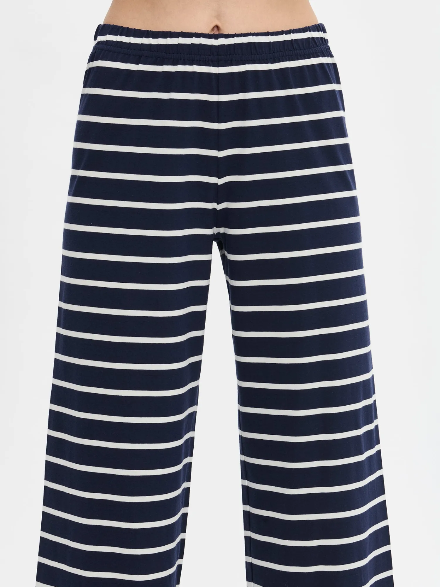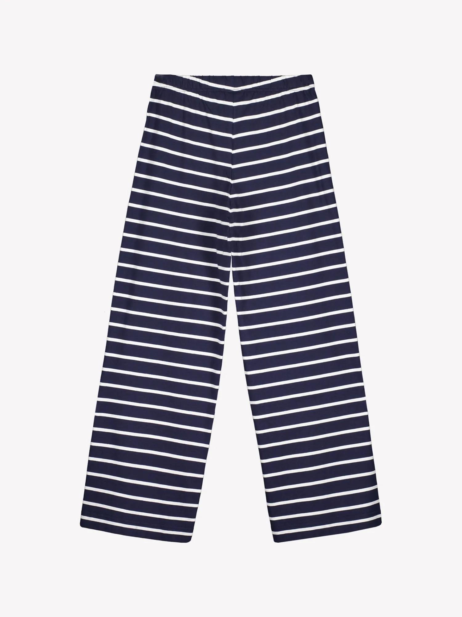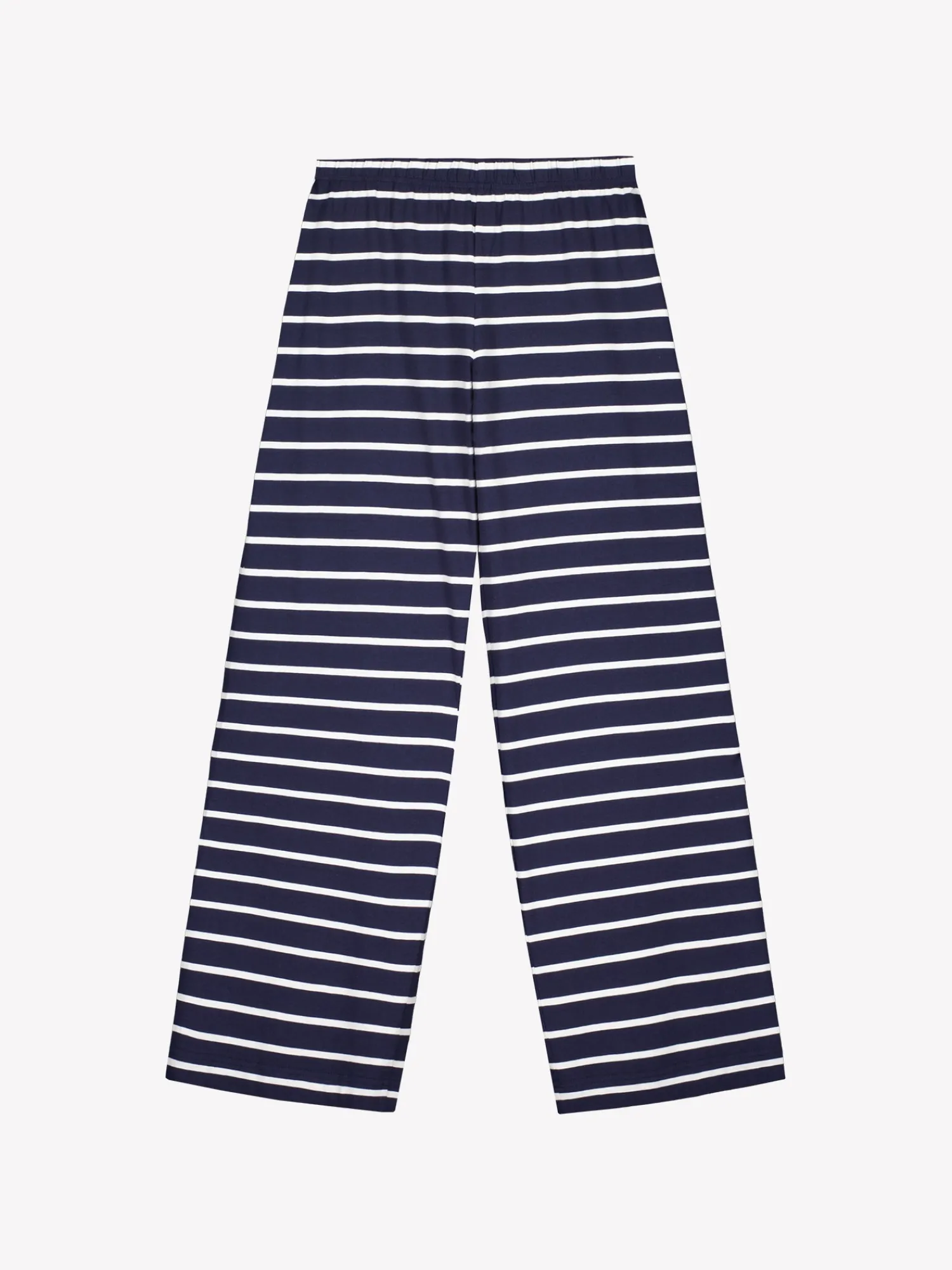 Naisten sinivalkoraidalliset Duetto-housut. Rennot housut ovat täyspitkät ja niissä on vyötäröllä mukava kuminauharakenne. Materiaali on laadukasta, iholla miellyttävän pehmeältä tuntuvaa ja helppohoitoista puuvillaneulosta, joka pysyy hyvänä pesusta toiseen. Neulos on valmistettu sertifioidusta puuvillasta.
