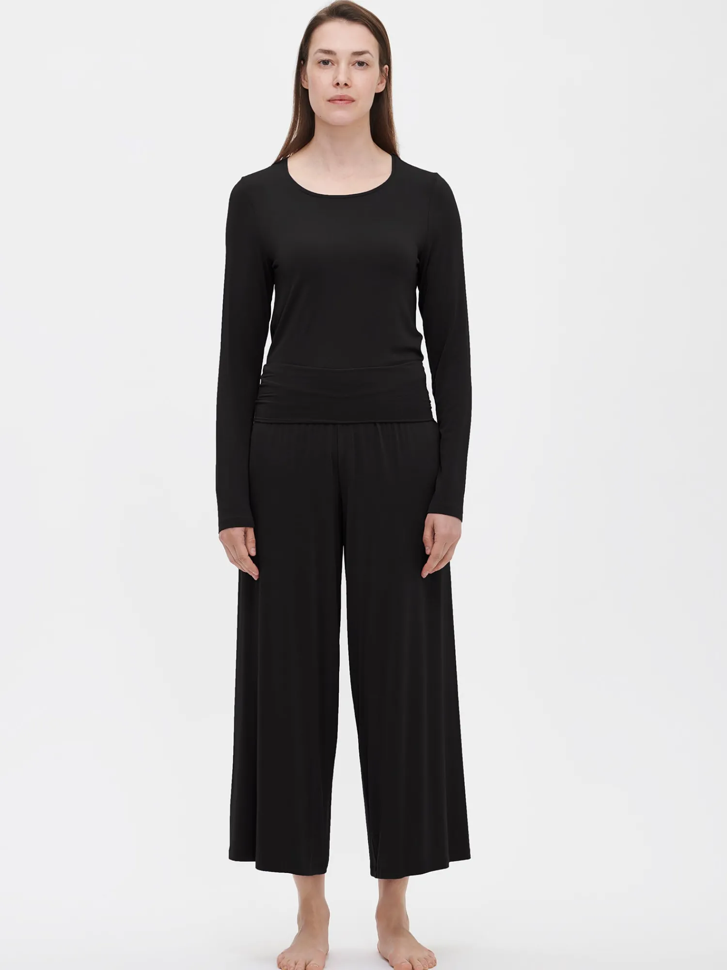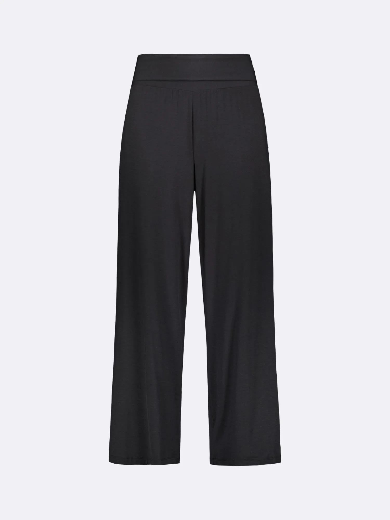 Naisten ylellisen pehmeät mustat Hento-housut. Housuissa on mukava vyötärörakenne leveällä ja tukevalla tuplakaistaleella. Rennot housut ovat tyylikkäästi 7/8-pituiset. Materiaali on laadukasta, silkkisen pehmeää modaali-elastaania, joka tarjoaa ihanan pehmeän ja joustavan tuntuman.