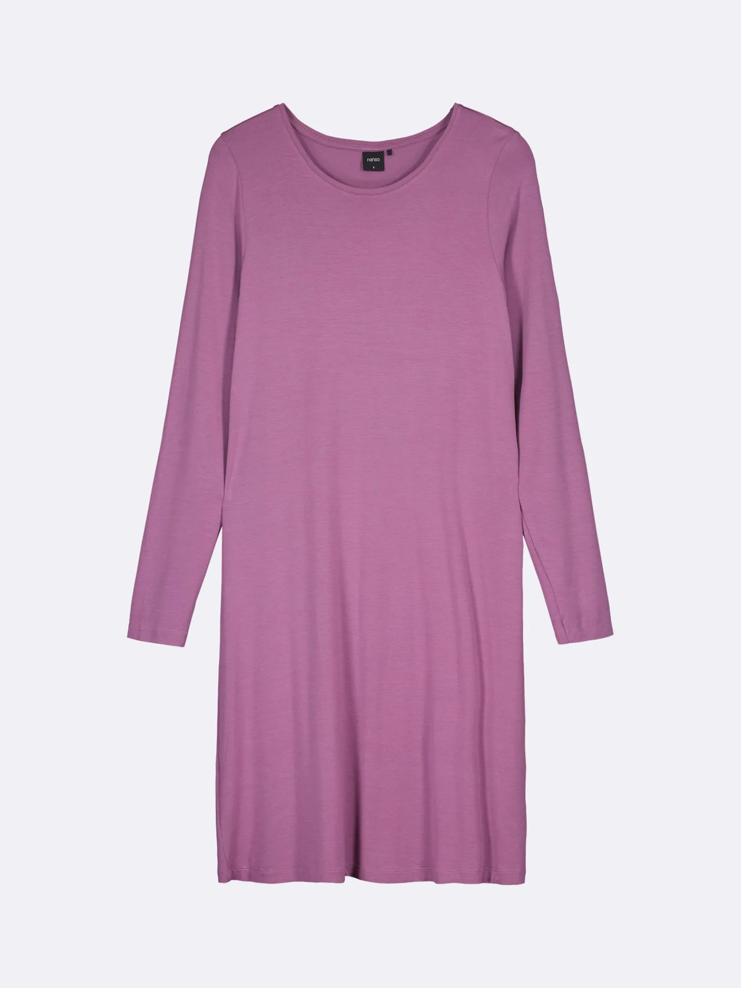 Naisten ylellisen pehmeä mauven eli vaalean violetin värinen Hento-yöpaita pitkillä hihoilla ja pyöreällä pääntiellä. Yöpaidan pituus koossa M on noin 95 cm. Materiaali on laadukasta, iholla miellyttävän pehmeältä tuntuvaa modaali-elastaania.