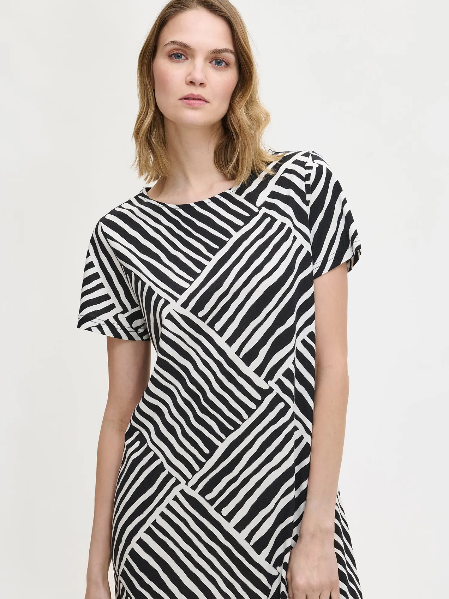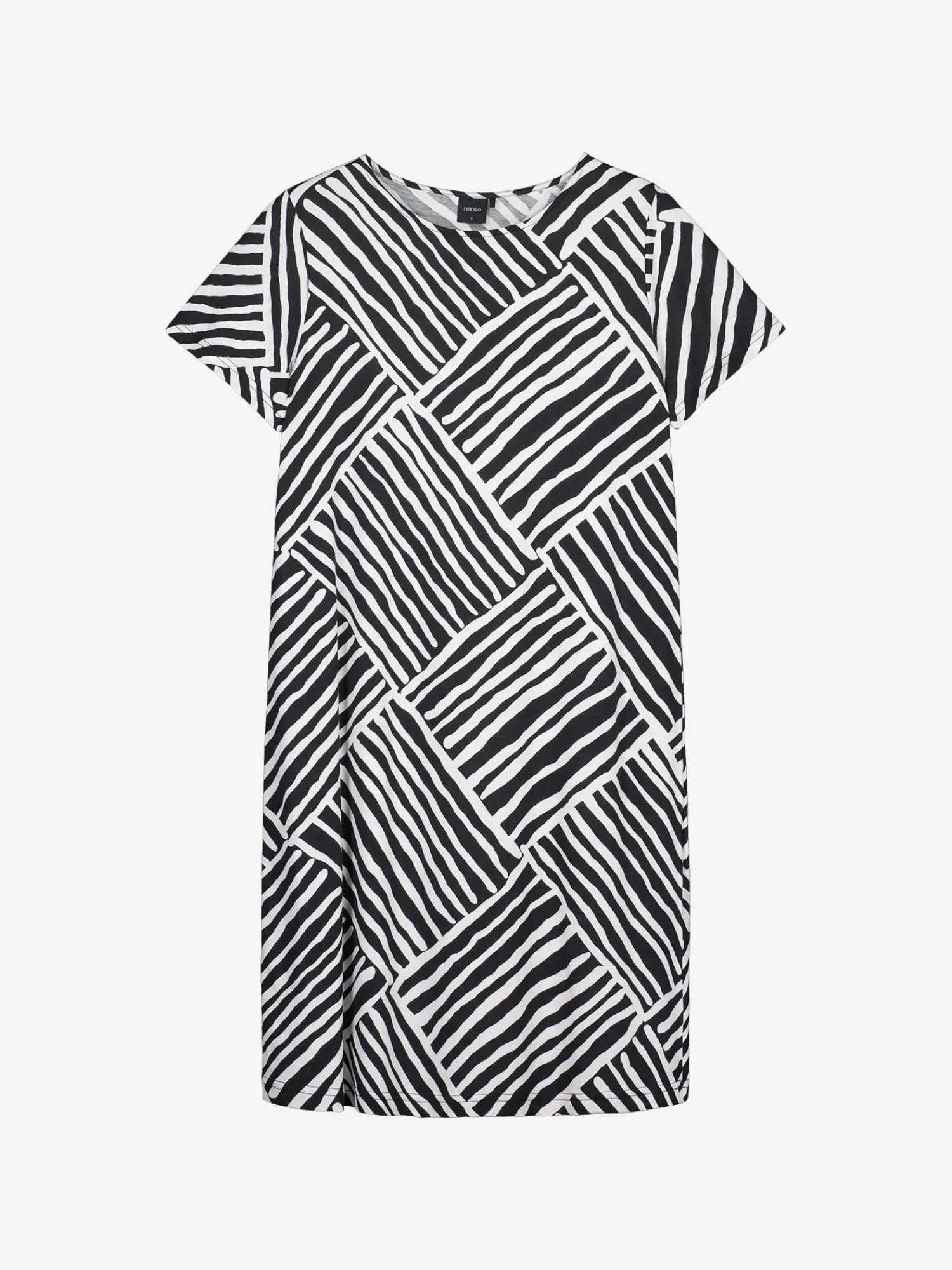 Naisten kuosillinen Kaisli-yöpaita lyhyillä hihoilla ja ovaalilla pääntiellä mustavalkoisessa värissä. Yöpaidan pituus koossa M on noin 95 cm. Materiaali on laadukasta, iholla miellyttävän pehmeältä tuntuvaa ja helppohoitoista puuvilla-modaalia, joka pysyy hyvänä pesusta toiseen.