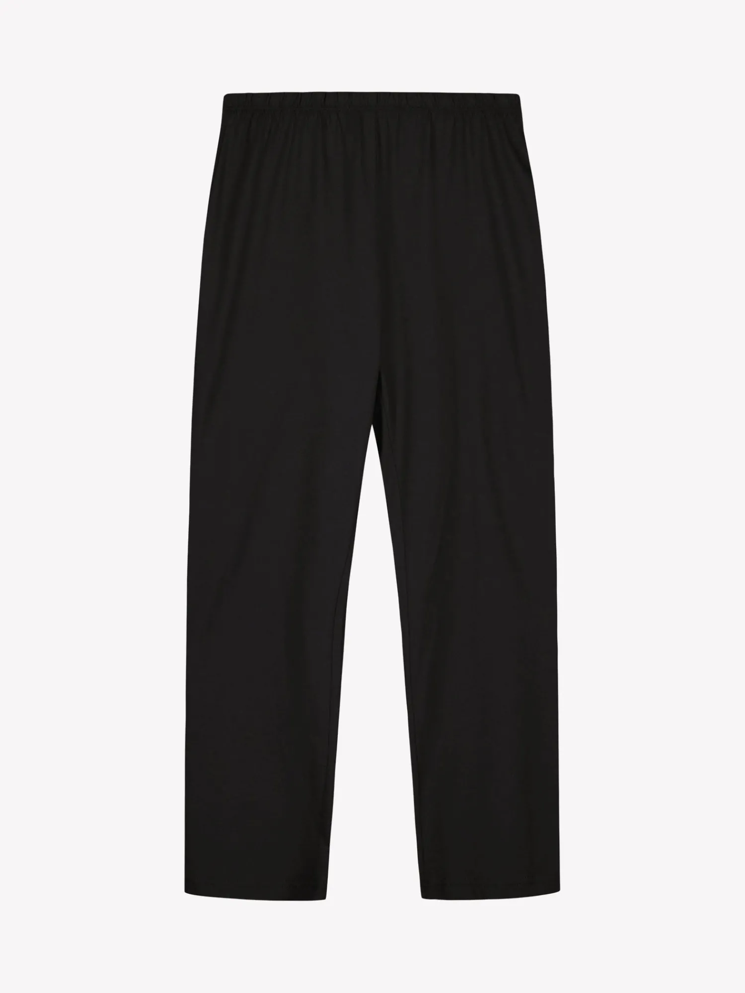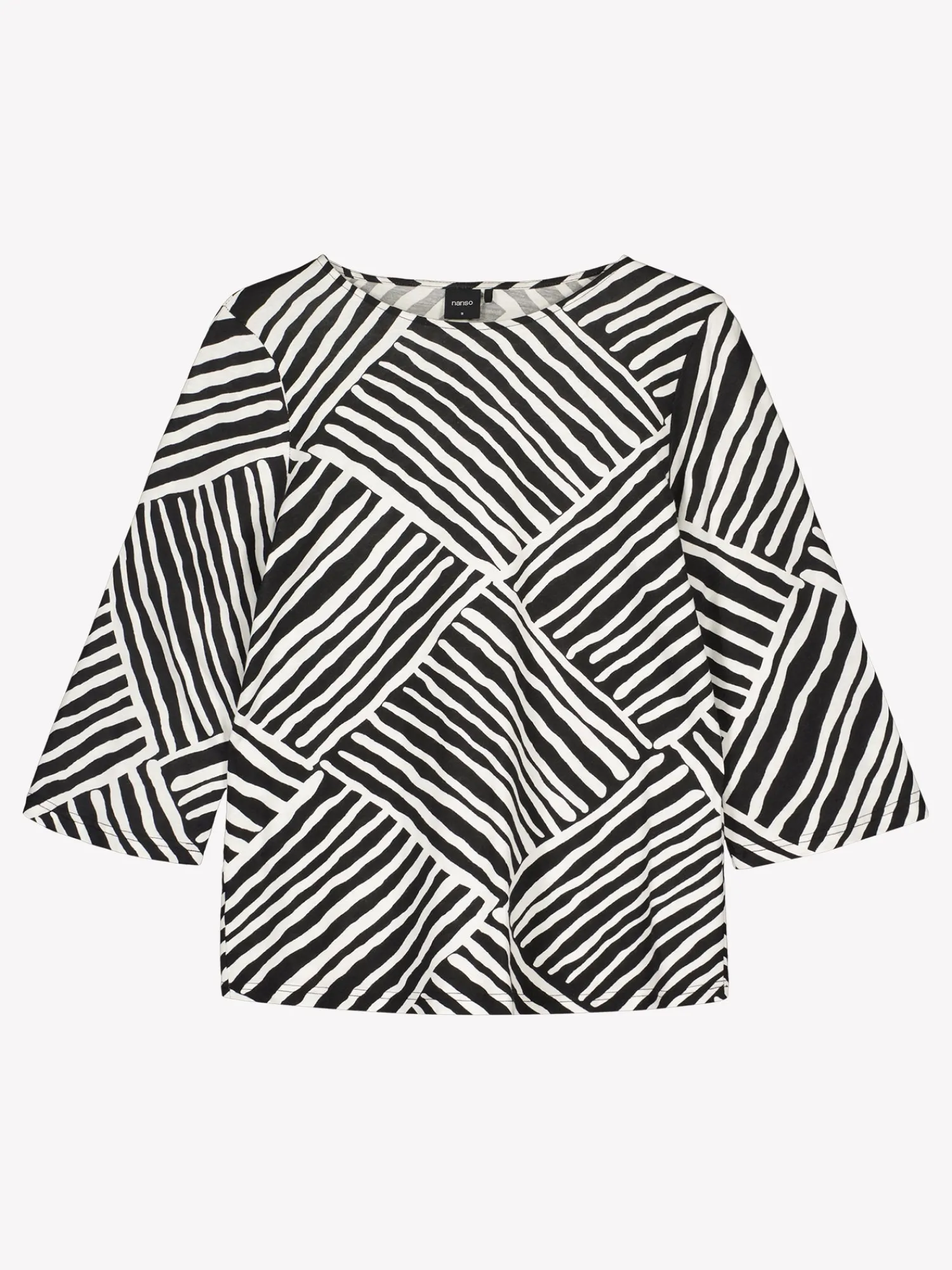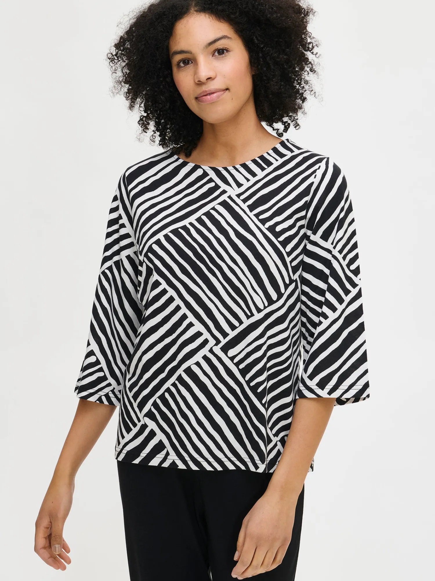 Naisten kuosillinen Kaisli-pyjamasetti mustavalkoisena. Pyjamasetin paidan hihat ovat 3/4 pituiset ja pääntie on ovaali. Yöpaidan pituus koossa M on noin 67 cm. Mustat yöhousut ovat 7/8 mittaiset. Materiaali on laadukasta, iholla miellyttävän pehmeältä tuntuvaa ja helppohoitoista puuvilla-modaalia, joka pysyy hyvänä pesusta toiseen.