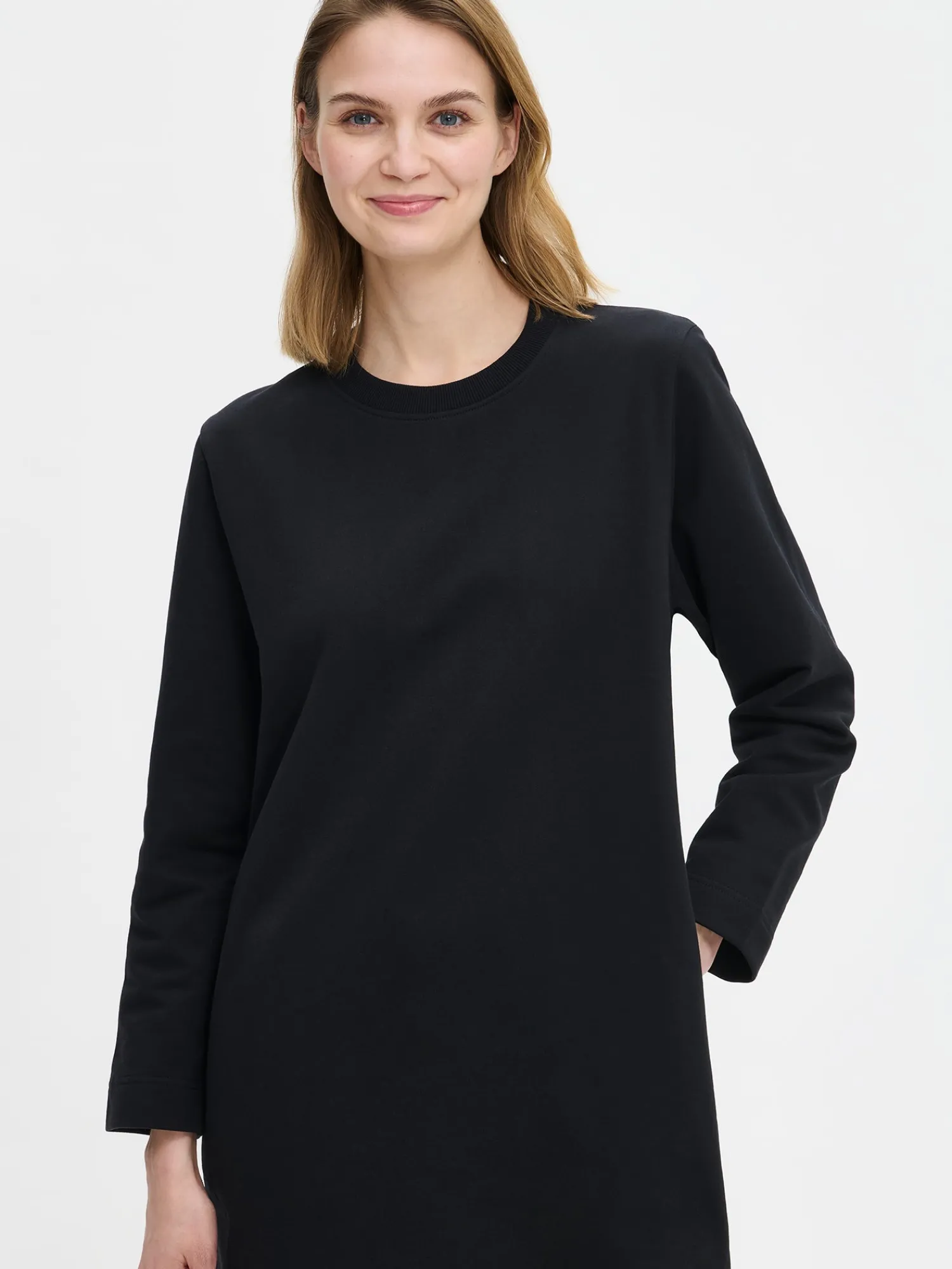 Naisten rento musta Koto-collegemekko pyöreällä pääntiellä 100 % luomupuuvillasta. Suoralinjaisessa mekossa on pudotettu olkalinja ja täyspitkät hihat. Mekosta löytyy myös sivutaskut ja sivuhalkiot helmassa. Koossa M mekon pituus on noin 100 cm. College-neuloksen sisäpinta on harjattu antaen sille pehmeän tunnun.