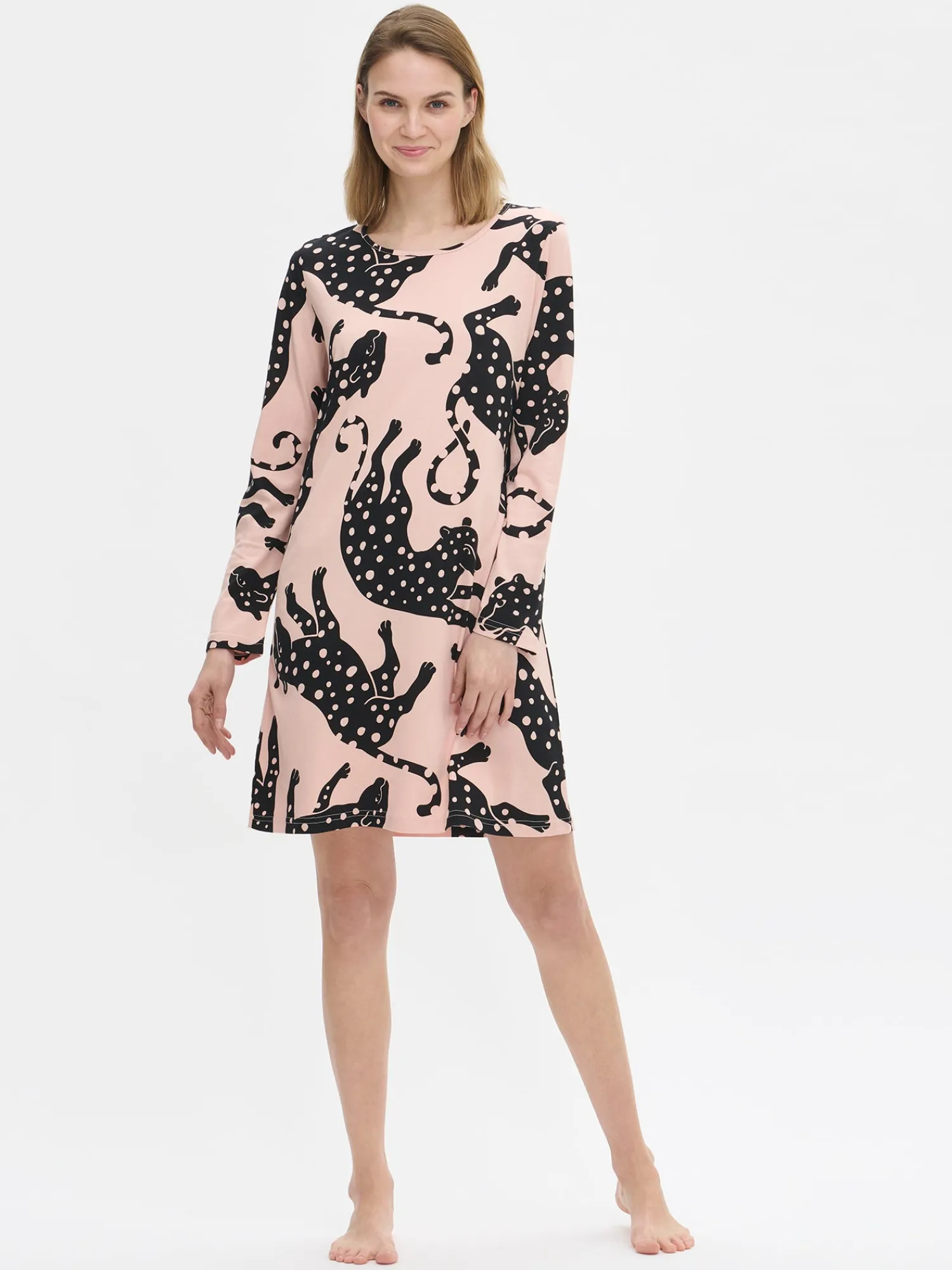 Naisten kuosillinen vaaleanpunainen Leonora-yöpaita pitkillä hihoilla ja pyöreällä pääntiellä. Yöpaidan pituus koossa M on noin 95 cm. Materiaali on laadukasta, iholla miellyttävän pehmeältä tuntuvaa ja helppohoitoista puuvilla-modaalia, joka pysyy hyvänä pesusta toiseen. Leikkisä kuosi ja klassinen malli tekevät tästä yöpaidasta mukavan valinnan rauhallisiin hetkiin kotona.