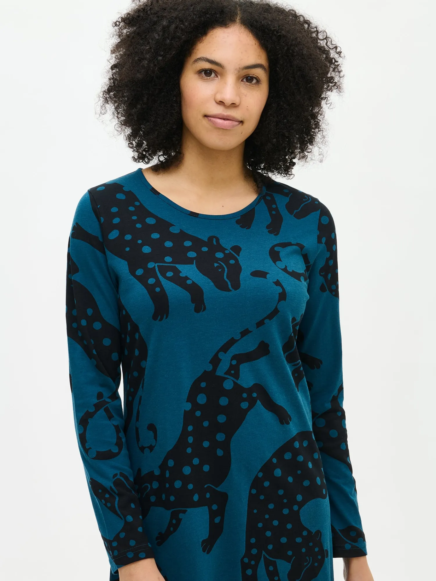 Naisten kuosillinen sininen Leonora-yöpaita pitkillä hihoilla ja pyöreällä pääntiellä. Yöpaidan pituus koossa M on noin 95 cm. Materiaali on laadukasta, iholla miellyttävän pehmeältä tuntuvaa ja helppohoitoista puuvilla-modaalia, joka pysyy hyvänä pesusta toiseen. Leikkisä kuosi ja klassinen malli tekevät tästä yöpaidasta mukavan valinnan rauhallisiin hetkiin kotona.