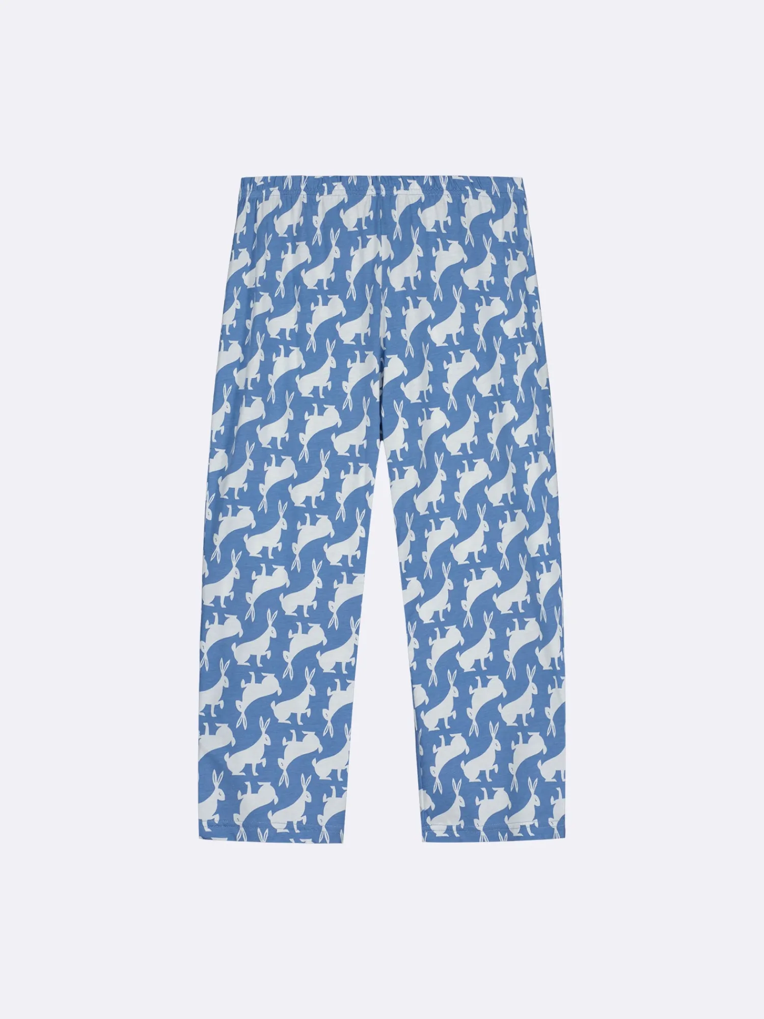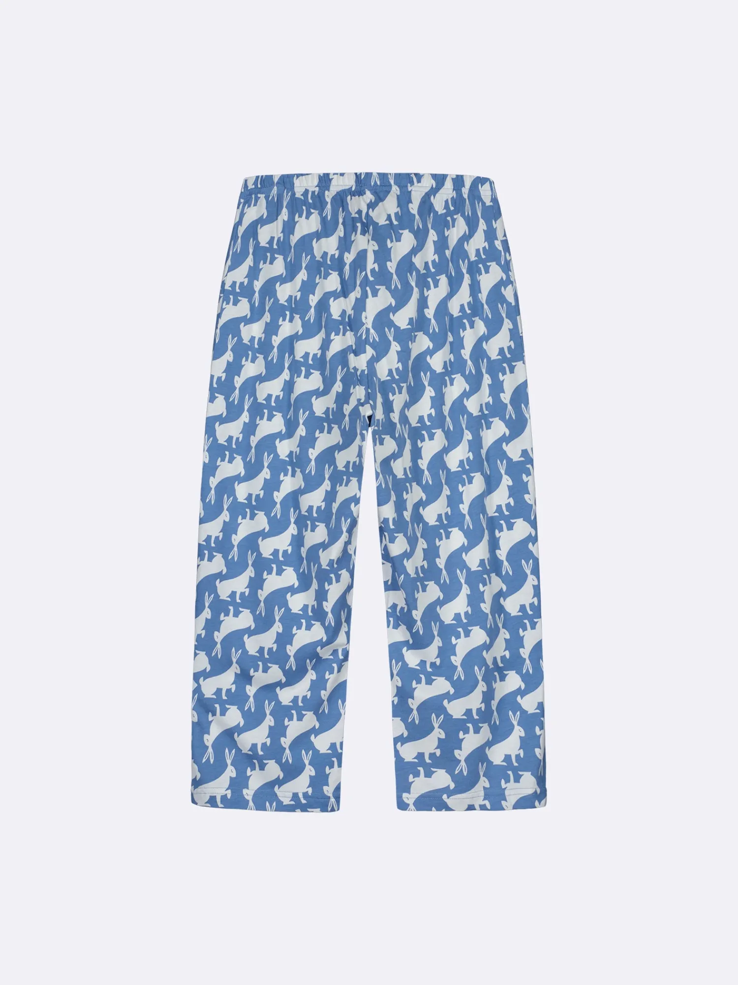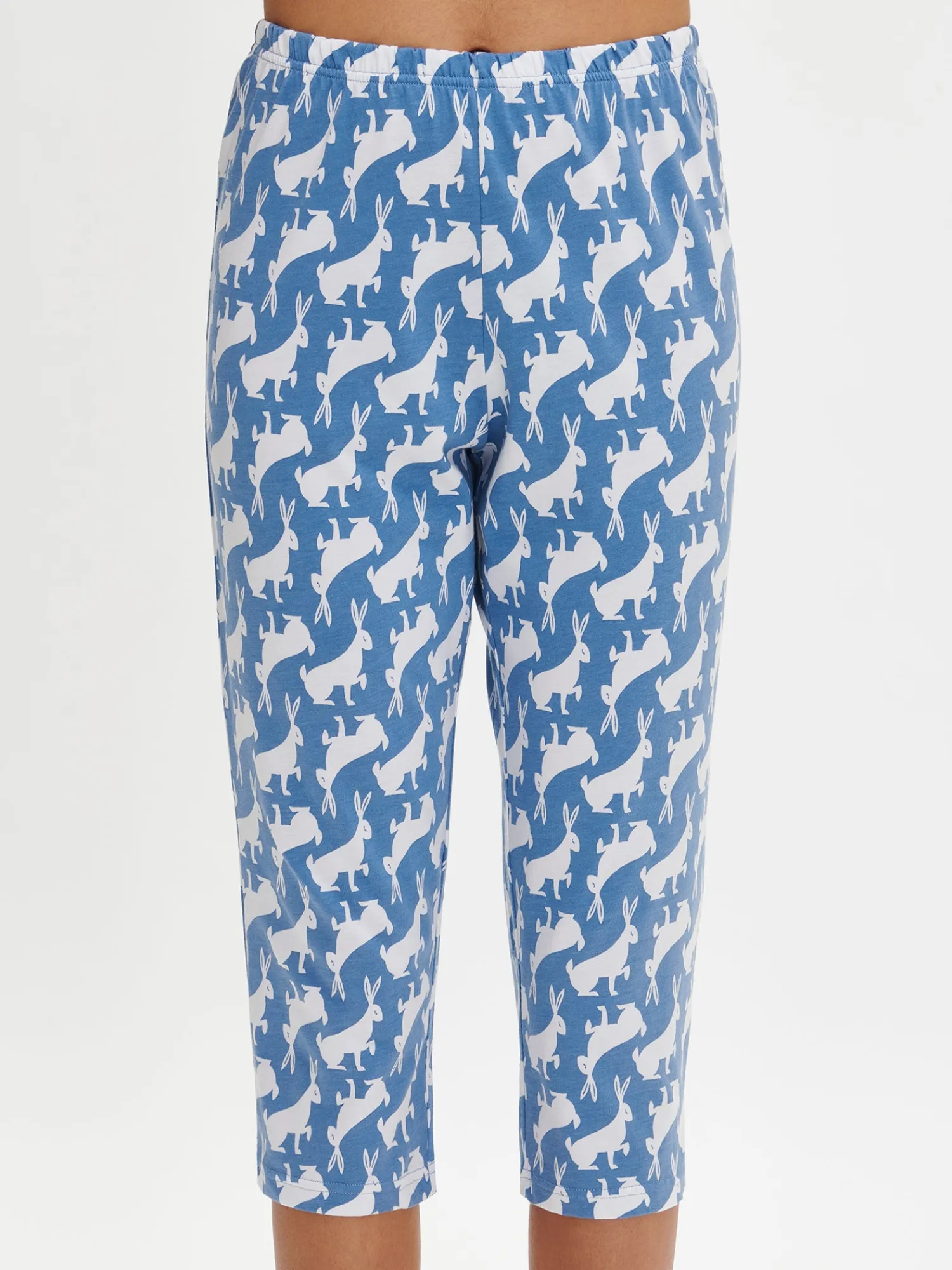 Naisten kuosilliset siniset Loikka-housut. Rennot, suoralahkeiset housut ovat 3/4-pituiset. Lahkeen sisäpituus koossa M on noin 50 cm. Materiaali on laadukasta, iholla miellyttävän pehmeältä tuntuvaa ja helppohoitoista puuvilla-modaalia, joka pysyy hyvänä pesusta toiseen. Täydellinen valinta rentoihin päiviin, joissa mukavuus ja tyyli ovat etusijalla.