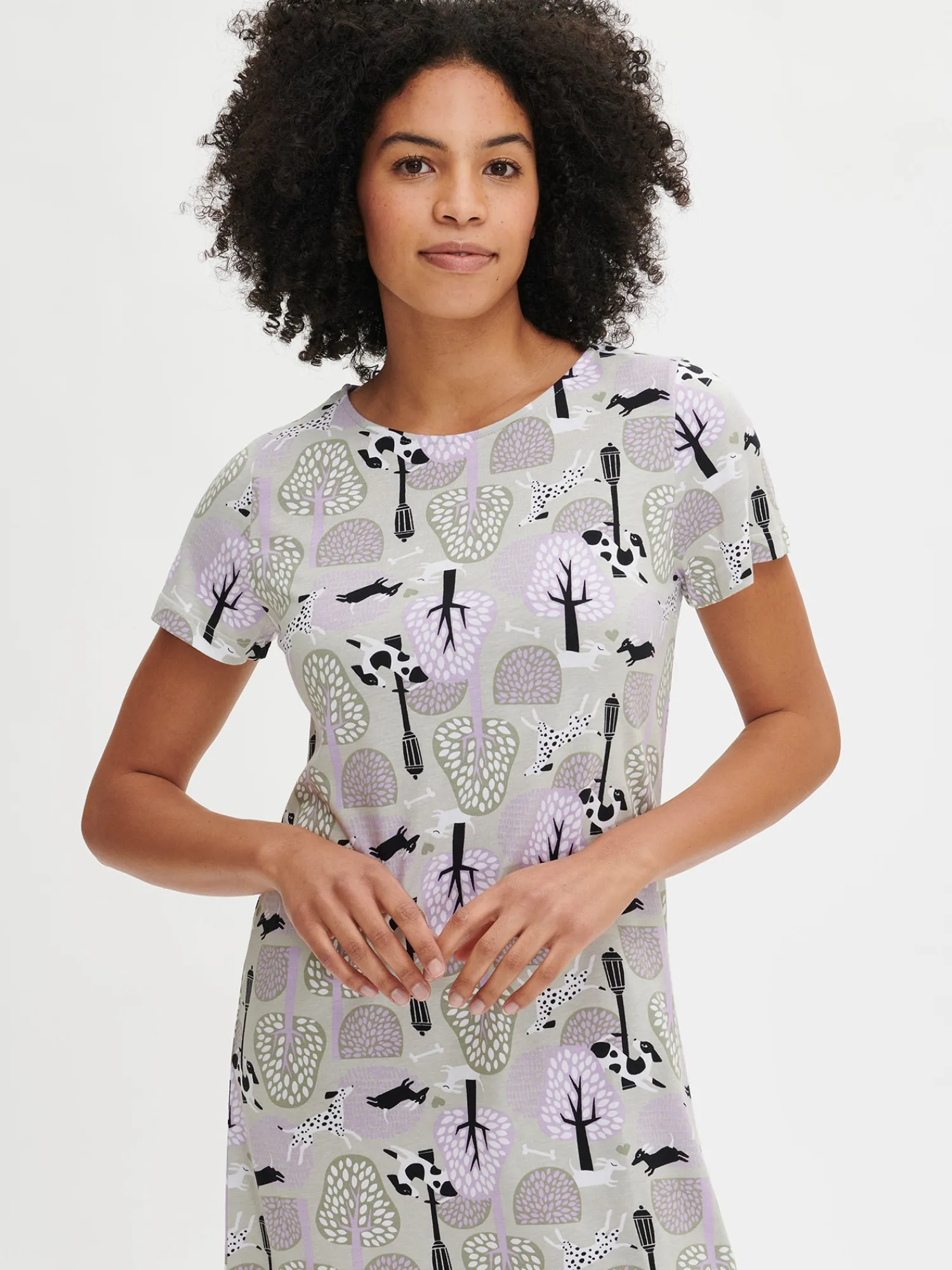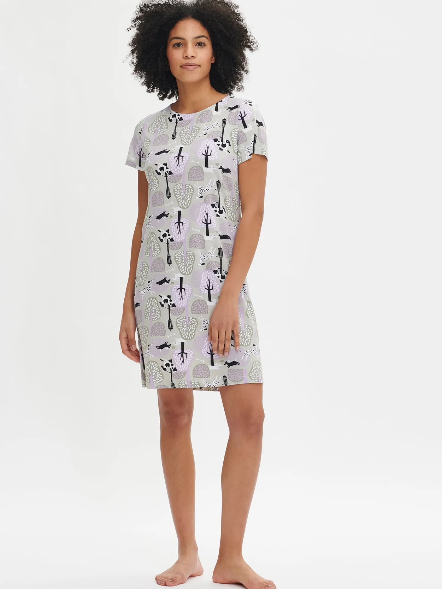 Naisten kuosillinen vihreä Luna-yöpaita lyhyillä hihoilla ja ovaalilla pääntiellä. Yöpaidan pituus koossa M on noin 95 cm. Materiaali on laadukasta, iholla miellyttävän pehmeältä tuntuvaa ja helppohoitoista puuvilla-modaalia, joka pysyy hyvänä pesusta toiseen.