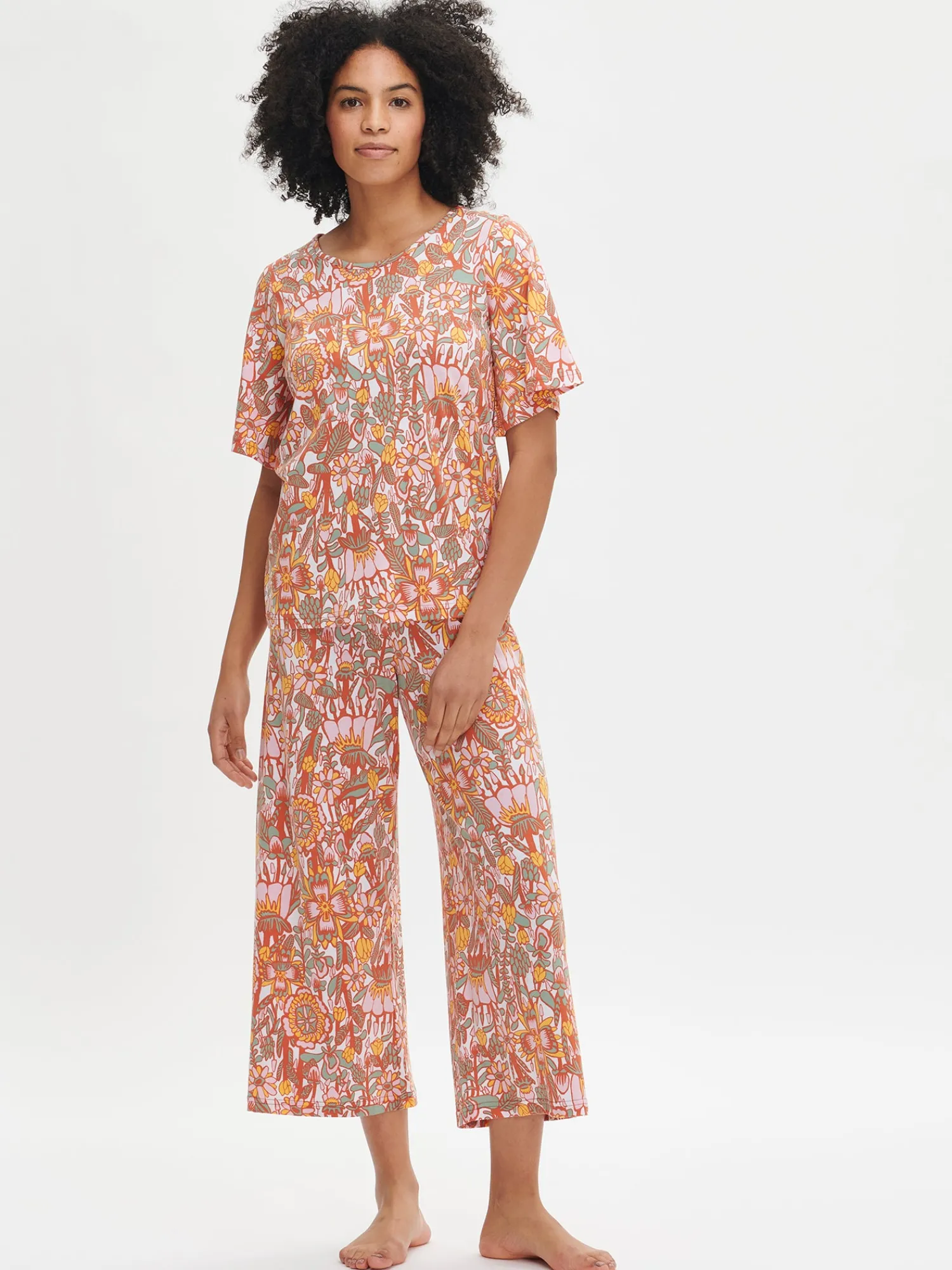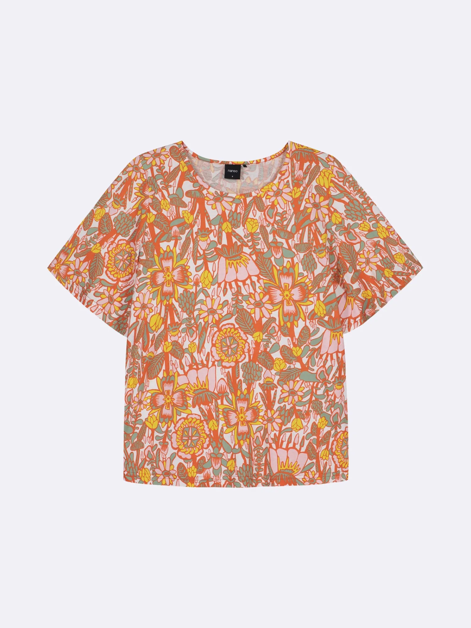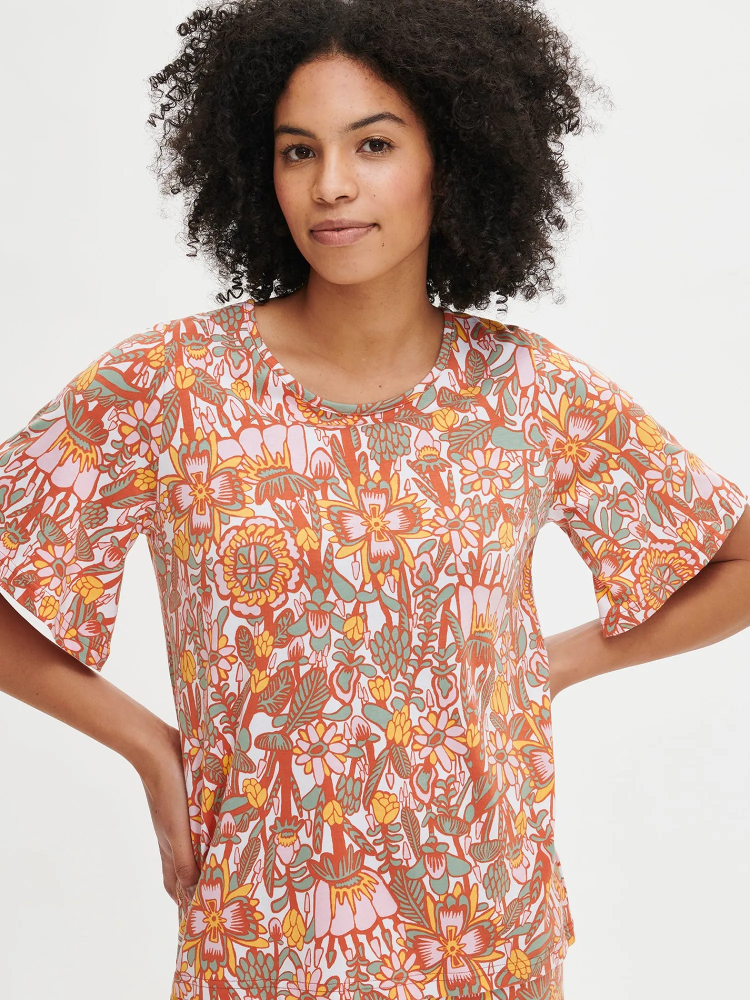 Naisten kuosillinen monivärinen Oodi- t-paita lyhyillä kellotetuilla hihoilla ja pyöreällä pääntiellä. T-paidan pituus koossa M on noin 67 cm. Materiaali on laadukasta, iholla miellyttävän pehmeältä tuntuvaa ja helppohoitoista puuvilla-modaali-neulosta, joka pysyy hyvänä pesusta toiseen. Täydellinen valinta rentoihin päiviin, jolloin mukavuus on tärkeintä.