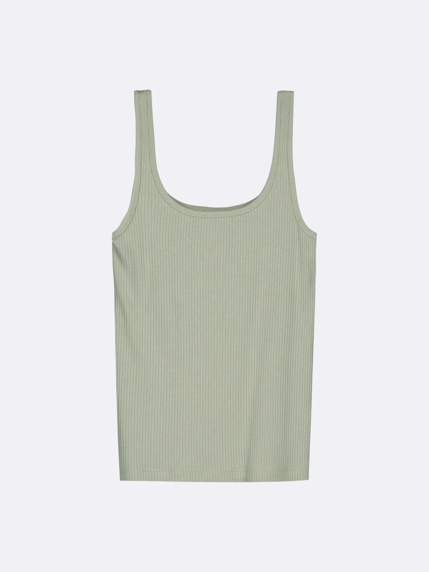Naisten kaunis vihreä Heila-ribbitoppi neliskanttisella pääntiellä. Topin pituus koossa M on noin 60 cm. Materiaali on laadukasta, iholla pehmeän tuntuista bambu-puuvilla-elastaaniribbiä. Tuotteessa käytetty puuvilla on orgaanista.