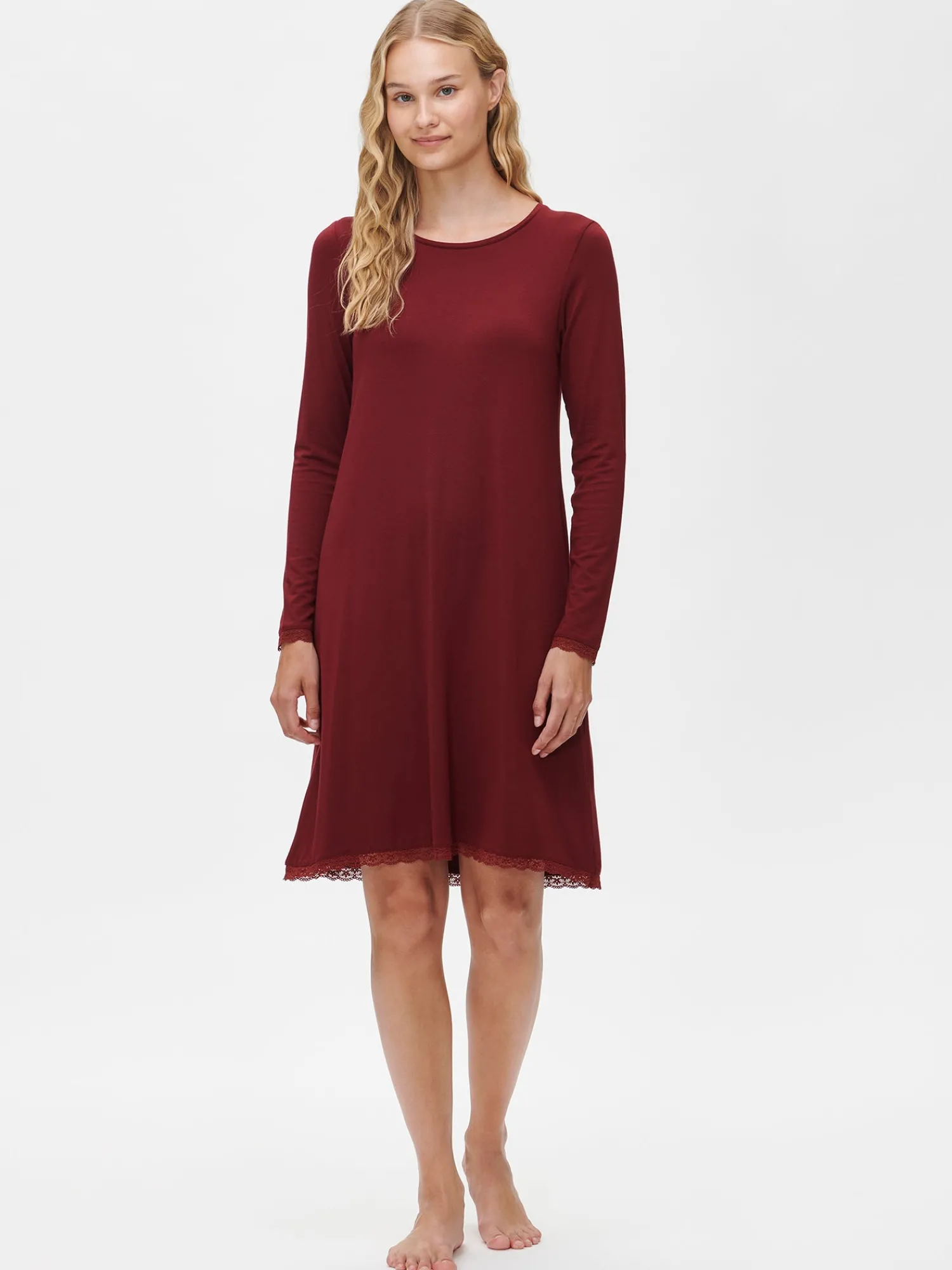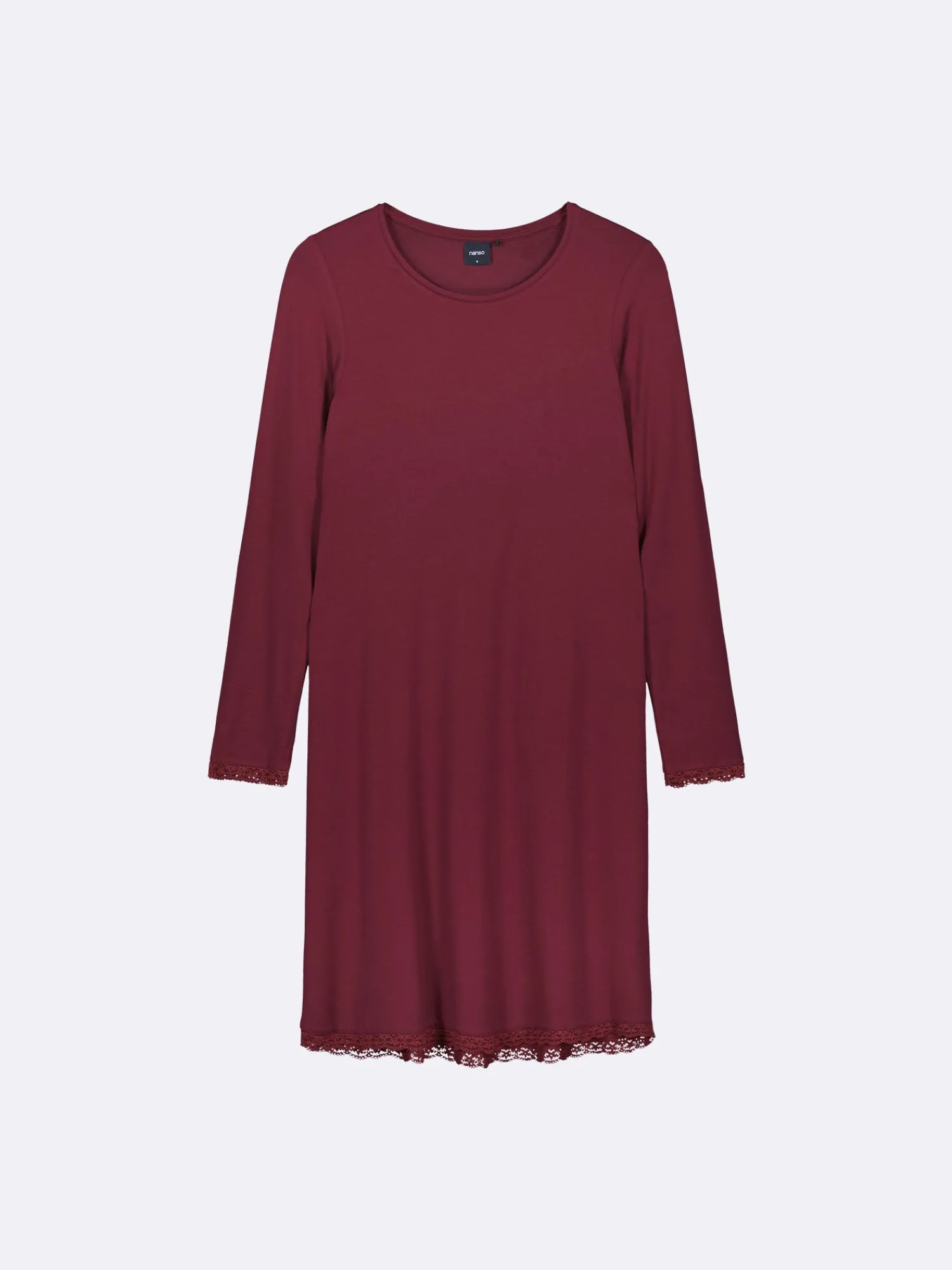 Naisten ylellisen pehmeä viininpunainen Pitsi-yöpaita täyspitkillä hihoilla ja pyöreällä pääntiellä. Hihansuita ja helmaa koristaa ajaton pitsinauha. Yöpaidan pituus koossa M on noin 95 cm. Materiaali on laadukasta, iholla silkkisen pehmeältä tuntuvaa mikromodaali-elastaania.