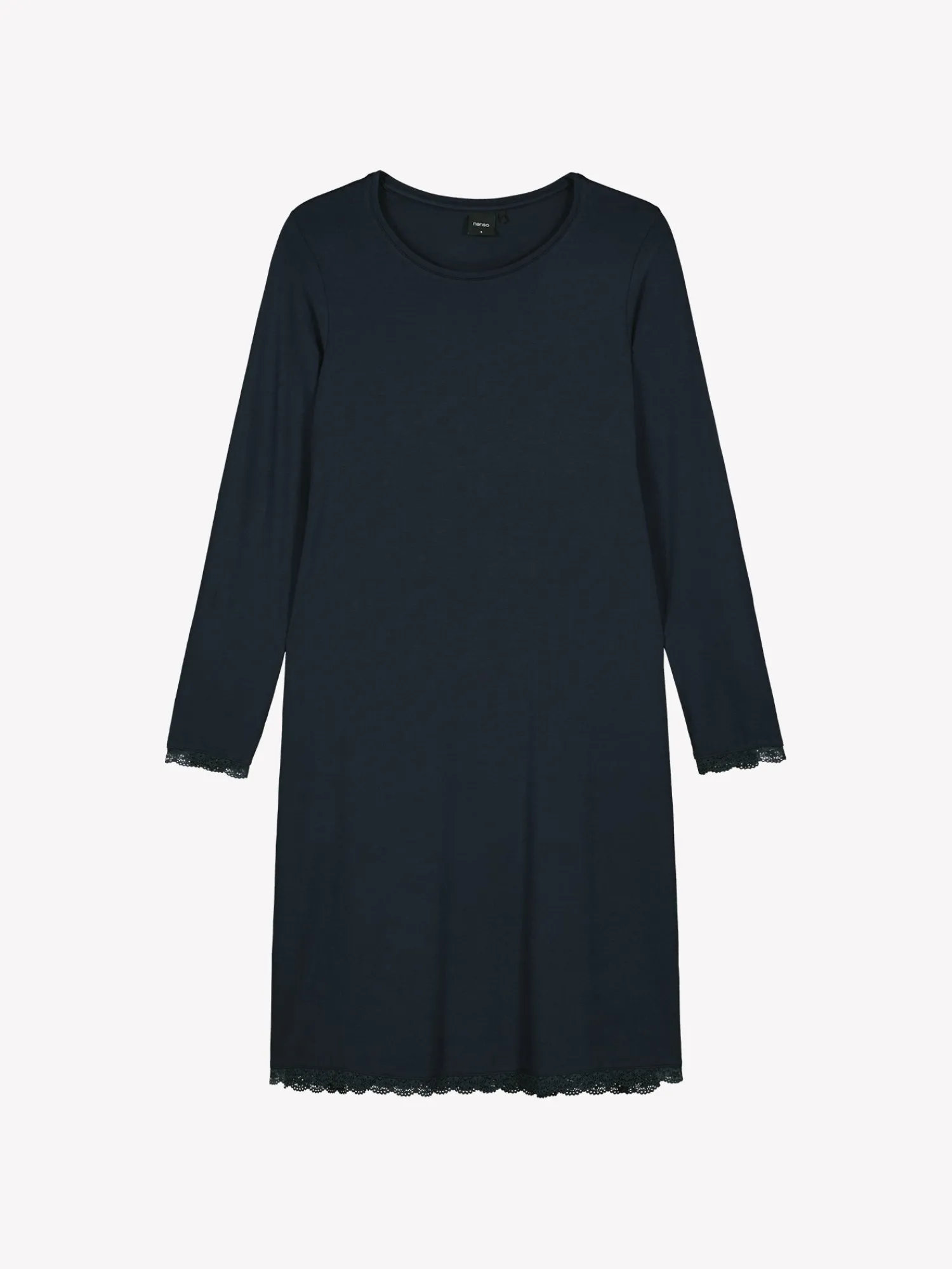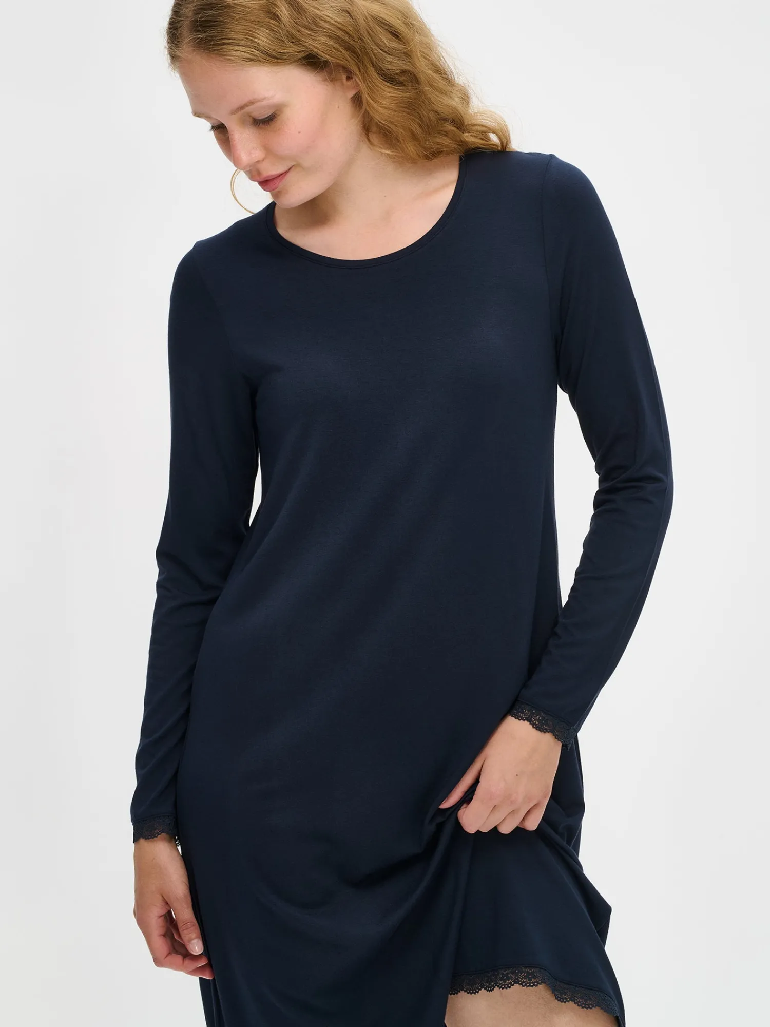 Naisten ylellisen pehmeä Pitsi-yöpaita täyspitkillä hihoilla ja pyöreällä pääntiellä tummansinisessä värissä. Hihansuita ja helmaa koristaa ajaton pitsinauha. Yöpaidan pituus koossa M on noin 95 cm. Materiaali on laadukasta, iholla silkkisen pehmeältä tuntuvaa mikromodaali-elastaania.