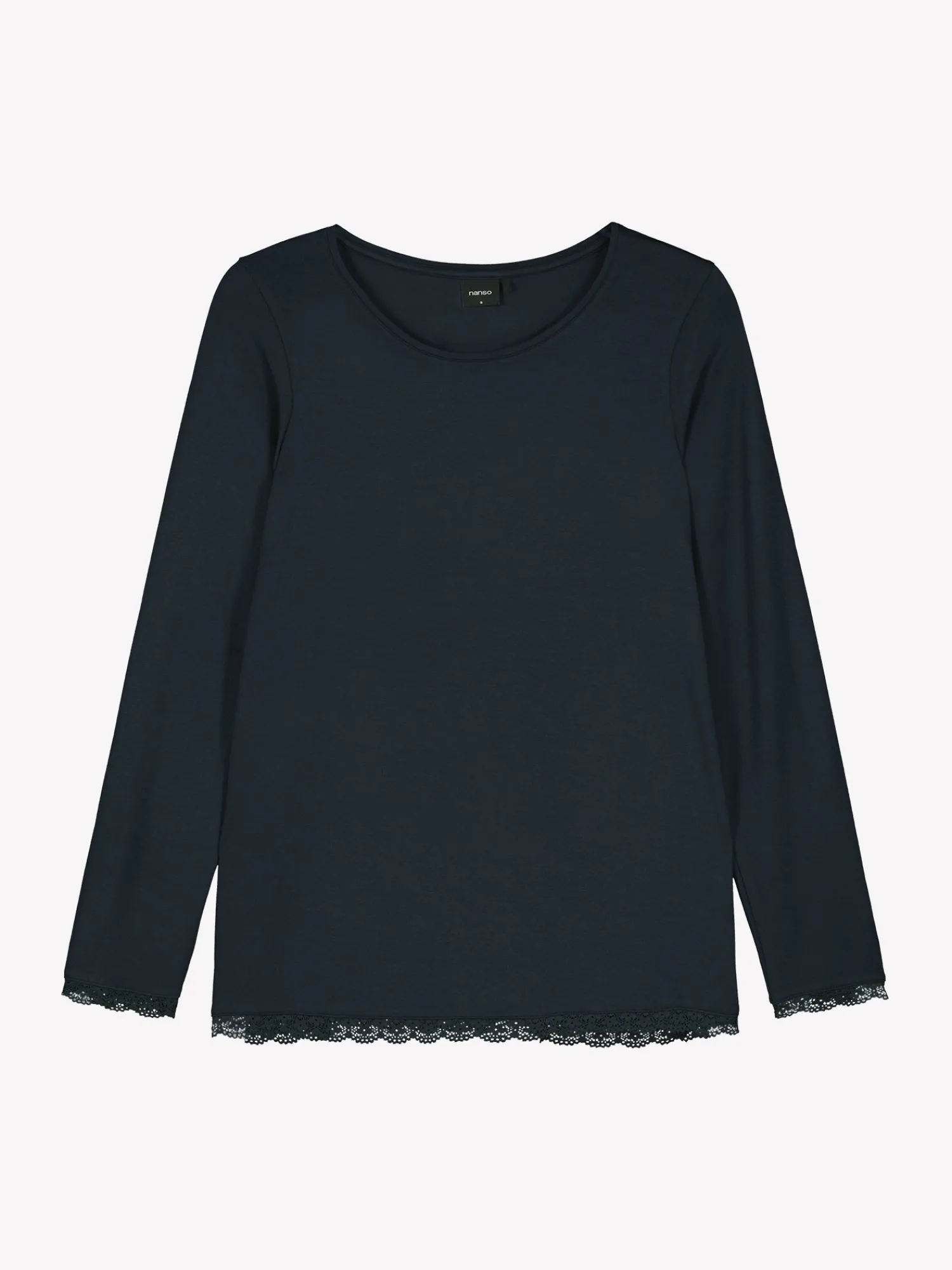 Naisten ylellisen pehmeä Pitsi-pusero täyspitkillä hihoilla ja pyöreällä pääntiellä tummansinisenä. Hihansuita ja helmaa koristaa ajaton pitsinauha. Puseron pituus koossa M on noin 68 cm. Materiaali on laadukasta, iholla silkkisen pehmeältä tuntuvaa mikromodaali-elastaania.