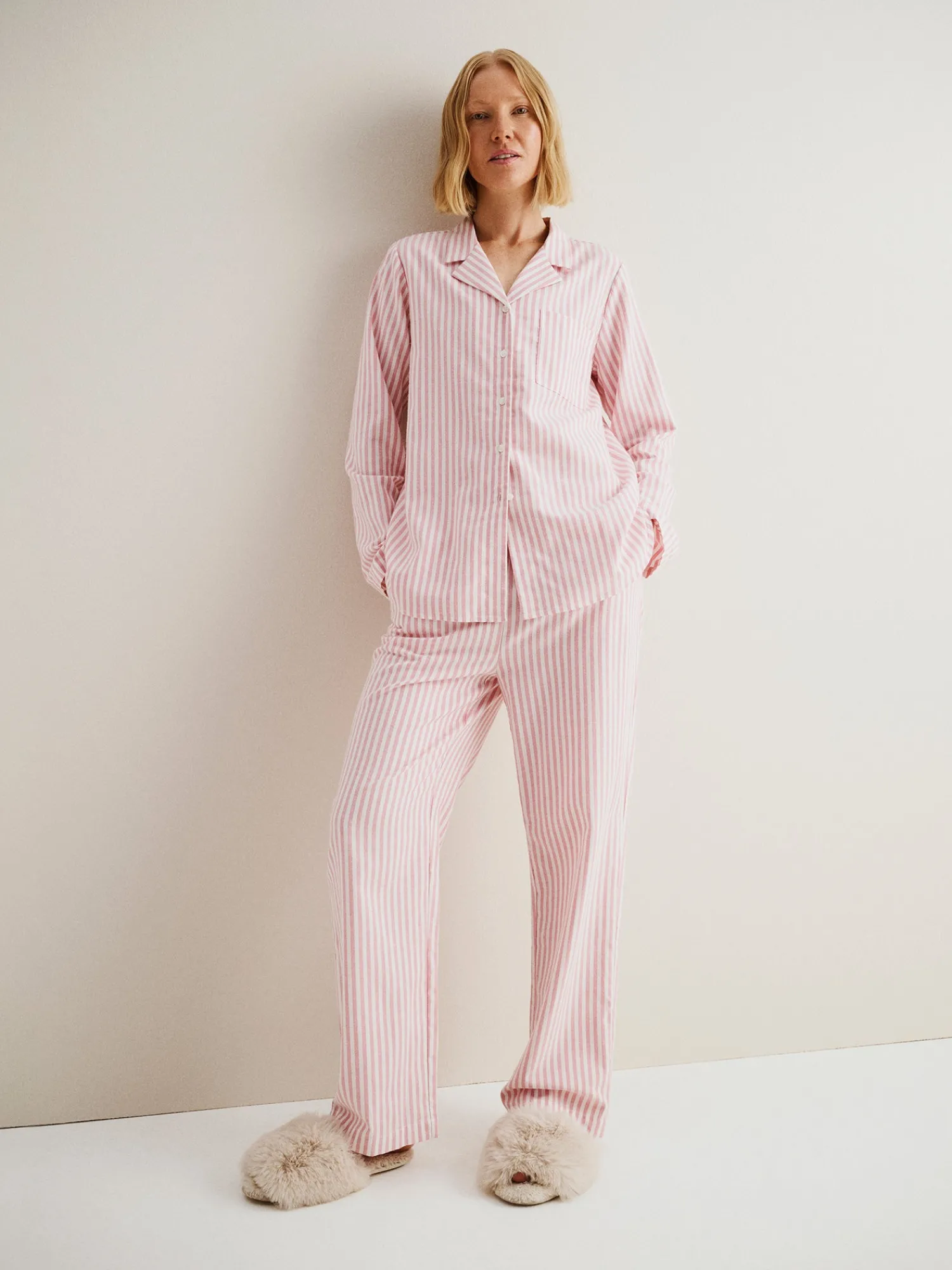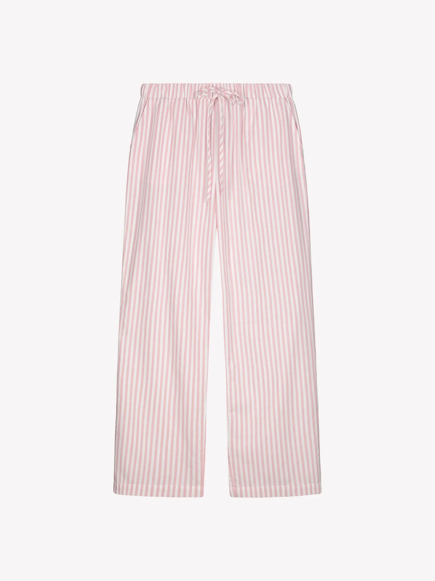 Naisten raidallinen Polka-pyjamahousut vaaleanpunaisessa värissä sivutaskuilla. Vyötäröllä on mukava ja siisti kuminauharakenne ja nyörit. Housut ovat täyspitkät, sisälahkeen pituus on koossa M noin 74 cm. Materiaali on pehmeää ja miellyttävän tuntuista puuvillaflanellikangasta. Materiaalille on ominaista 3-5% kutistuminen ensimmäisessä pesussa.