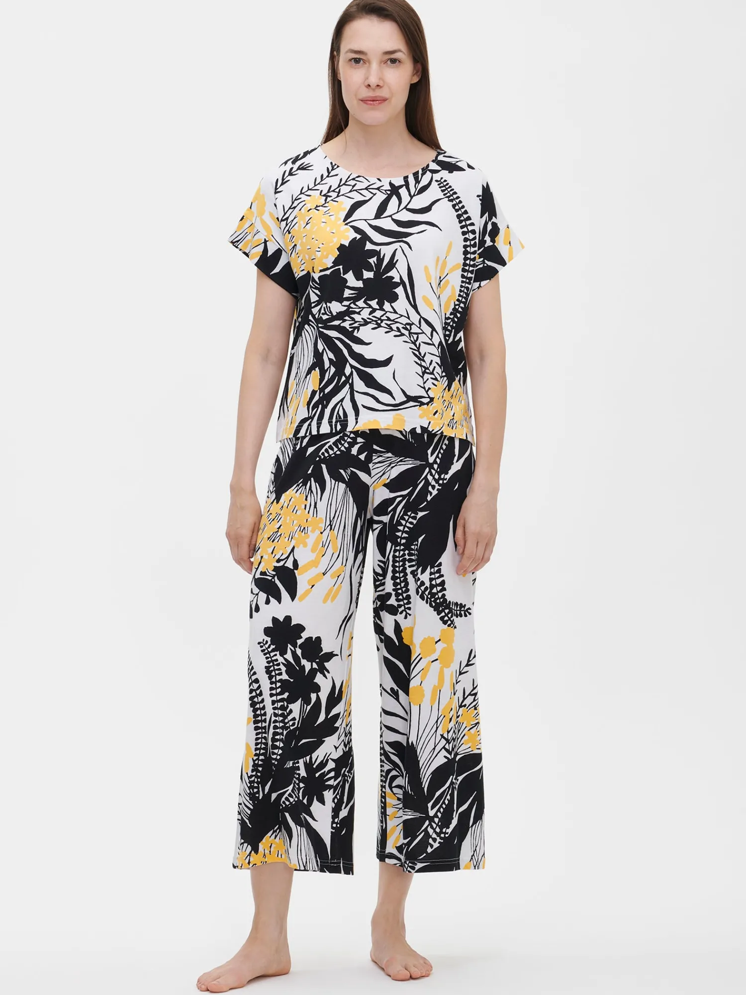 Naisten kuosilliset keltaiset Puutarha-lounge-housut. Rennot, leveälahkeiset housut ovat tyylikkäästi 7/8-pituiset. Materiaali on laadukasta, iholla miellyttävän pehmeältä tuntuvaa ja helppohoitoista puuvilla-modaalia, joka pysyy hyvänä pesusta toiseen. Ihastuttava kuosi ja leveät lahkeet tekevät näistä housuista täydellisen valinnan rentoihin hetkiin kotona.