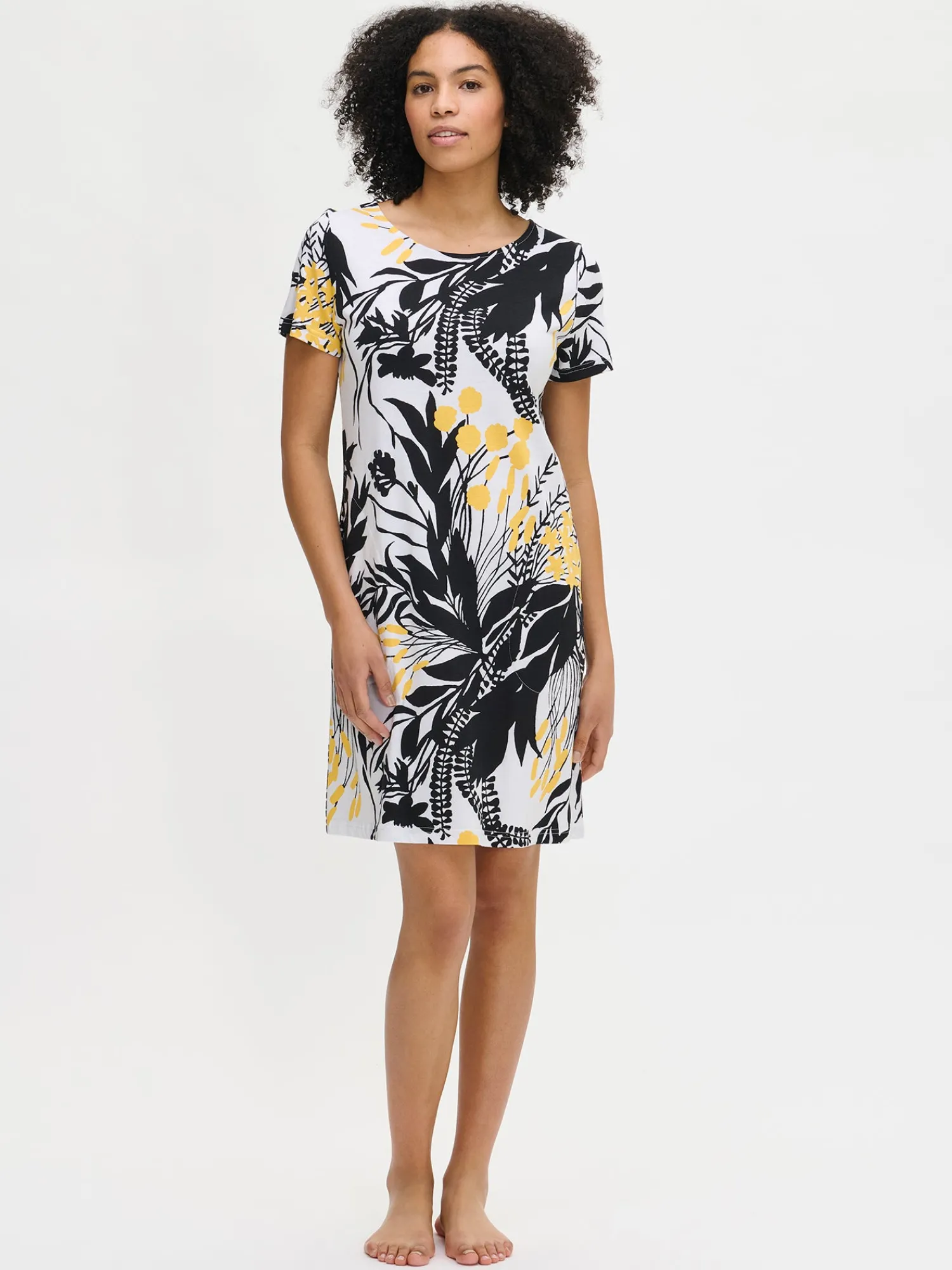 Naisten kuosillinen keltainen Puutarha-yöpaita lyhyillä hihoilla, sivutaskuilla ja ovaalilla pääntiellä. Yöpaidan pituus koossa M on noin 95 cm. Materiaali on laadukasta, iholla miellyttävän pehmeältä tuntuvaa ja helppohoitoista puuvilla-modaalia, joka pysyy hyvänä pesusta toiseen. Tämä kaunis kuosi tuo raikkautta ja tyyliä jokaiseen yöhön, täydellinen valinta rentoihin ja huolettomiin hetkiin kotona.
