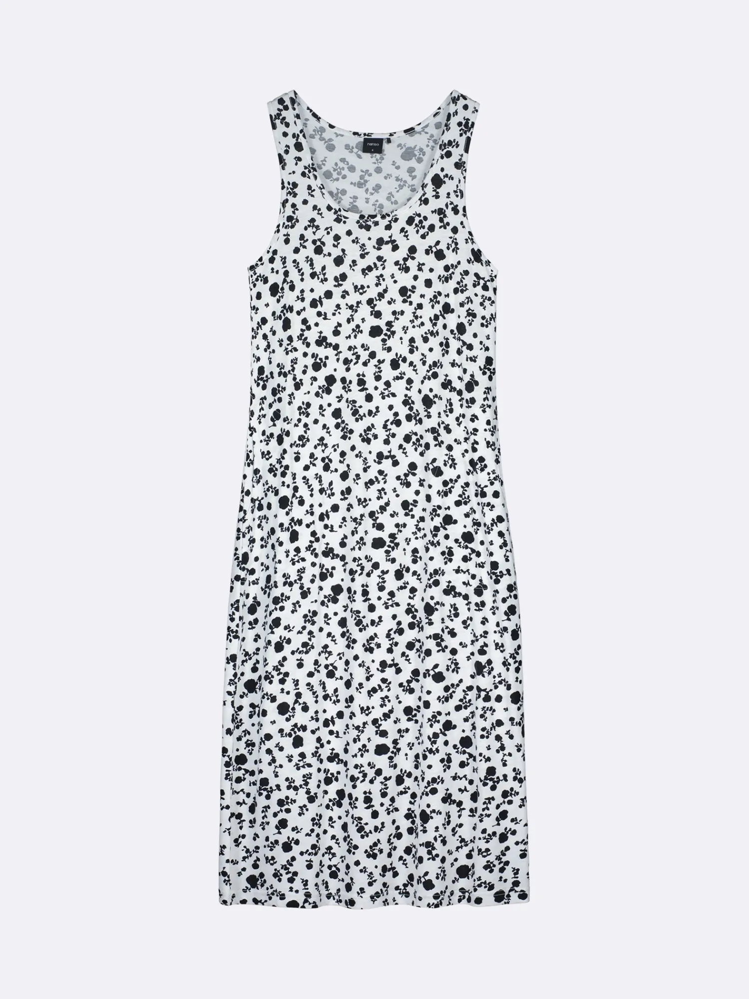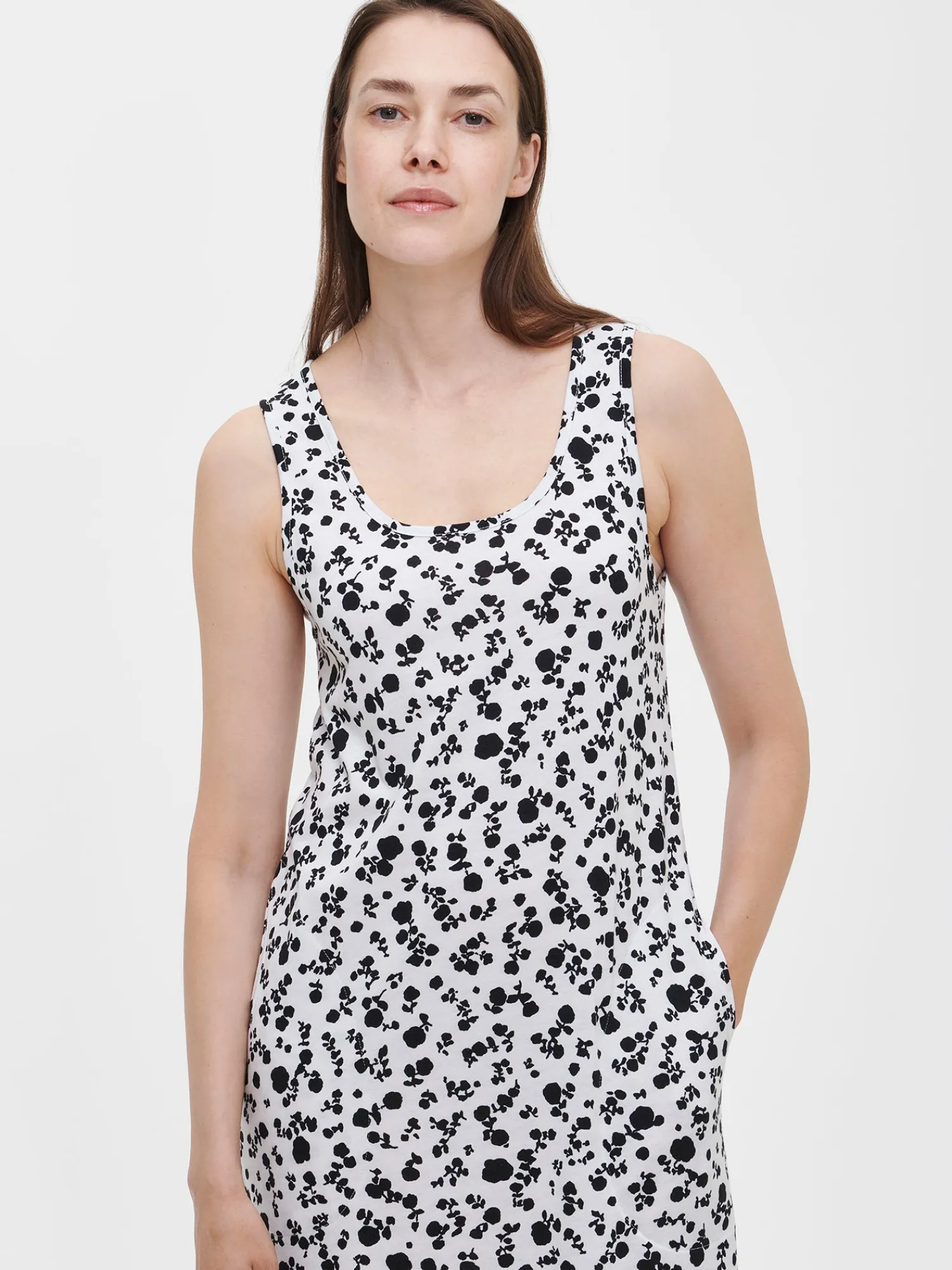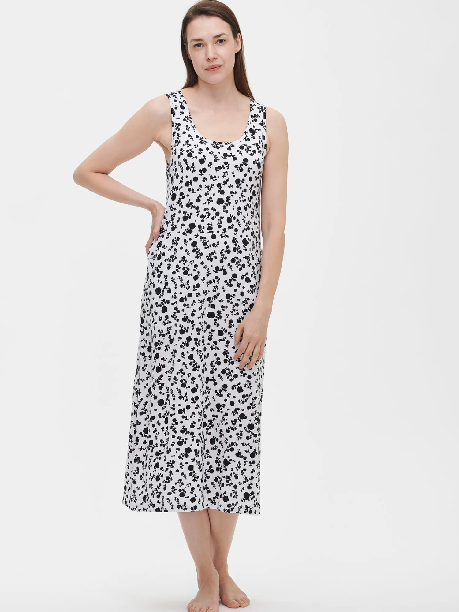 Naisten kuosillinen mustavalkoinen pitkä Roosa-yöpaita pyöreällä pääntiellä ja sivutaskuilla. Pääntie ja kädentiet on viimeistelty kantilla. Hihattoman yöpaidan pituus koossa M on noin 120 cm. Materiaali on laadukasta, iholla miellyttävän pehmeältä tuntuvaa ja helppohoitoista puuvilla-modaalia, joka pysyy hyvänä pesusta toiseen. Ihastuttava kuosi ja käytännölliset taskut tekevät tästä yöpaidasta täydellisen valinnan rentoihin hetkiin.