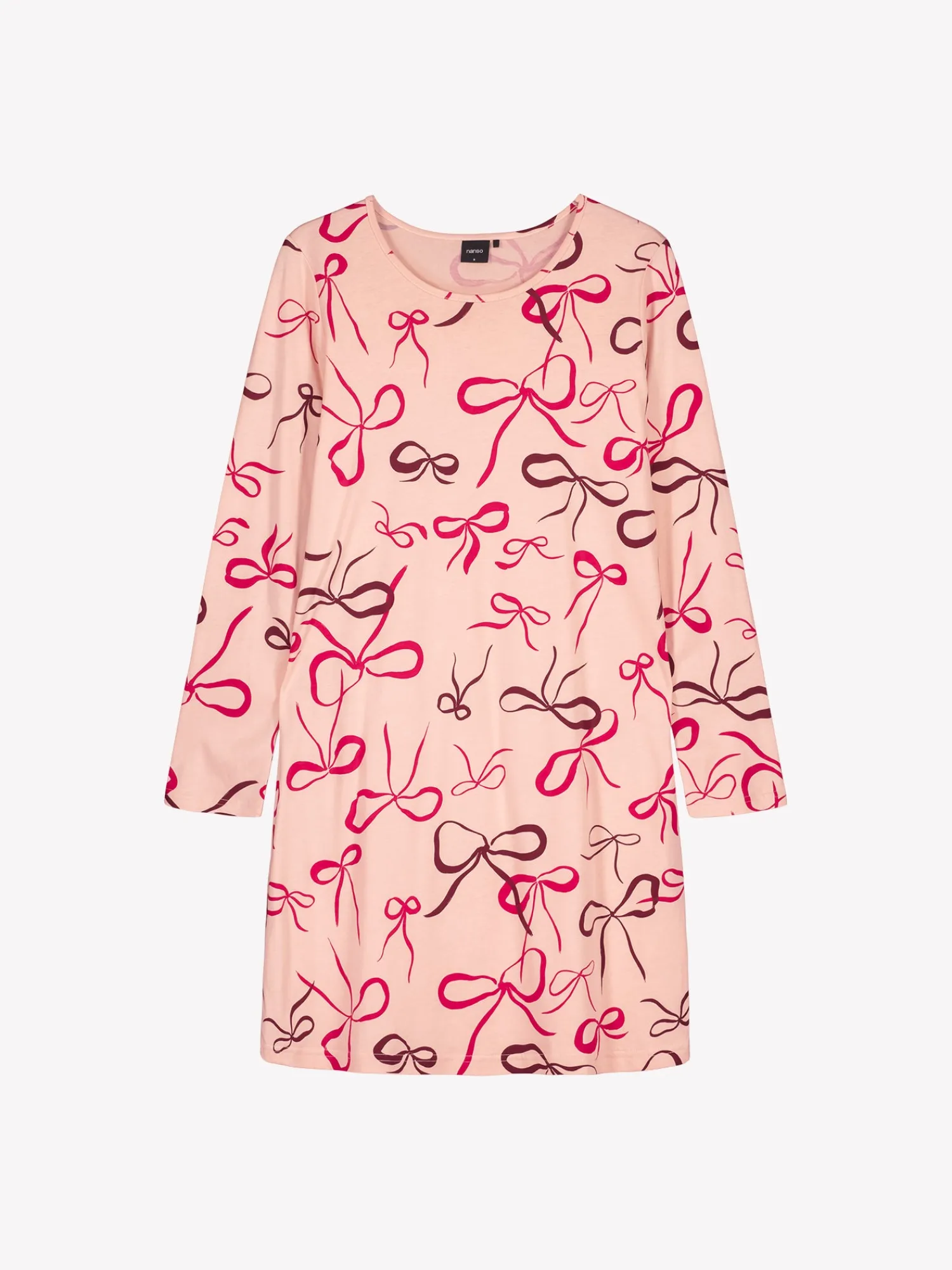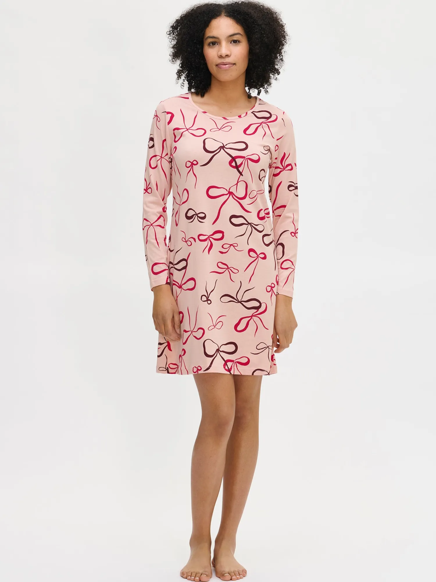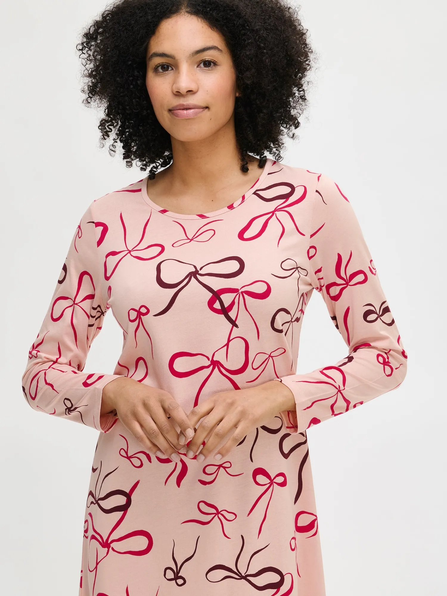 Naisten kuosillinen Rusetti-yöpaita pitkillä hihoilla ja pyöreällä pääntiellä. Yöpaidan pituus koossa M on noin 95 cm. Materiaali on laadukasta, iholla miellyttävän pehmeältä tuntuvaa ja helppohoitoista puuvilla-modaalia, joka pysyy hyvänä pesusta toiseen.