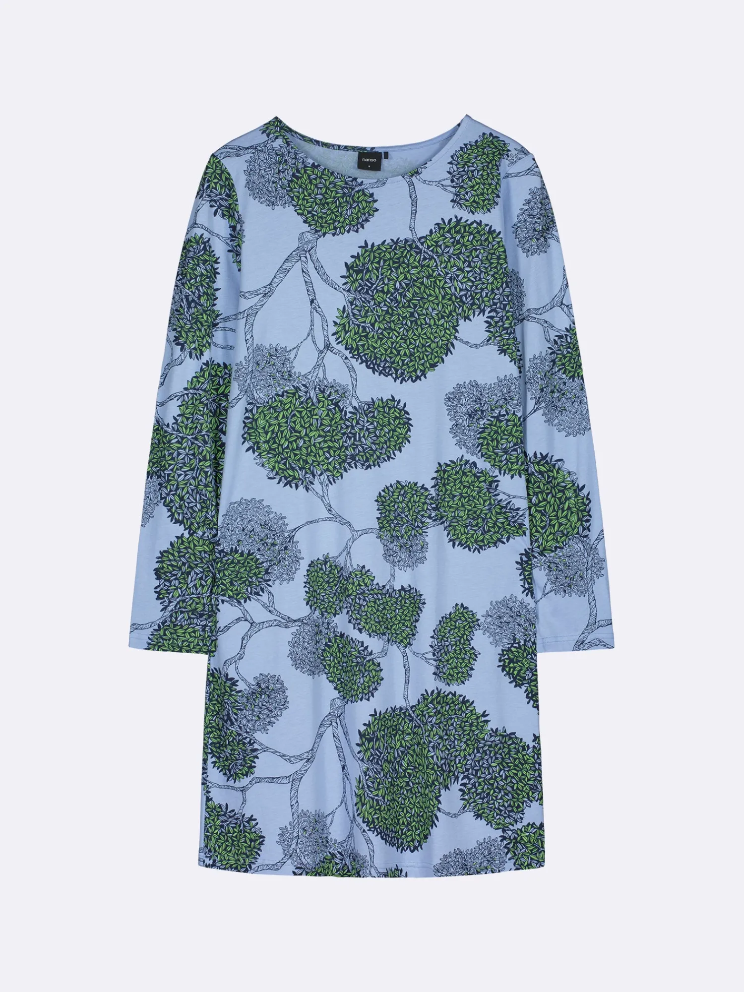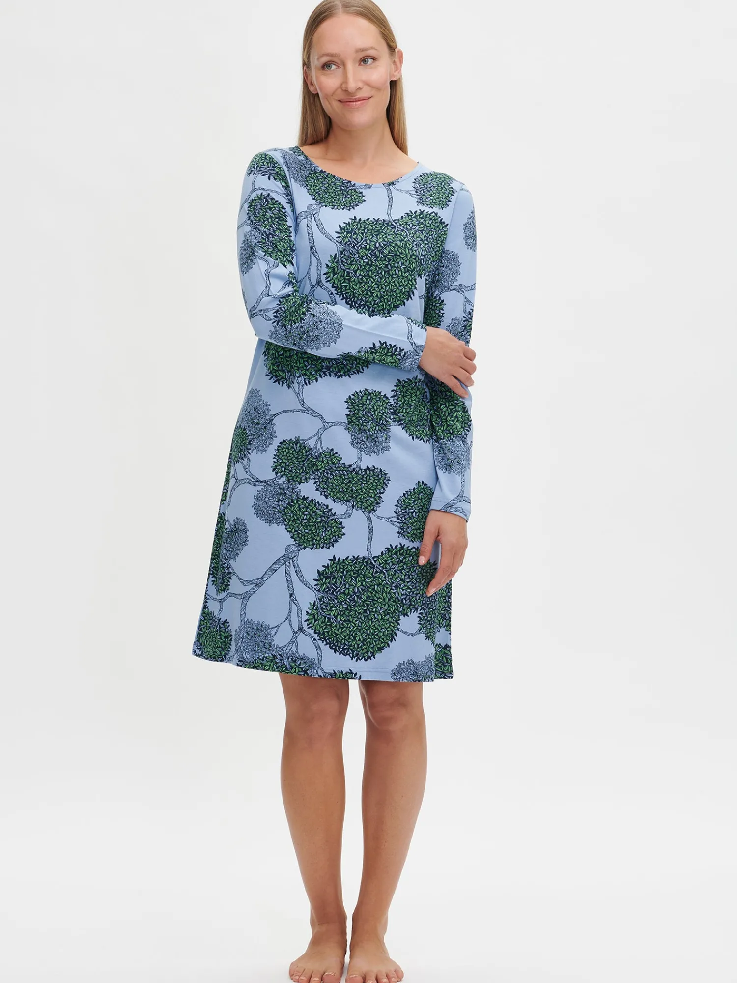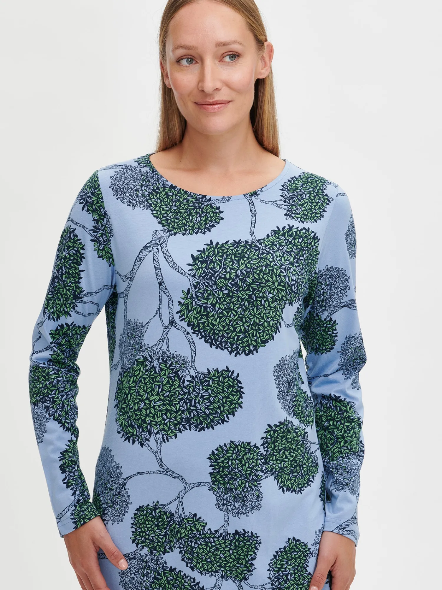 Naisten kuosillinen sininen Tuomi-yöpaita pitkillä hihoilla ja ovaalilla pääntiellä. Yöpaidan pituus koossa M on noin 95 cm. Materiaali on laadukasta, iholla miellyttävän pehmeältä tuntuvaa ja helppohoitoista puuvilla-modaalia, joka pysyy hyvänä pesusta toiseen.