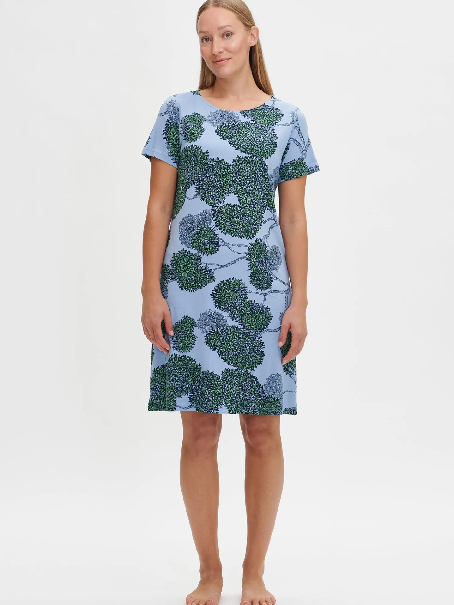 Naisten kuosillinen sininen Tuomi-yöpaita lyhyillä hihoilla ja ovaalilla pääntiellä. Yöpaidan pituus koossa M on noin 95 cm. Materiaali on laadukasta, iholla miellyttävän pehmeältä tuntuvaa ja helppohoitoista puuvilla-modaalia, joka pysyy hyvänä pesusta toiseen.